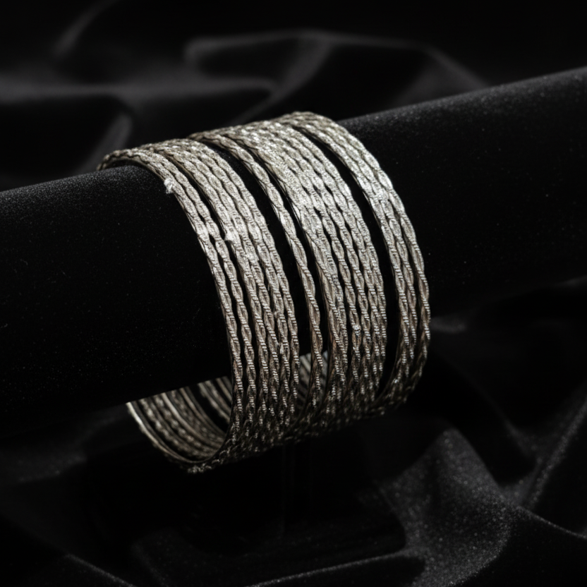 Elevate your traditional look with our luxurious silver-plated, 100% handmade chooriyan. Each bangle is intricately textured, giving it a stunning shimmer that's perfect for festive wear, weddings, and elegant everyday styling.