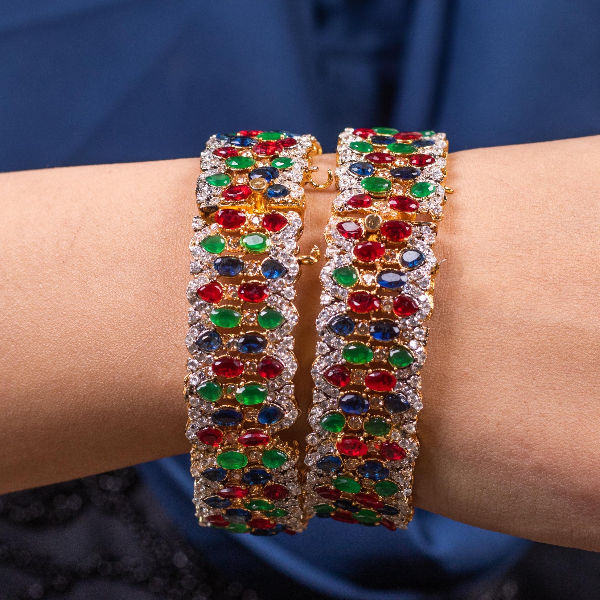 Experience the grandeur of tradition with our Zareen Heritage Bangles-Multicolor, exquisitely crafted to add a royal touch to your jewelry collection. These handmade openable bangles feature intricate Meenakari and Navratan work, beautifully adorned with vibrant stones. The delicate paisley motifs and fine detailing reflect the timeless charm of heritage craftsmanship.