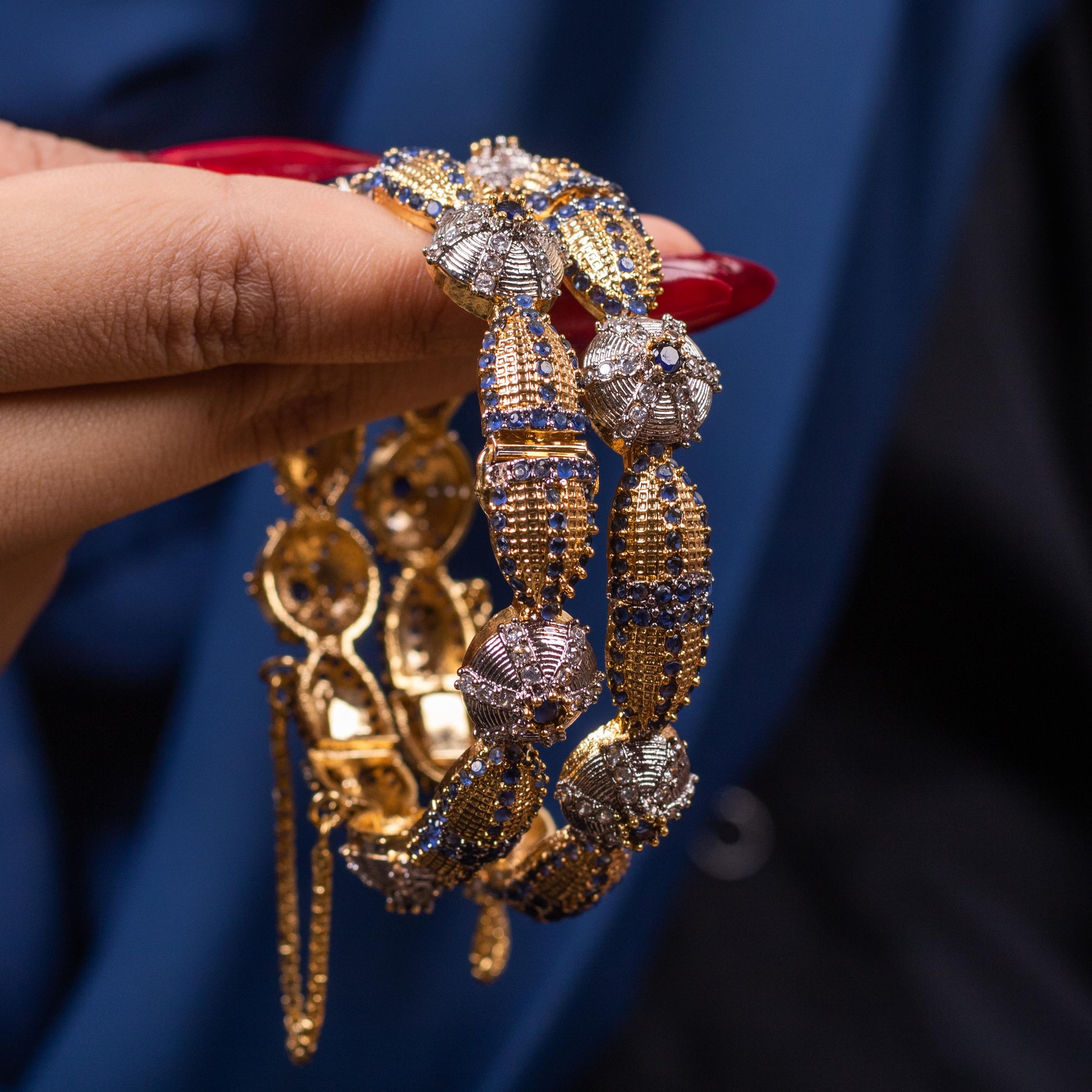 Experience the grandeur of tradition with our Aurora Glow Bangle Blue, exquisitely crafted to add a royal touch to your jewelry collection. These handmade openable bangles feature intricate Meenakari and Navratan work, beautifully adorned with vibrant stones. The delicate paisley motifs and fine detailing reflect the timeless charm of heritage craftsmanship.