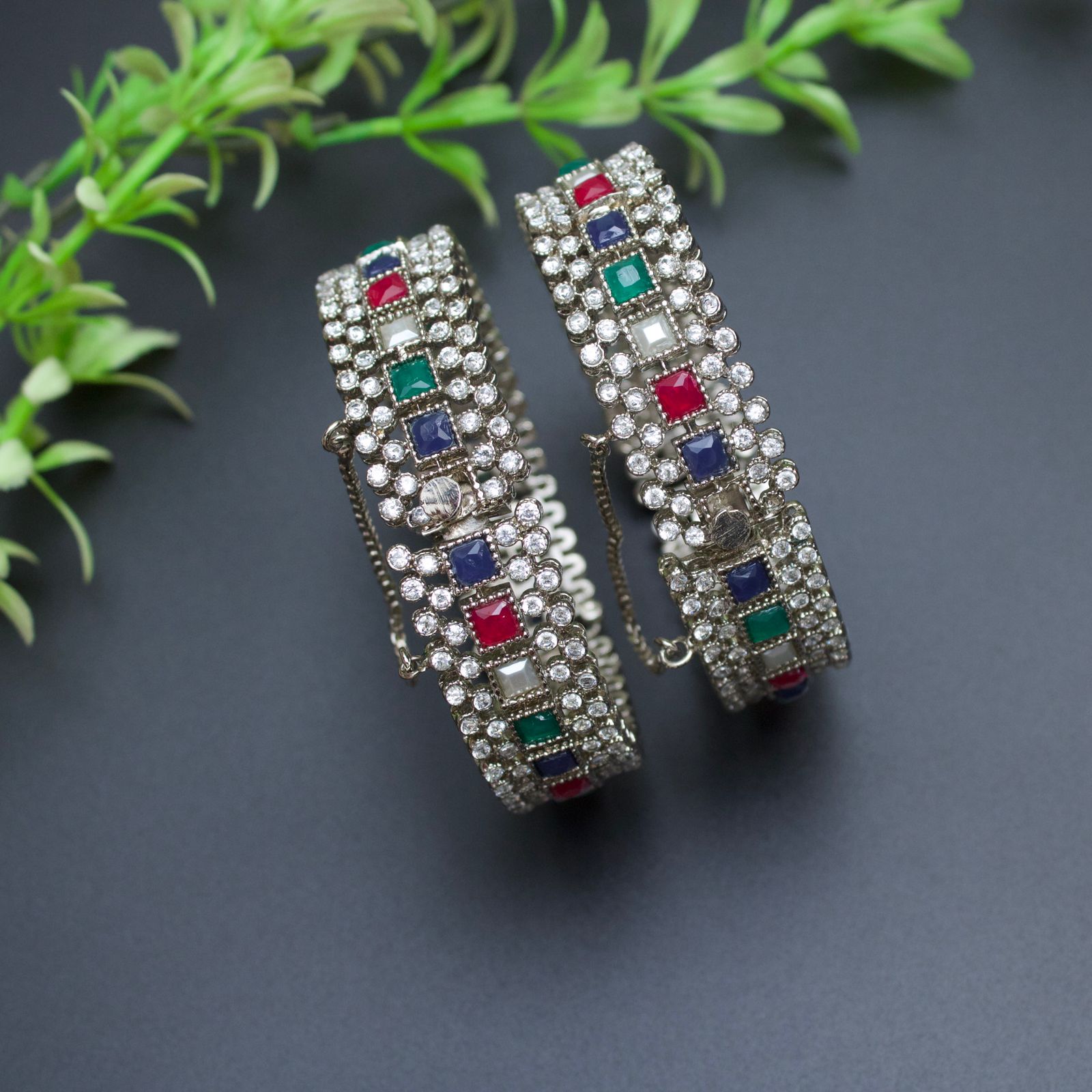 These stunning bangles are a true testament to elegance and craftsmanship. Adorned with vibrant semi-precious stones like turquoise, emerald, ruby, and sapphire, all set in a luxurious gold-plated frame, this piece offers an opulent touch to your collection.