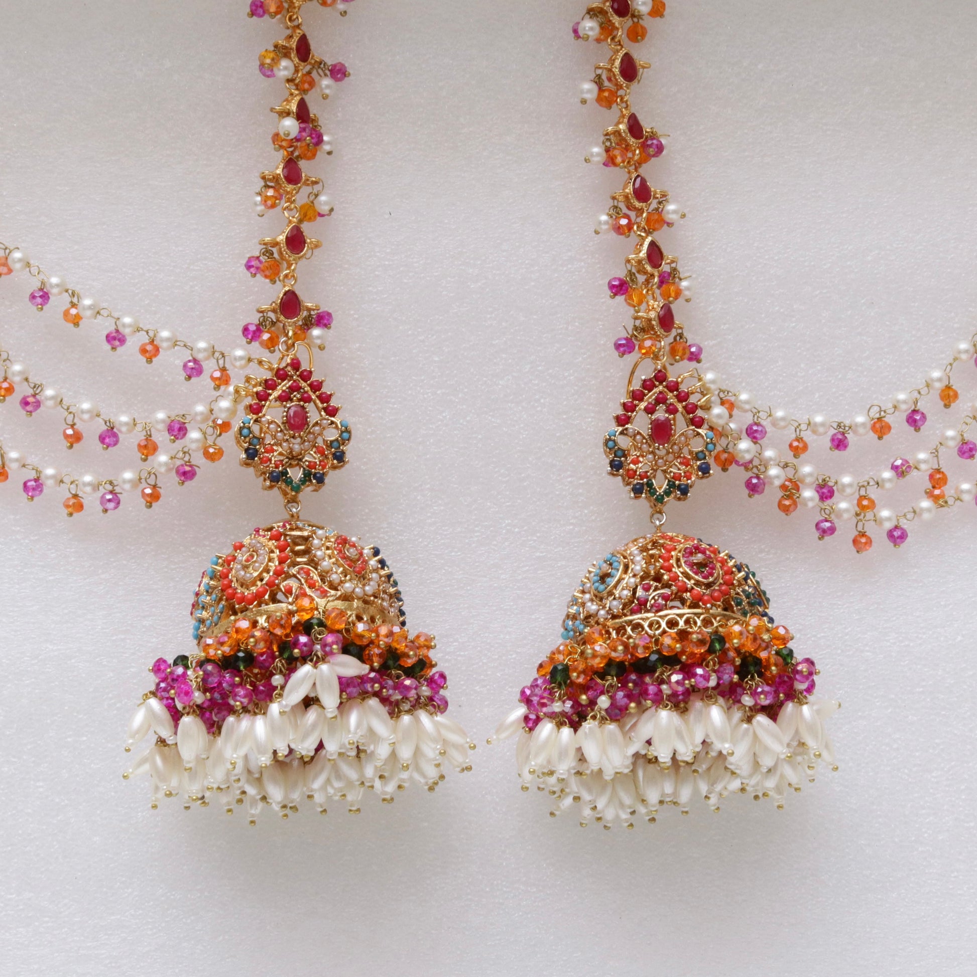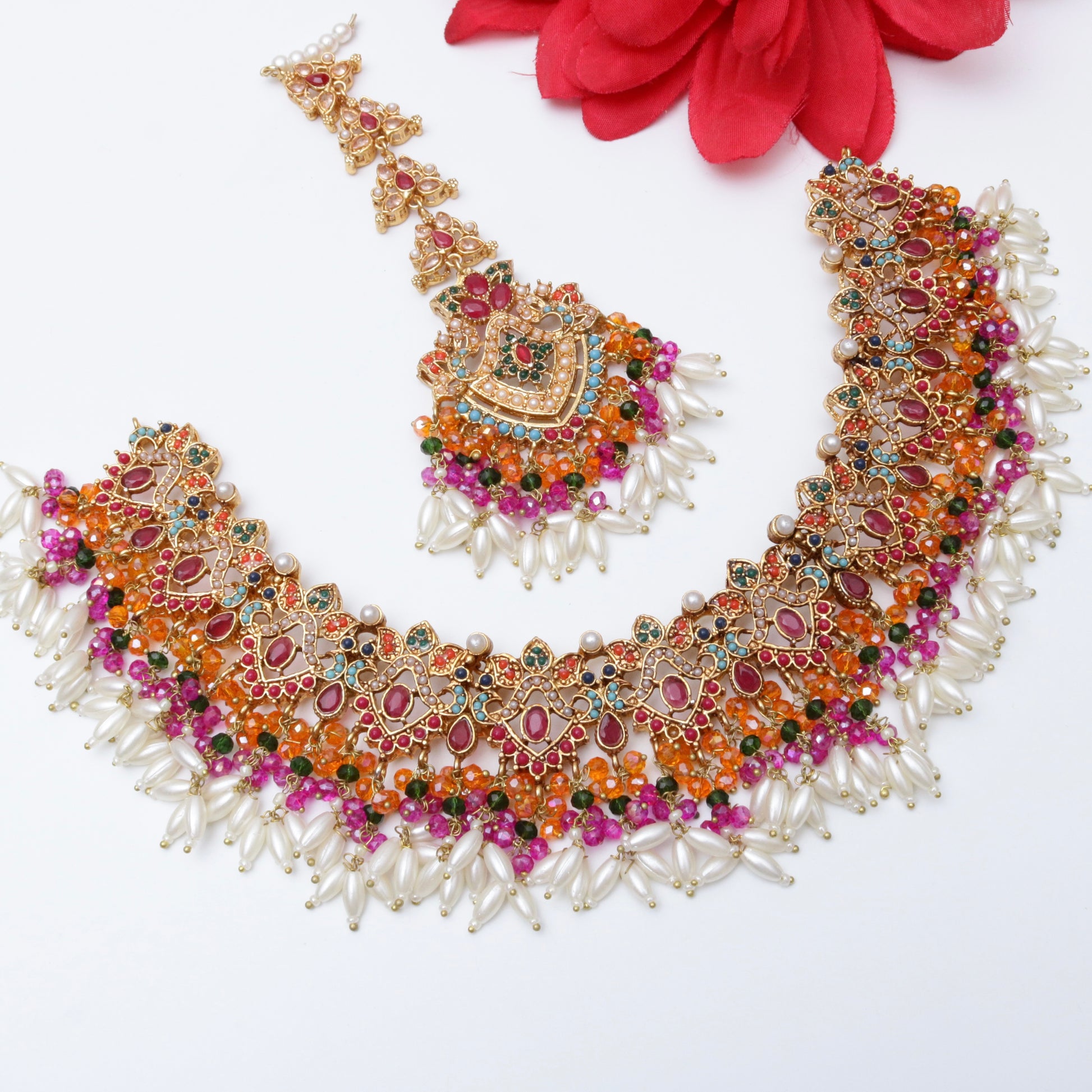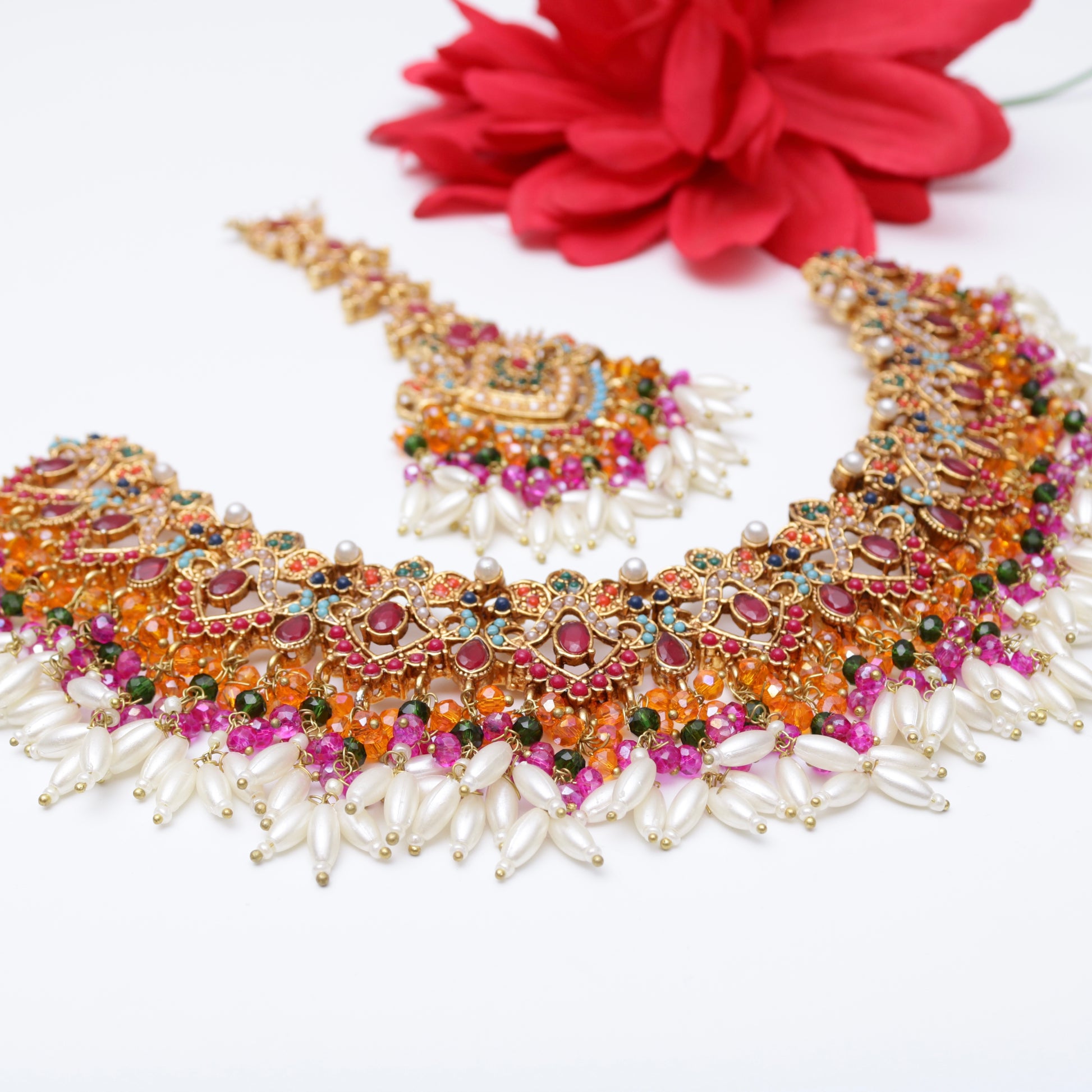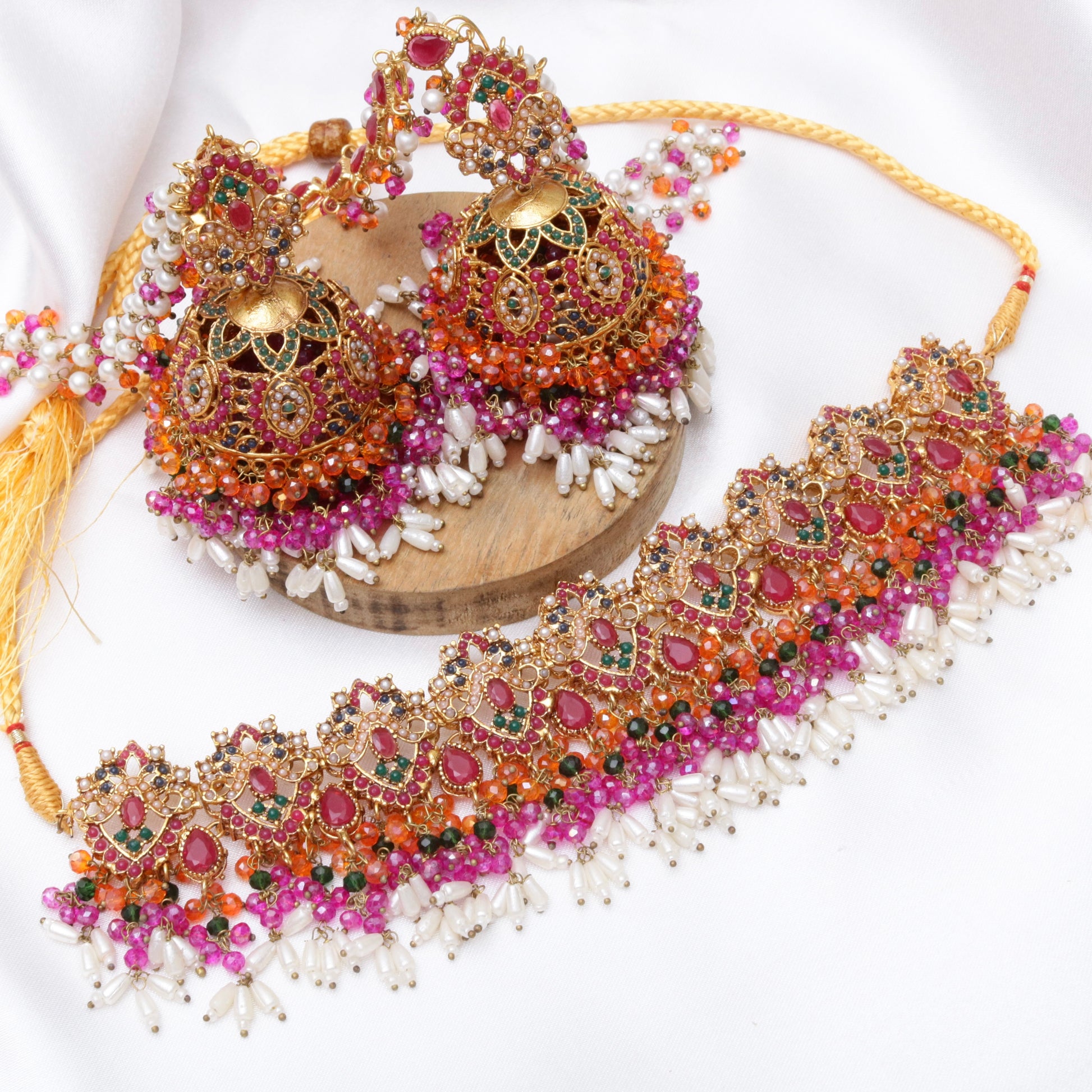 The choker dazzles with a rich arrangement of ruby red stones, vibrant orange and magenta beads, and lustrous pearl hangings, creating a luxurious and eye-catching design. The accompanying sahara earrings are approximately 4 inches long and are designed with delicate side chains for added support and drama, making them perfect for brides or formal occasions.