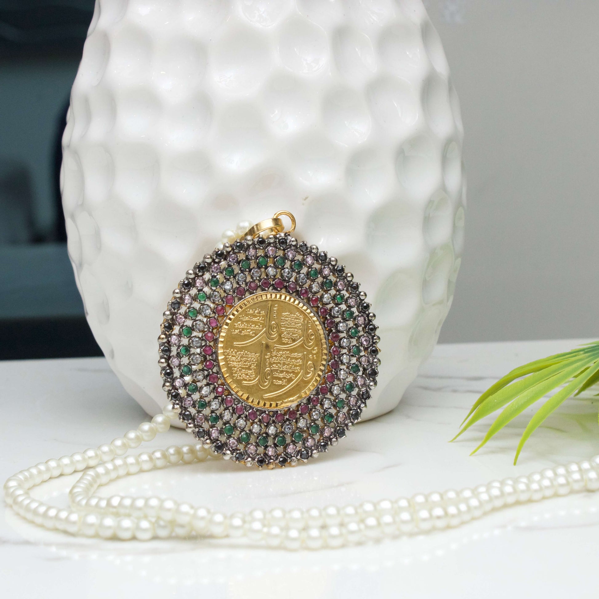 Design: Round gold-plated pendant engraved with the complete 4 Qul Surahs in elegant Arabic calligraphy.