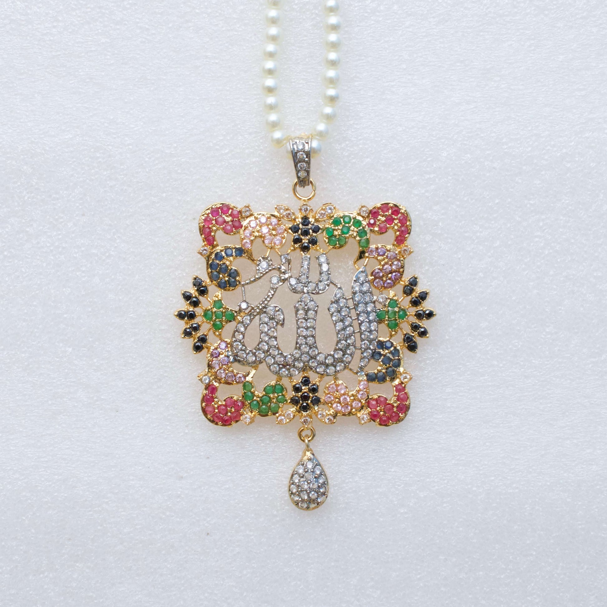 Design: Elegant circular pendant featuring the sacred name of Allah (الله) in bold calligraphy.