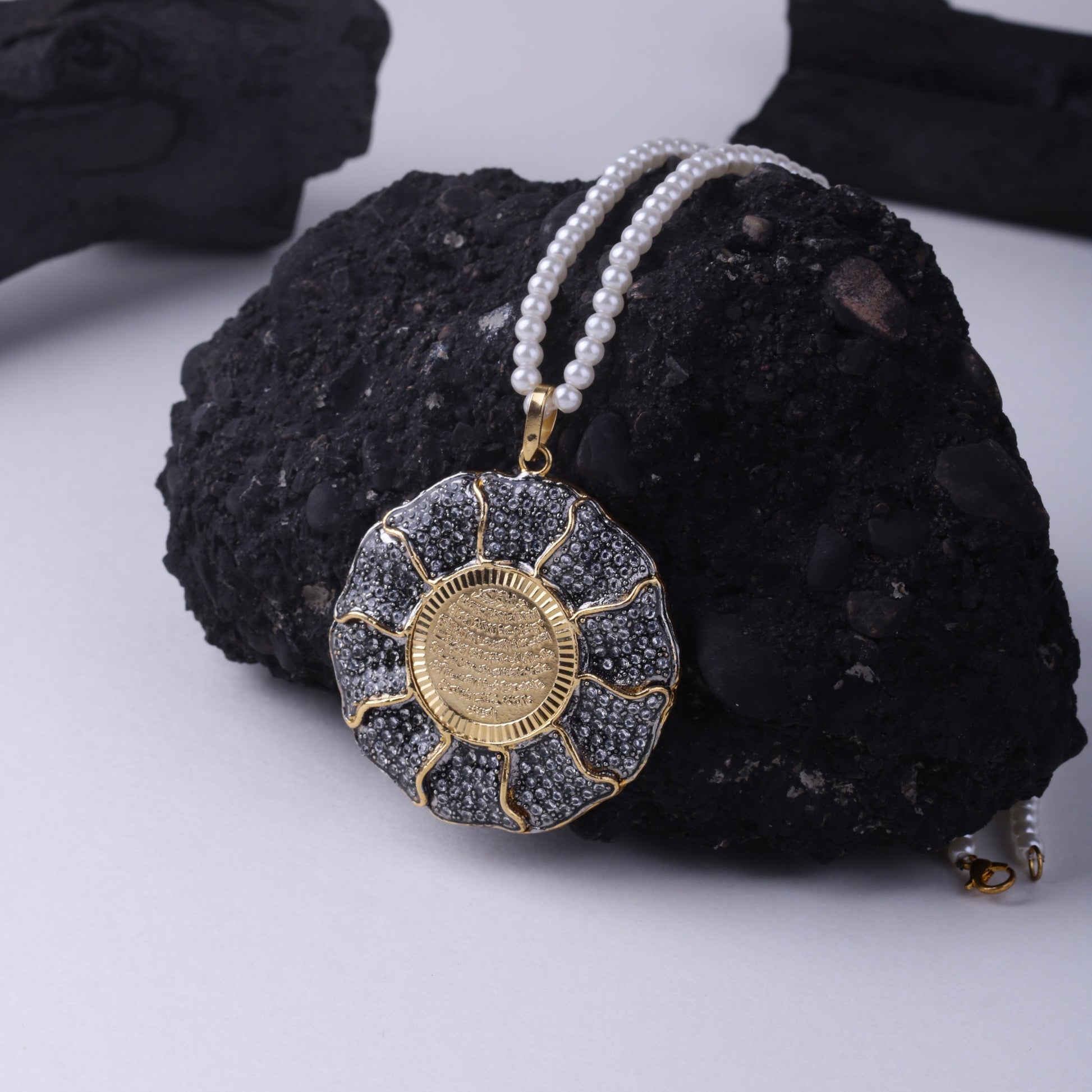 • Design: Round gold-plated pendant engraved with the complete 4 Qul Surahs in elegant Arabic calligraphy.