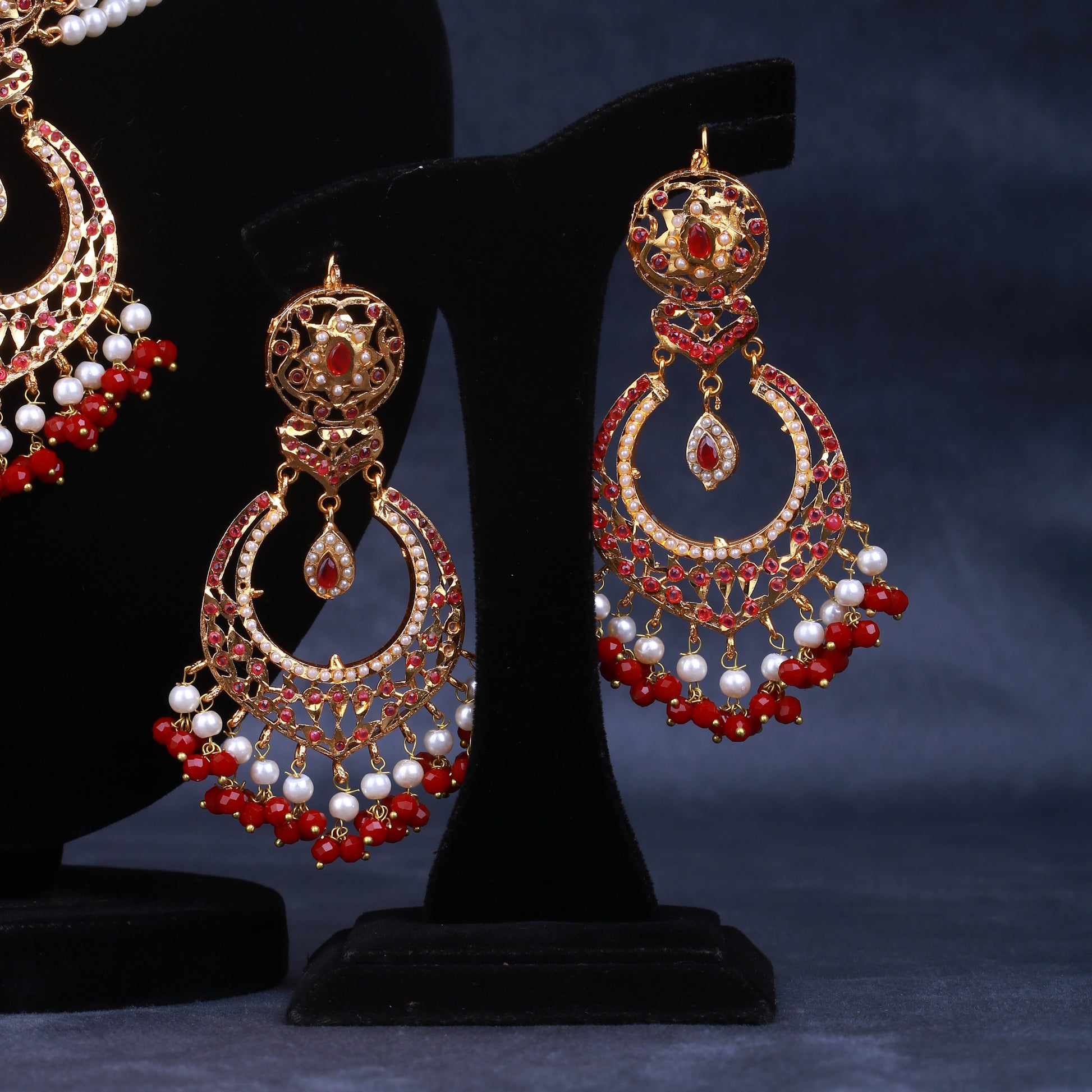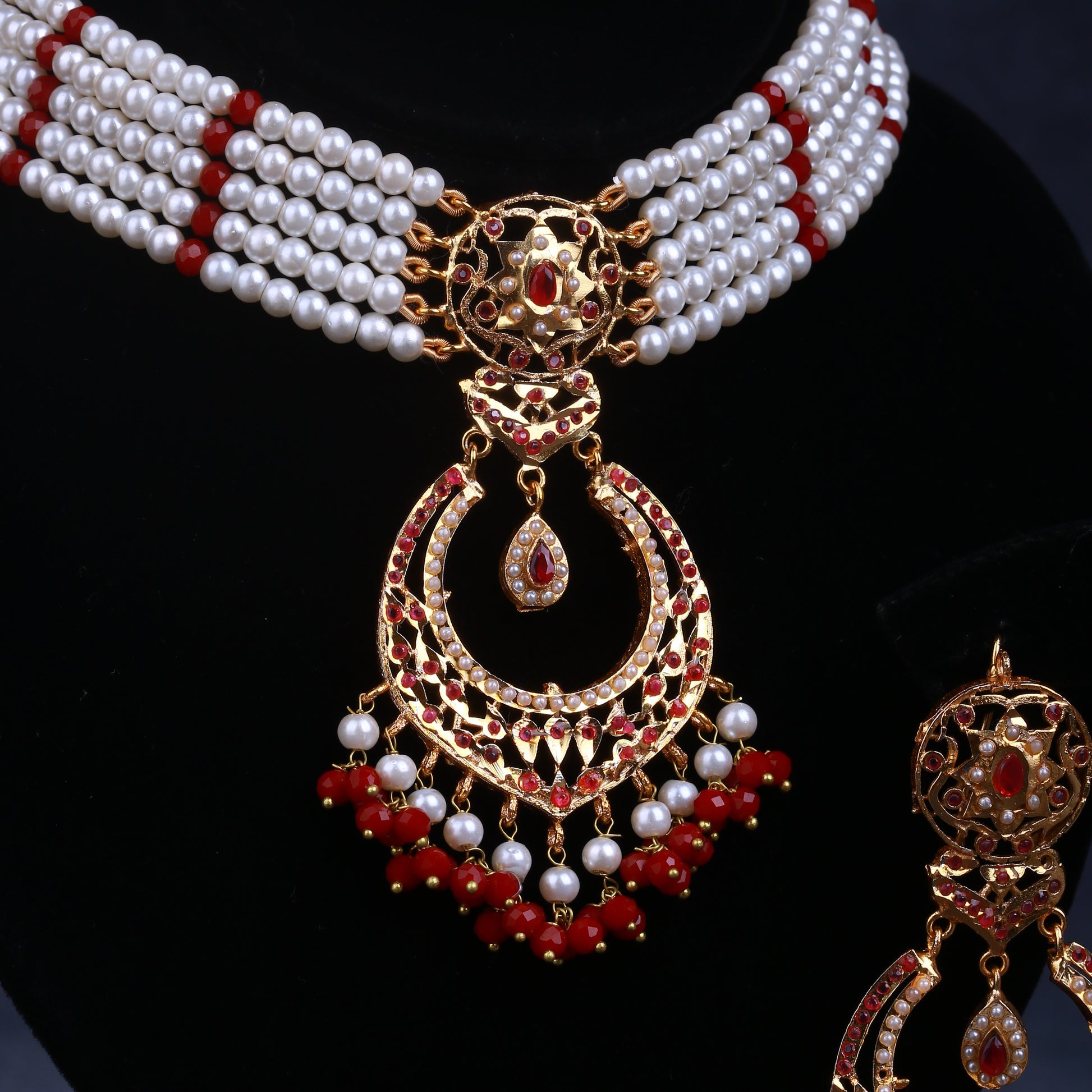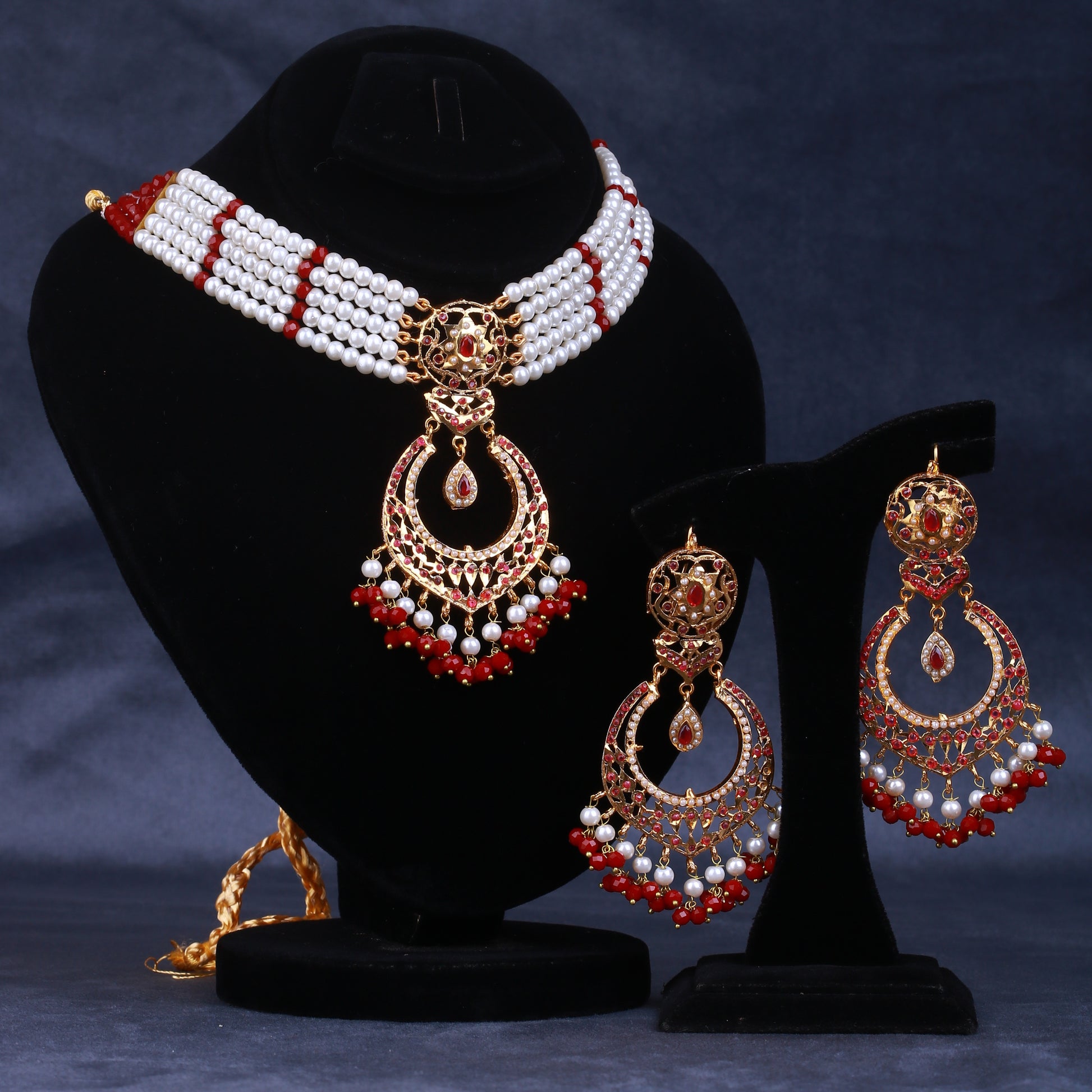 Adorn yourself with the enchanting Mehrab Traditional Set. This 22K gold-plated, 100% handmade jewelry set features a stunning necklace of lustrous white pearls and ruby-red accents, complemented by intricate 3-inch jhumka-style earrings. Each set includes an attached rope for adjustable fitting, ensuring comfort and a perfect look for any occasion.
