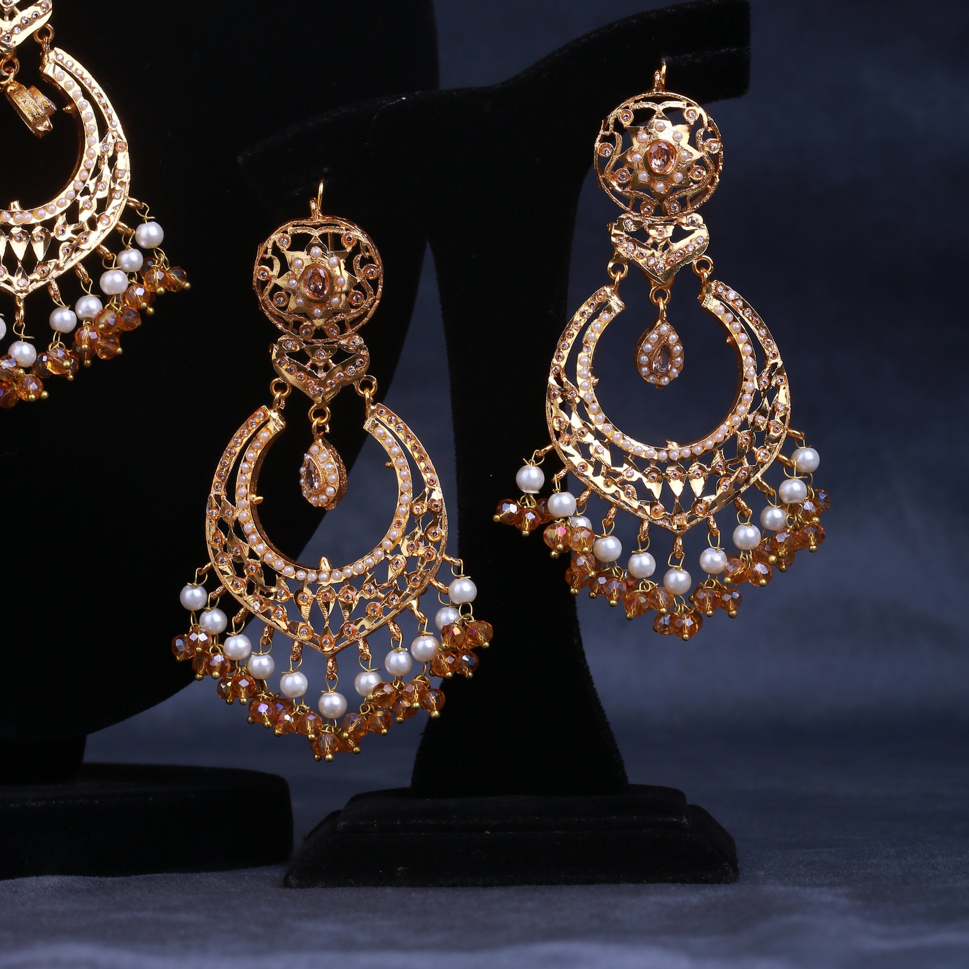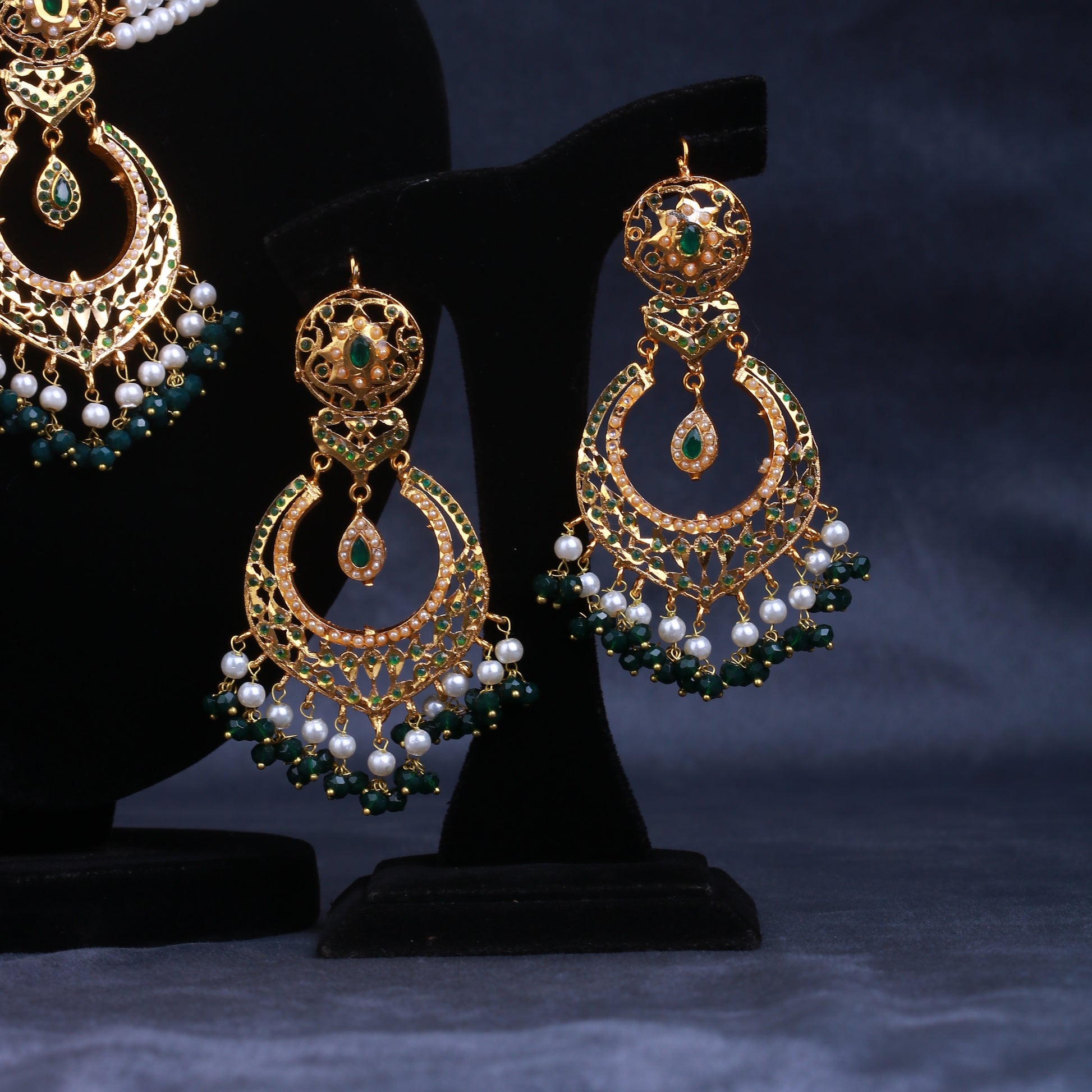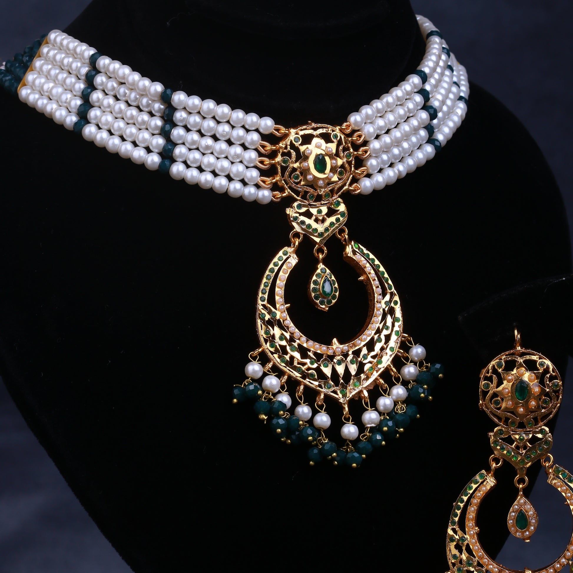 Adorn yourself with the enchanting Mehrab Traditional Set. This 22K gold-plated, 100% handmade jewelry set features a stunning necklace of lustrous white pearls and ruby-red accents, complemented by intricate 3-inch jhumka-style earrings. Each set includes an attached rope for adjustable fitting, ensuring comfort and a perfect look for any occasion.