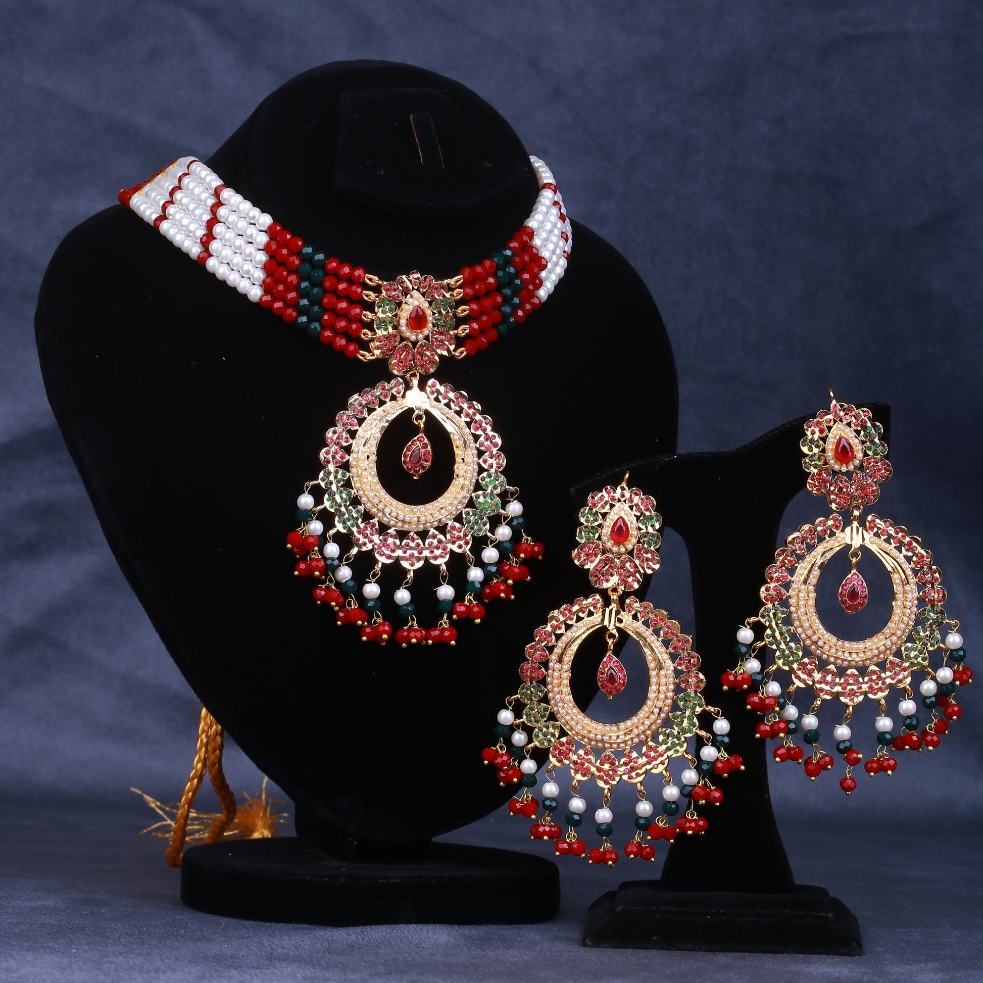 Illuminate your look with the magnificent Rangoli Royale Collection. This exquisite 22K gold-plated, 100% handmade jewelry set showcases a striking choker-style necklace, beautifully beaded with vibrant white, red, and green stones, leading to an intricately detailed circular pendant. The grandeur of the set is further enhanced by equally stunning jhumka-style earrings, each approximately 3 inches in length, mirroring the pendant's ornate design and colorful accents. Designed for comfort and versatility, the necklace comes with a durable, attached rope for adjustable fitting, making this a perfect statement piece for festive celebrations and special occasions.