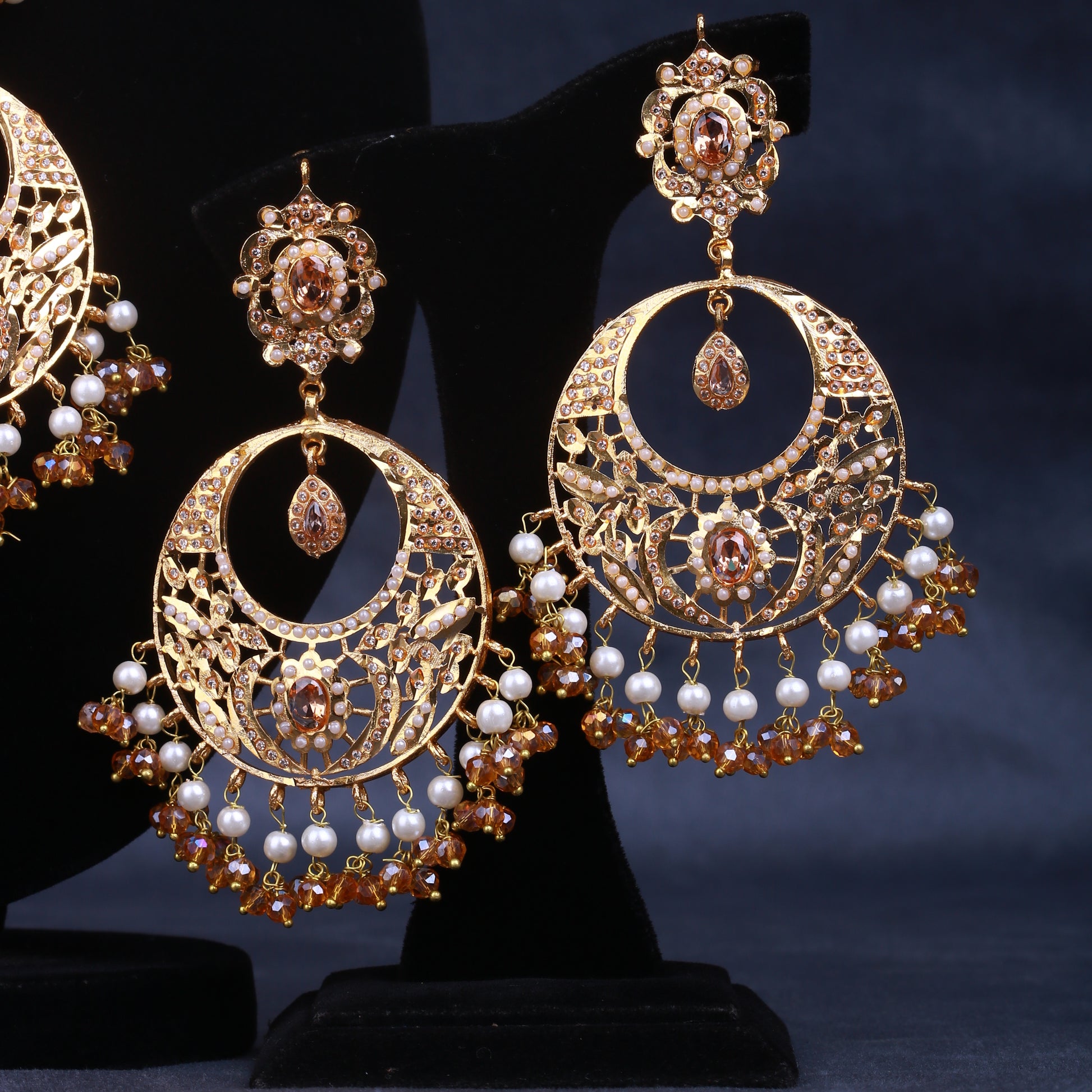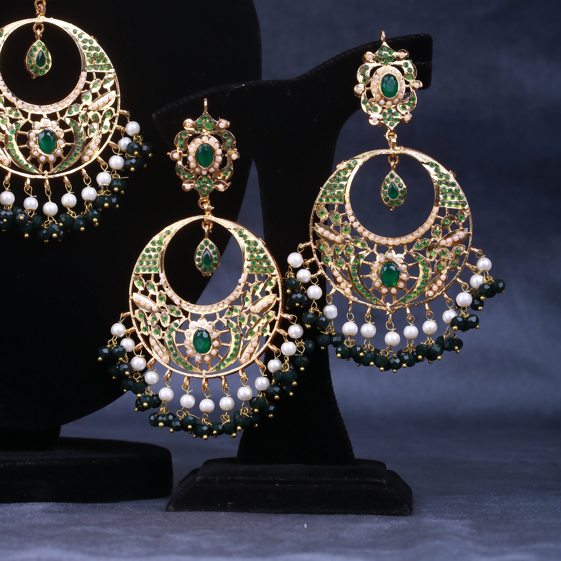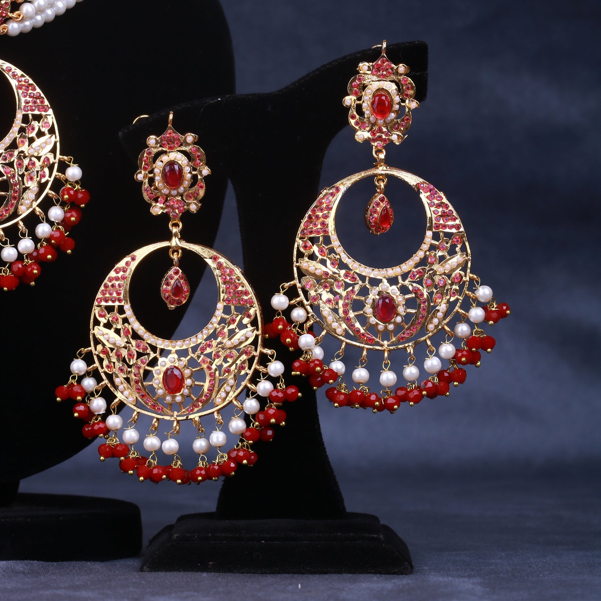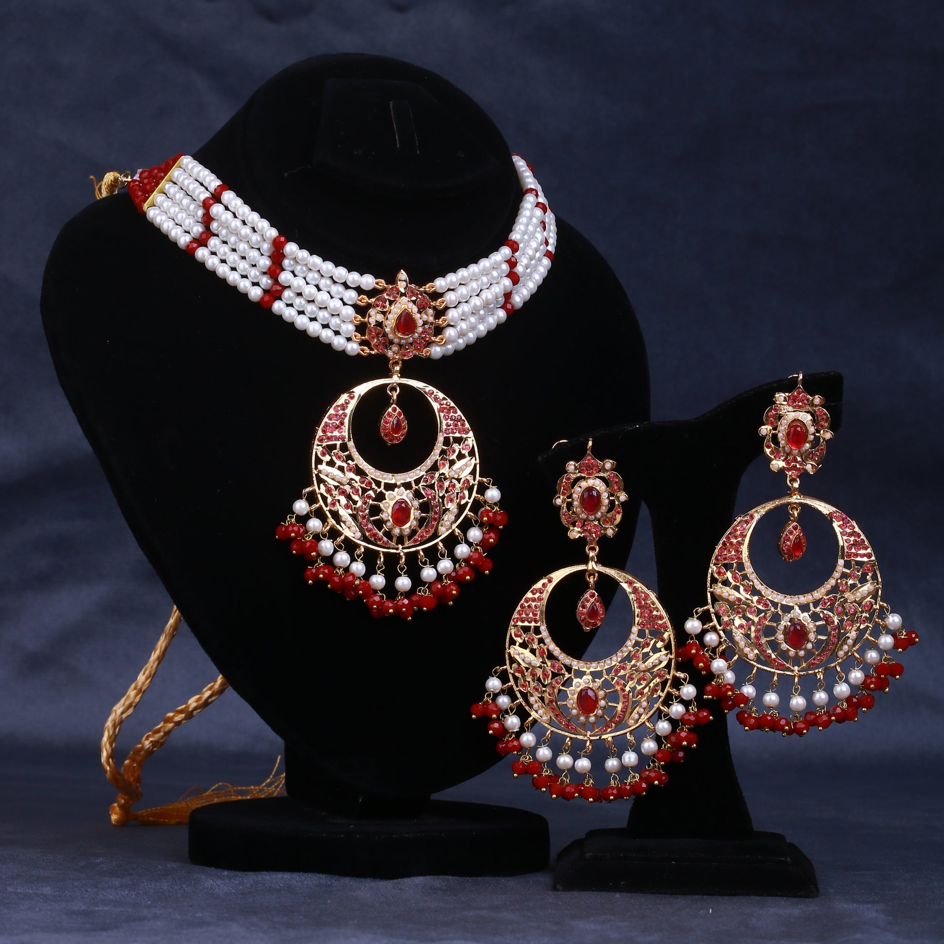 Discover the exquisite Mehrab Jewel Collection, a perfect blend of traditional elegance and modern versatility. This 22K gold-plated, 100% handmade necklace set features a striking beaded choker and an ornate, statement pendant. It comes complete with beautifully crafted jhumka-style earrings, each approximately 3 inches in length. Available in three captivating color variations – Ruby, Green, and Champagne – to perfectly match your style. Each necklace includes a convenient attached rope for adjustable fitting, ensuring comfort and a perfect look for any grand occasion.