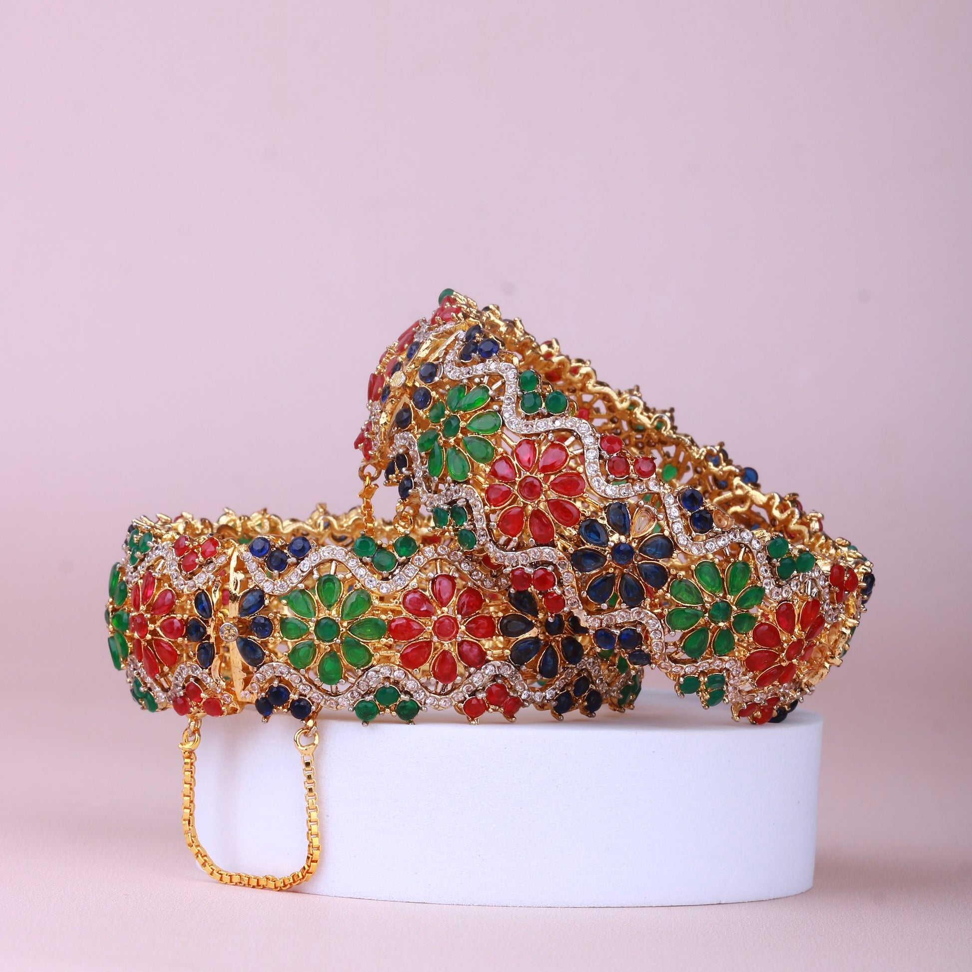 These stunning bangles are a true testament to elegance and craftsmanship. Adorned with vibrant semi-precious stones like turquoise, emerald, ruby, and sapphire, all set in a luxurious gold-plated frame, this piece offers an opulent touch to your collection.