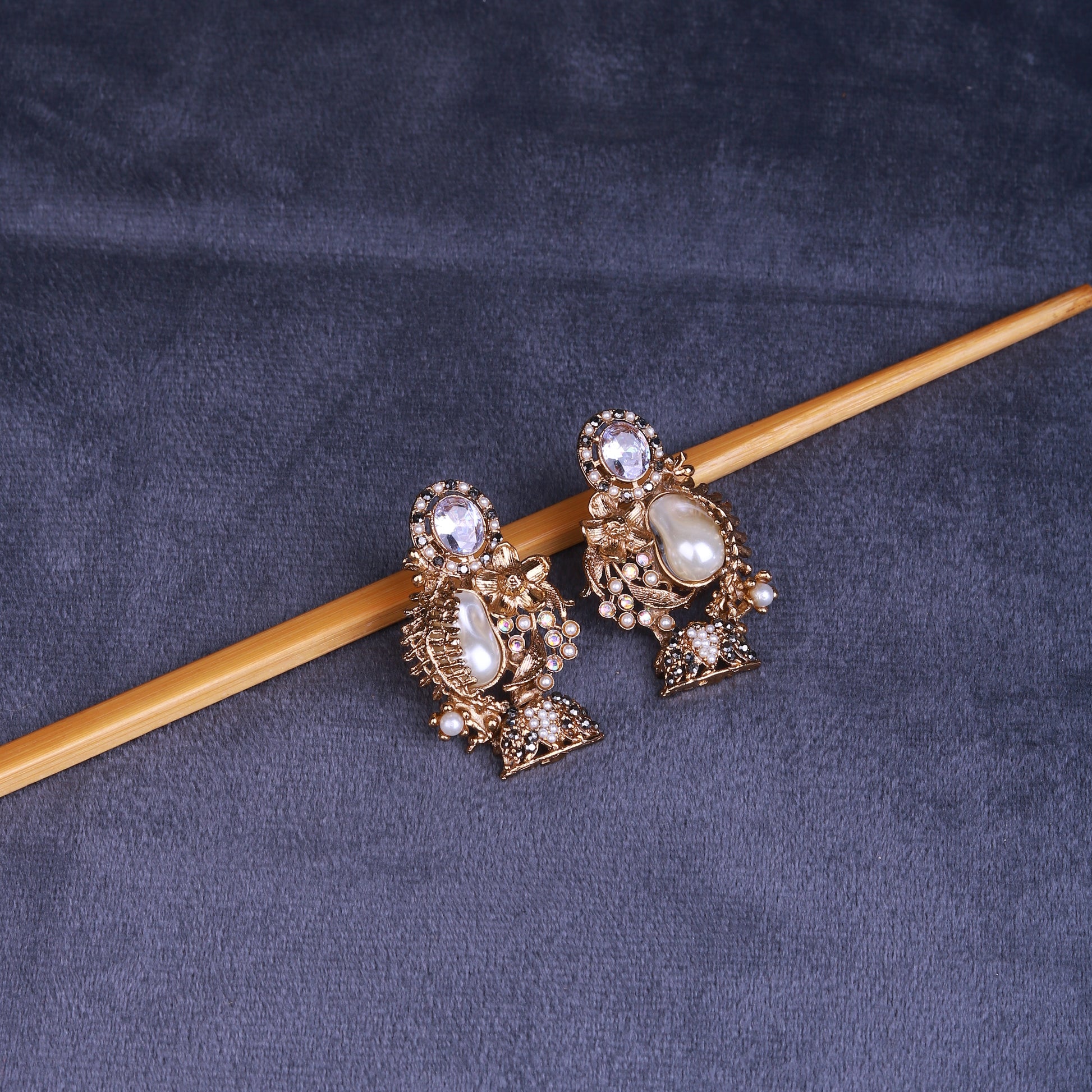 Add a touch of vintage glamour with our Pearl Royale Studs. Beautifully handmade with baroque pearl centers, sparkling stones, and intricate gold detailing, these earrings bring effortless elegance to both casual and festive looks. Finished with 22K Gold Polish for a rich, lasting shine.