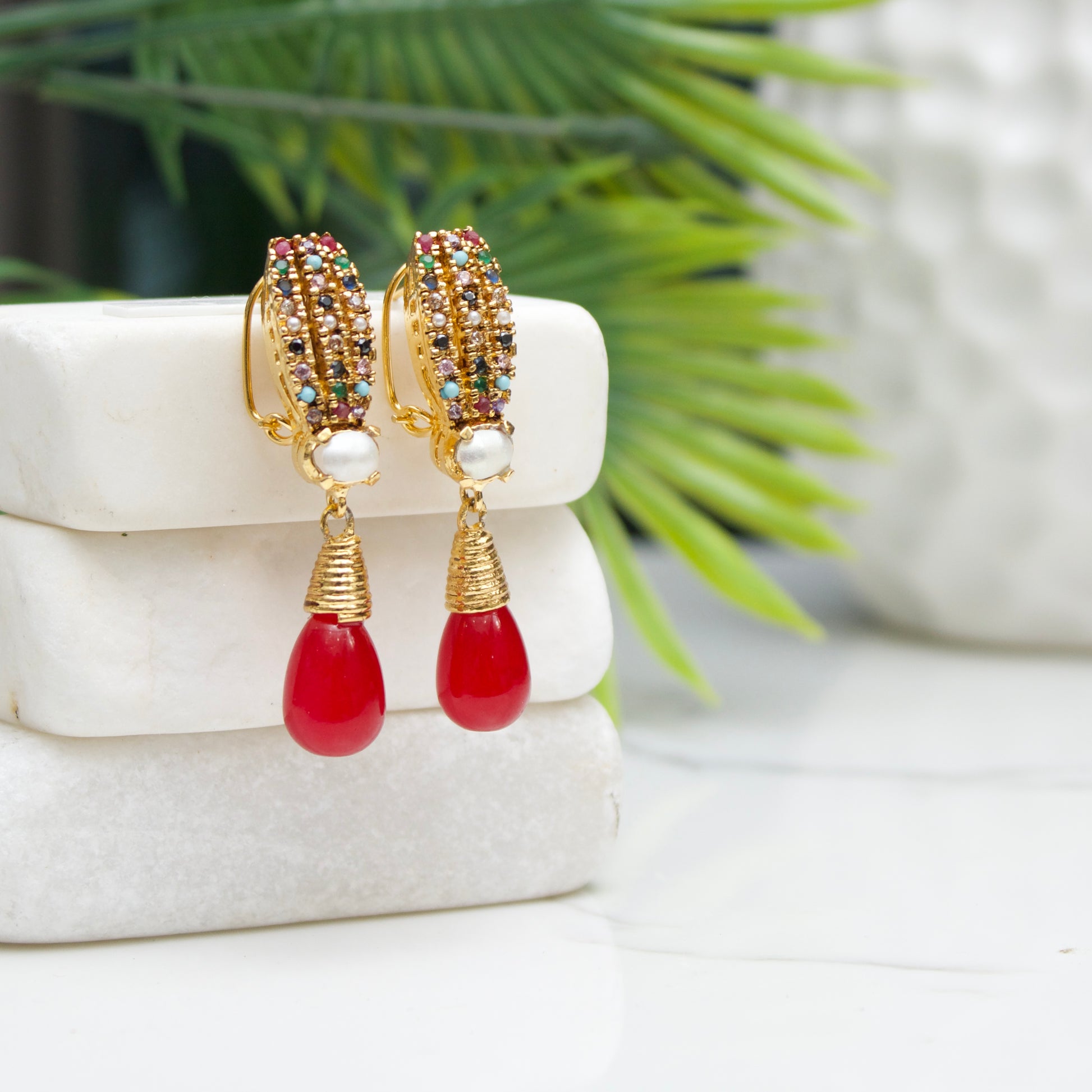 Add a touch of elegance to your style with these handcrafted Crystal Drop Earrings. Featuring a stunning combination of colorful zircon stones and a bold ruby drop, these earrings are sure to make a statement.