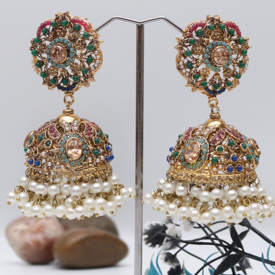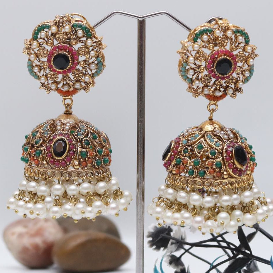 Experience timeless elegance with our stunning Naurattan Jhumkas, featuring a sophisticated design adorned with pearl hangings and studded with semi-precious rubies and emeralds. These exquisite earrings effortlessly combine traditional charm with modern allure.