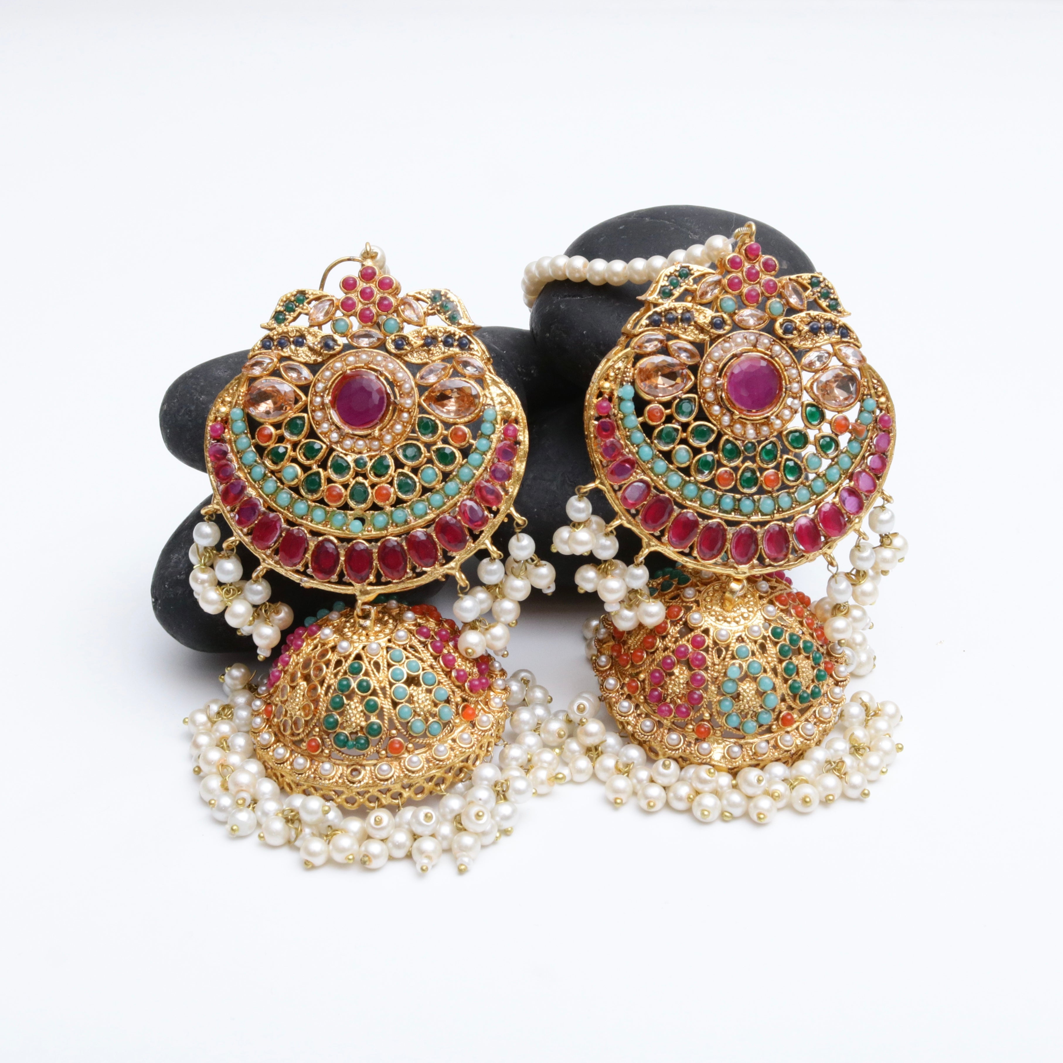 Matching jhumka-style earrings with cascading pearls for a regal, head-turning effect