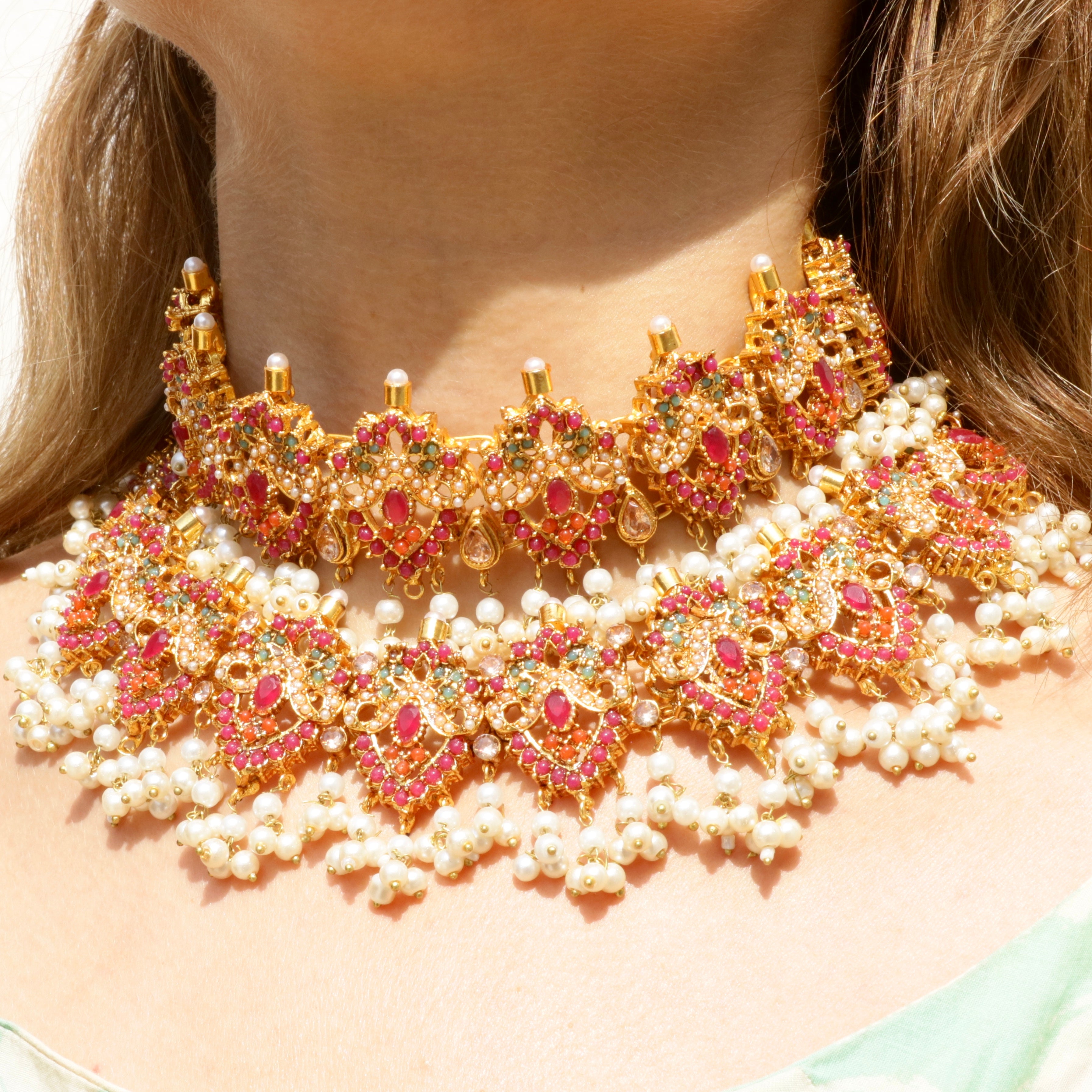 A bold multi-layered choker necklace, crafted in antique gold tone and intricately detailed with Kundan stones, Meenakari enamel work, and hanging pearl clusters
