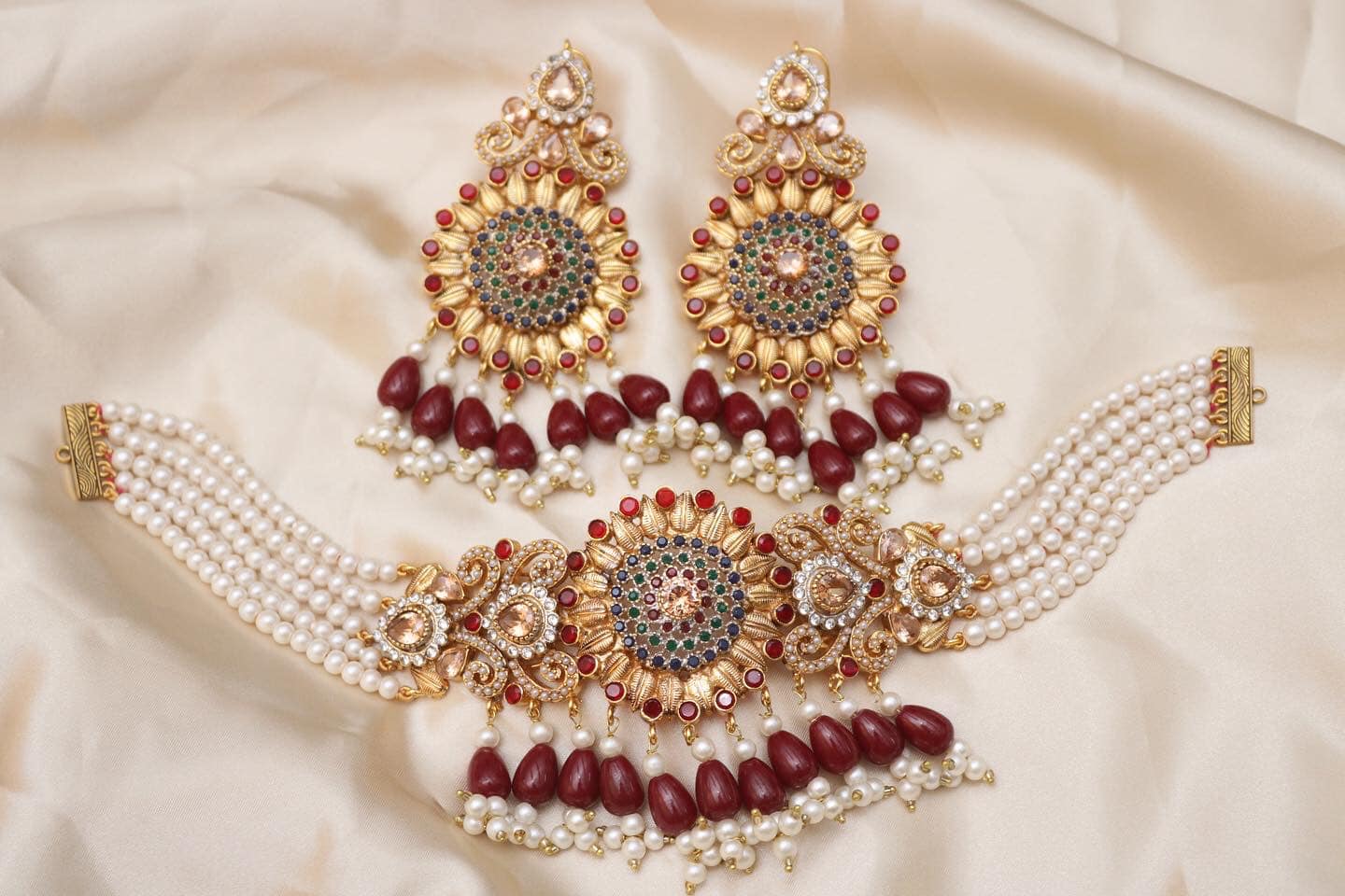 Handmade 22K gold plated kundan choker set featuring elegant chandbali motifs with pearl details. Available in emerald green and ruby maroon colors. Perfect for weddings and festive occasions.