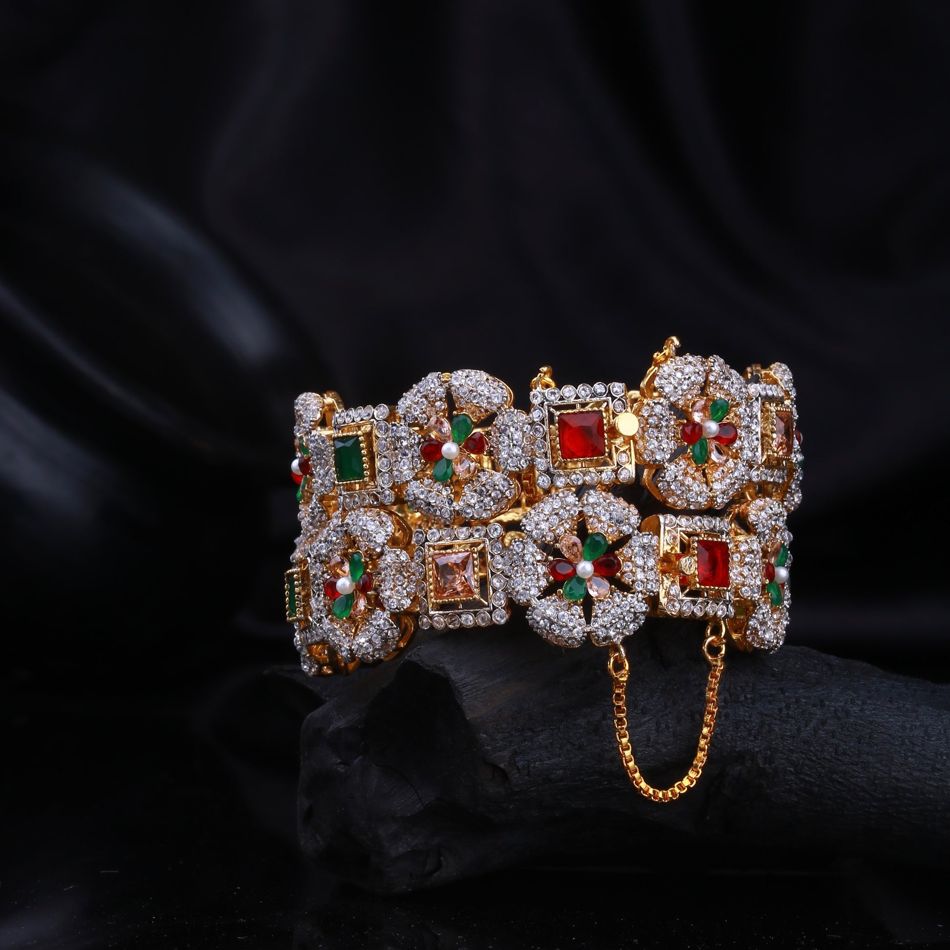 Add a touch of royal elegance to your look with our Regal Ruby & Emerald Floral Openable Bangle. Expertly crafted with intricate floral motifs, this stunning piece is adorned with sparkling white stones, radiant rubies, and vibrant emeralds, set in a luxurious gold-toned base.