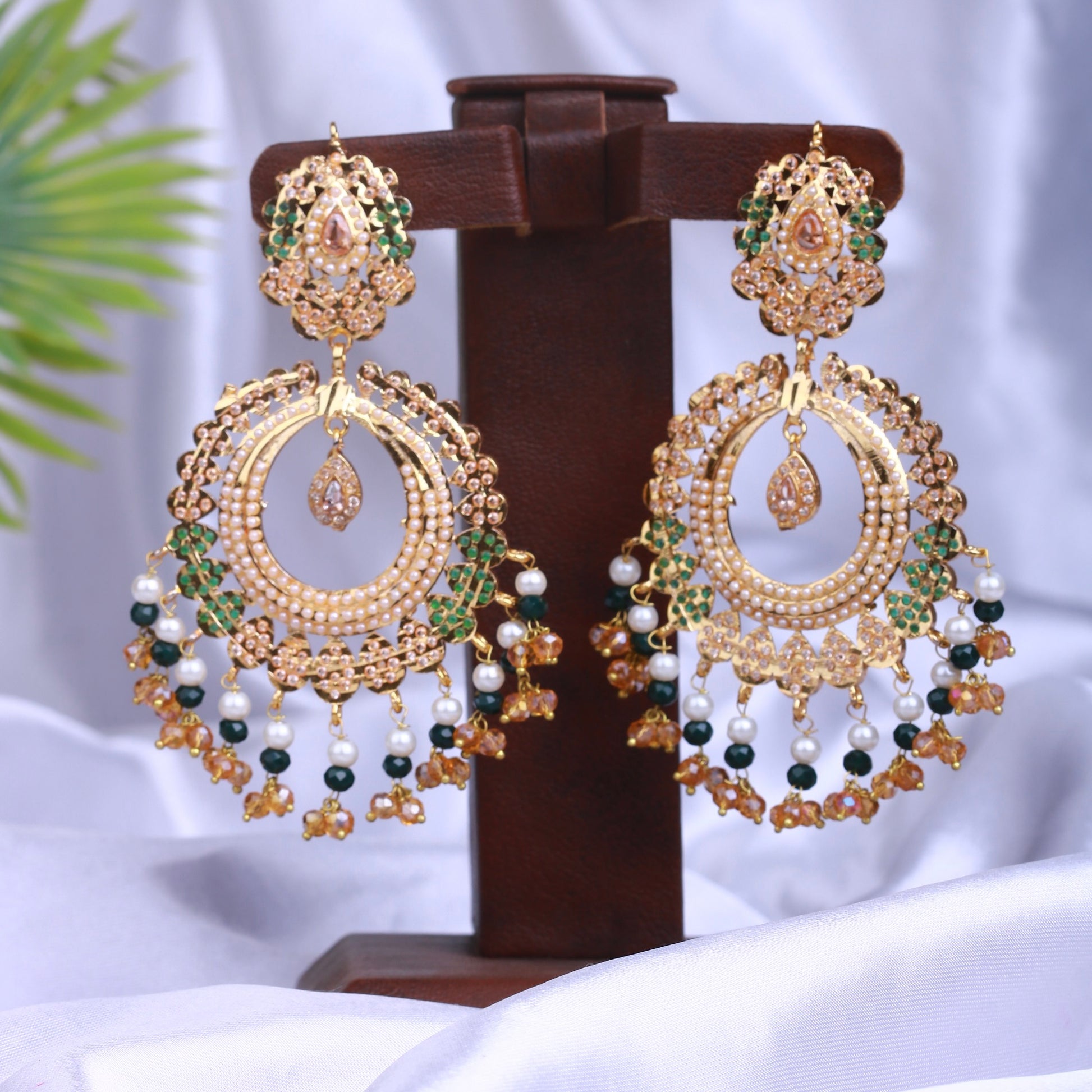 Add regal charm to your collection with our Naqashi Pearl Dangles. These stunning earrings are meticulously handmade using premium-quality Laak Kundan, adorned with multicolored beads, and finished with intricate detailing. Their traditional silhouette and vibrant accents make them perfect for festive celebrations or wedding occasions. Completed with a rich 22K Gold Polish for timeless elegance.