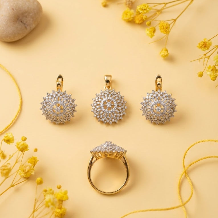 Shine bright with this stunning Gold & Silver Plated Starburst Halo Jewelry Set. This luxurious 3-piece ensemble features premium 22k gold and silver plating with high-quality zirconia stones arranged in an intricate starburst design, creating a sophisticated "bloom" effect that captures light beautifully.