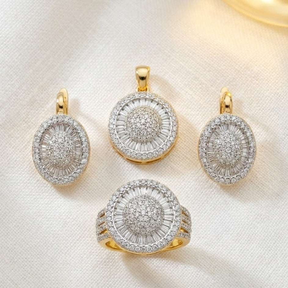 Gold & Silver Plated Oval Halo Jewelry Set - Pendant, Ring & Earrings