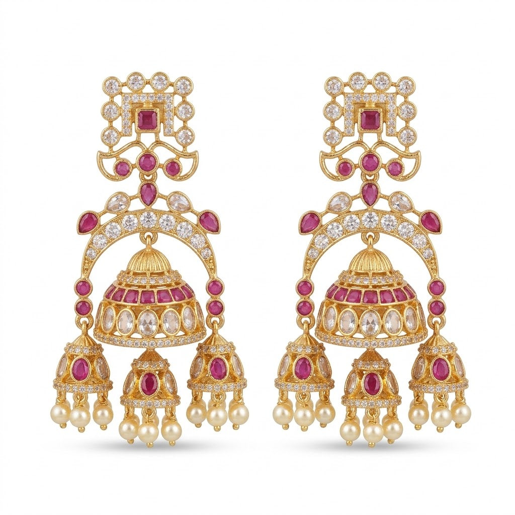 Crafted with floral symmetry and architectural grace, each earring features a gold-dipped base adorned with vibrant ruby-hued stone settings arranged in intricate floral motifs. Three progressively cascading jhumki bells flow one into the next, creating a mesmerising drop effect that is both playful and regal. Lustrous pearl drops at the base add a soft, feminine finish that completes the look beautifully. Available in Multi and Ruby colourways — perfect for brides, wedding guests, and festive occasions across the UK and USA.