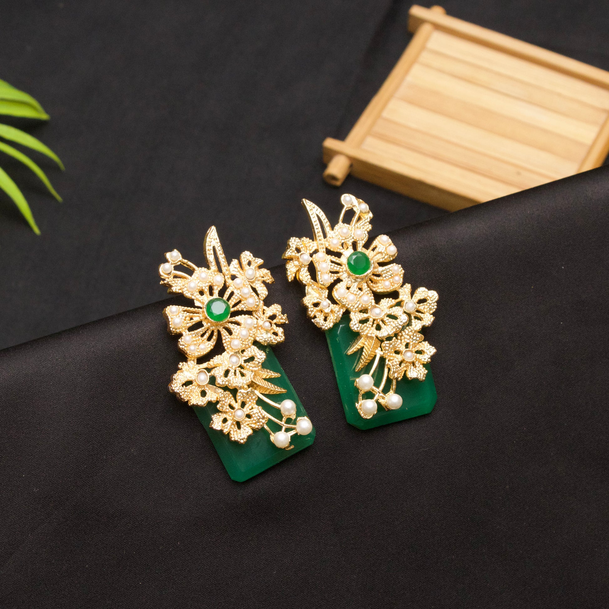 Add a touch of modern elegance to your collection with these handmade Golden Bloom Earrings. Featuring a unique rectangular base in vibrant shades paired with intricate floral gold tops, these earrings are finished in premium 22K Gold Polish. At approximately 1.5 inches, they’re the perfect blend of bold and graceful for any look.