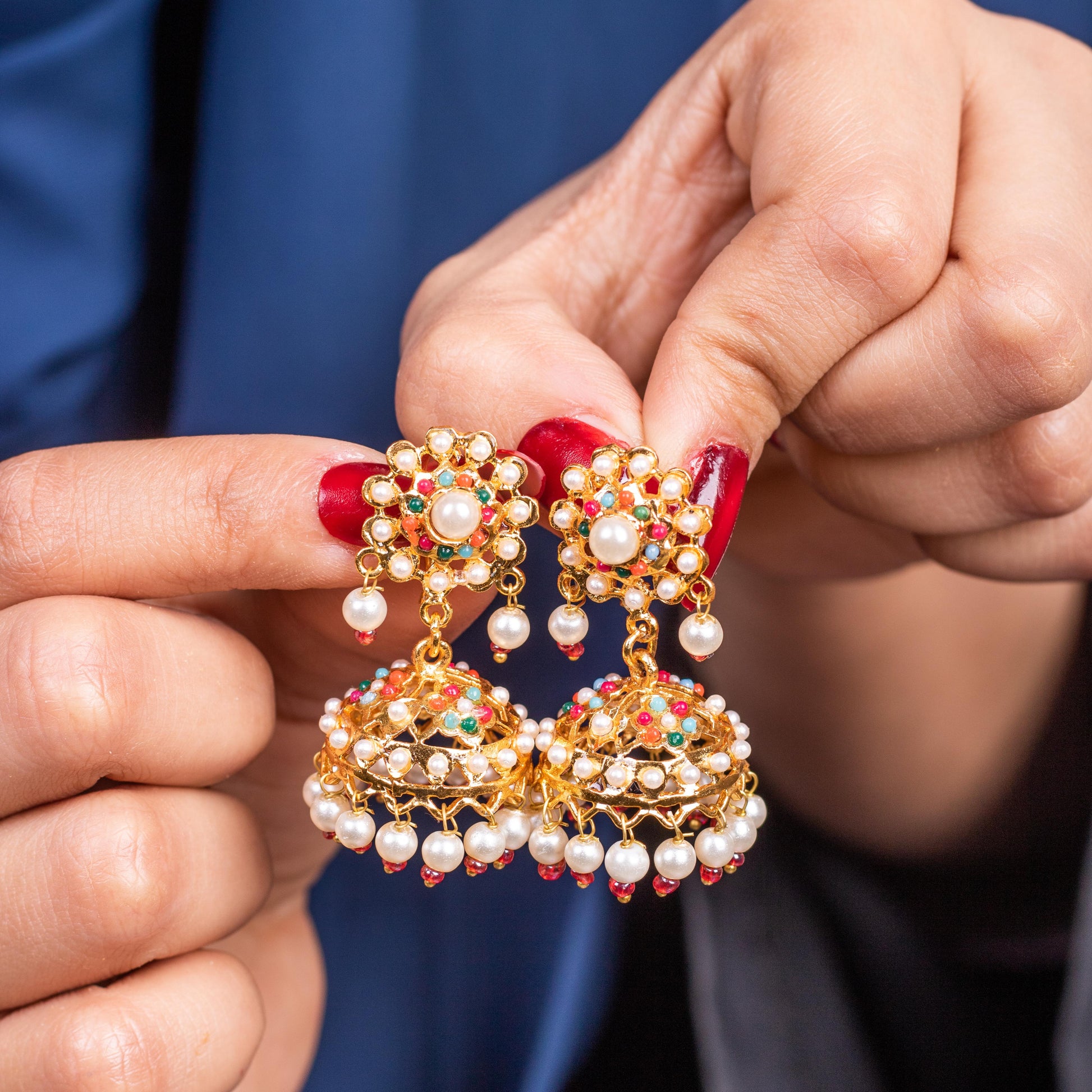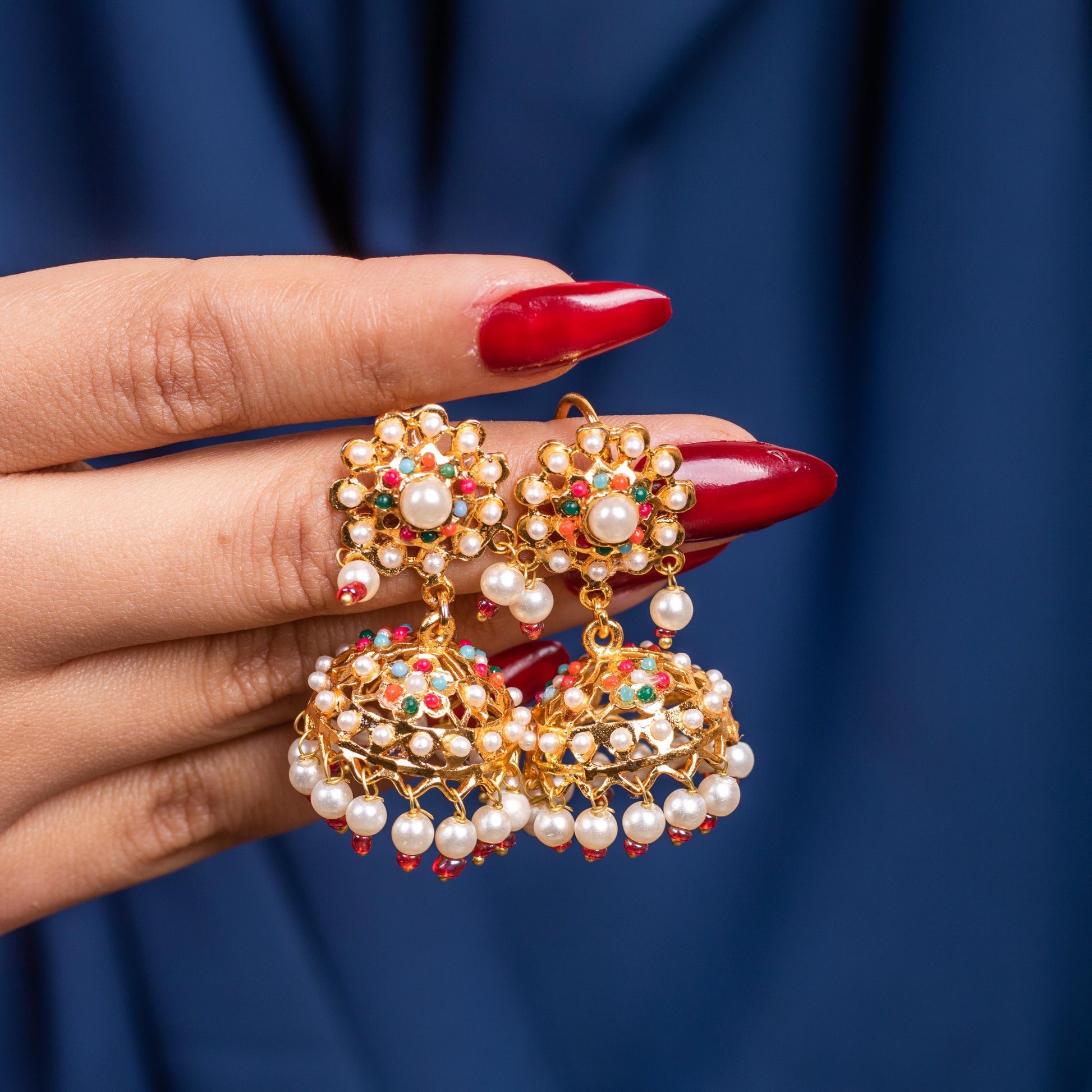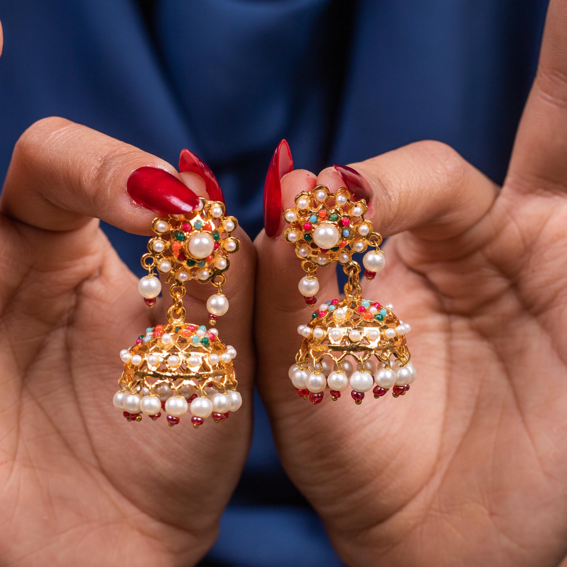 Enhance your ethnic look with these exquisite Heer-e-Moti Bali Multi featuring a beautiful blend of vibrant stone and delicate pearls. Crafted with intricate detailing and finished in 22K Gold Polish, these earrings exude elegance and tradition. Their lightweight design makes them perfect for all-day wear while adding a regal charm to any outfit.