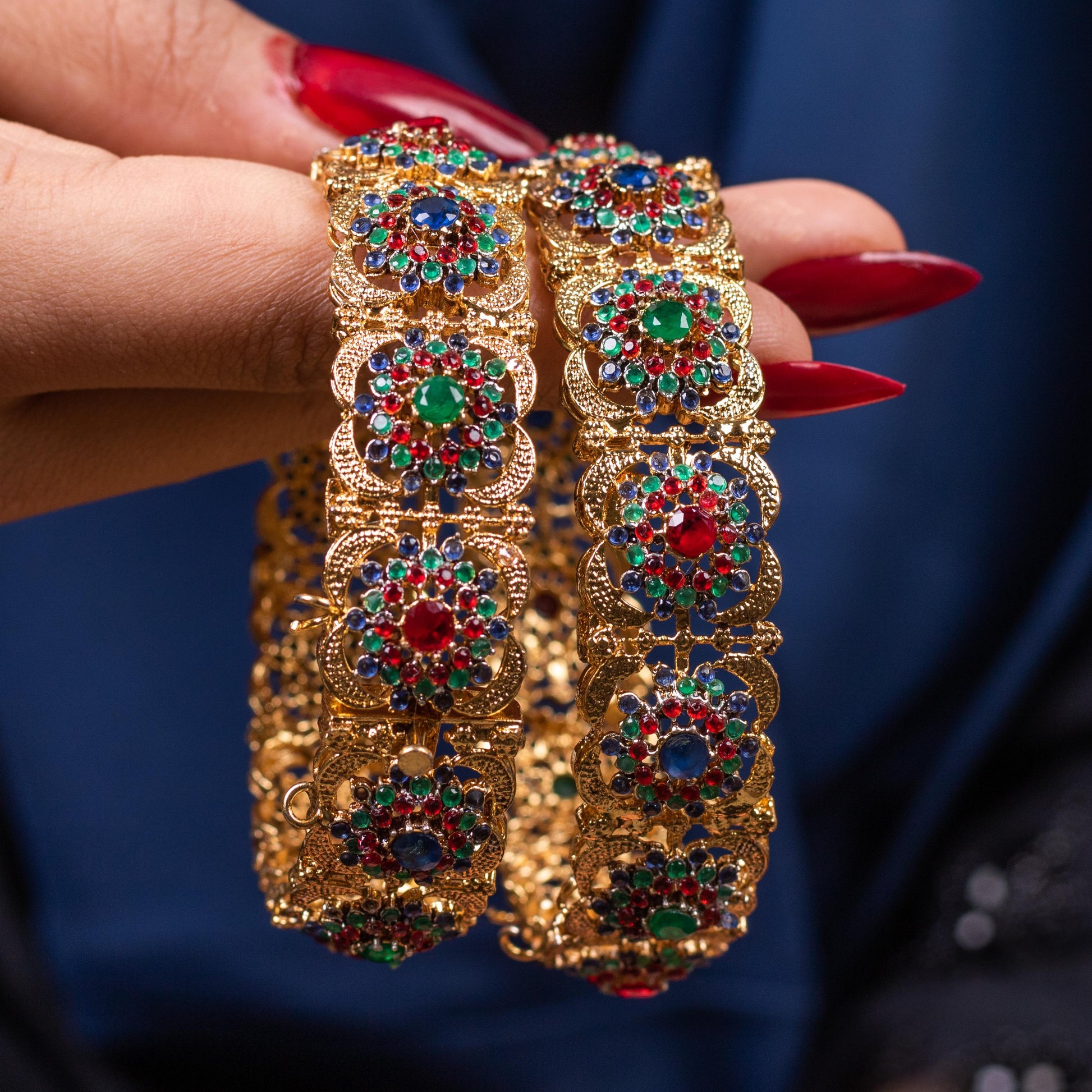 Experience the grandeur of tradition with our Heritage Sovereign Bangle, exquisitely crafted to add a royal touch to your jewelry collection. These handmade openable bangles feature intricate Meenakari and Navratan work, beautifully adorned with vibrant stones. The delicate paisley motifs and fine detailing reflect the timeless charm of heritage craftsmanship.