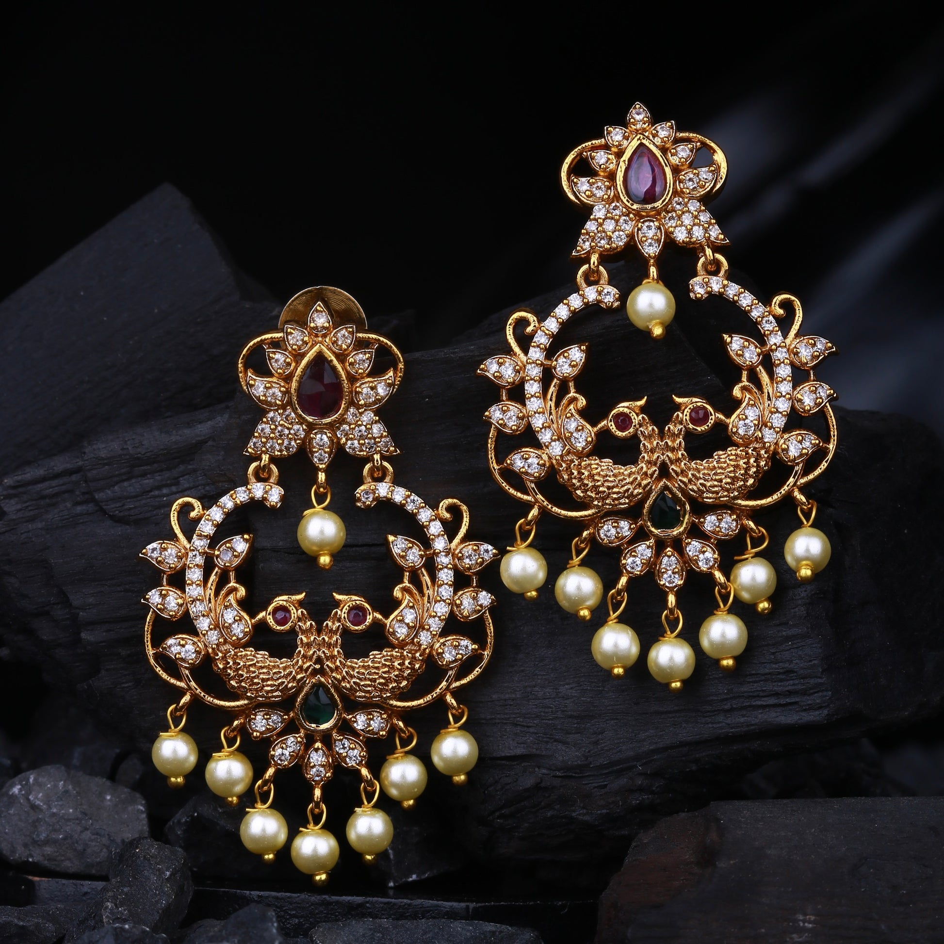 Add a touch of majestic charm to your jewelry collection with our Royal Peacock Chandbaalis. Expertly handmade and adorned with shimmering cubic zirconia, deep red and green gemstones, and delicate pearl hangings, these earrings capture the grandeur of traditional craftsmanship. The twin peacock motif, symbolizing grace and beauty, enhances the timeless appeal, making them a perfect choice for weddings, festive occasions, and grand soirées.
