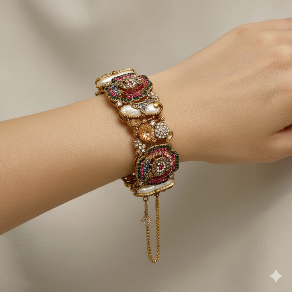 Indulge in celestial elegance with the "Kangan e Sitare Rose Quartz Radiance Bangles BN-46." These exquisite bangles are meticulously crafted with a delicate filigree design, adorned with sparkling crystals, and accented with captivating rose quartz gemstones. The intricate craftsmanship and ethereal beauty of these bangles evoke a sense of celestial wonder