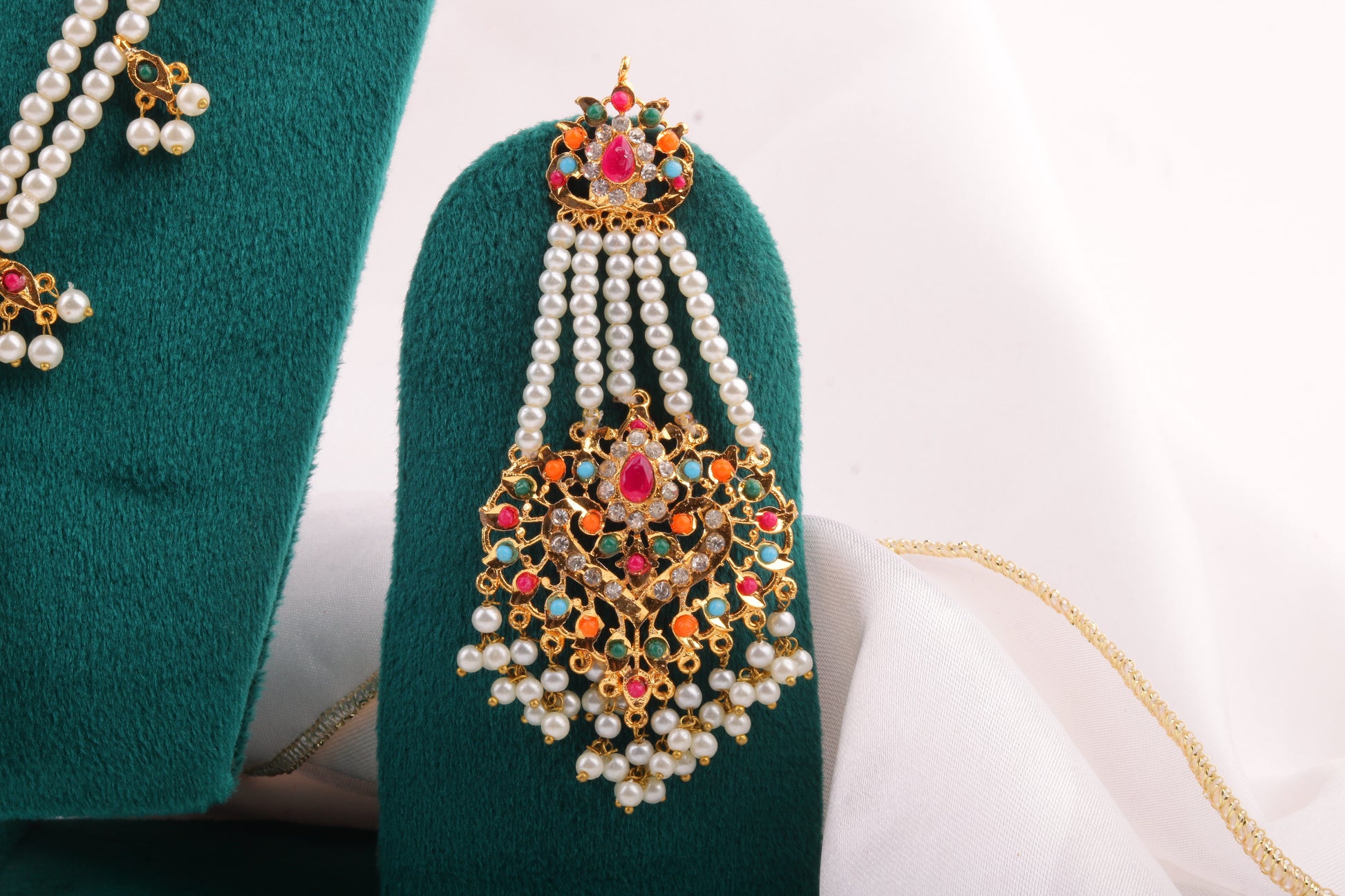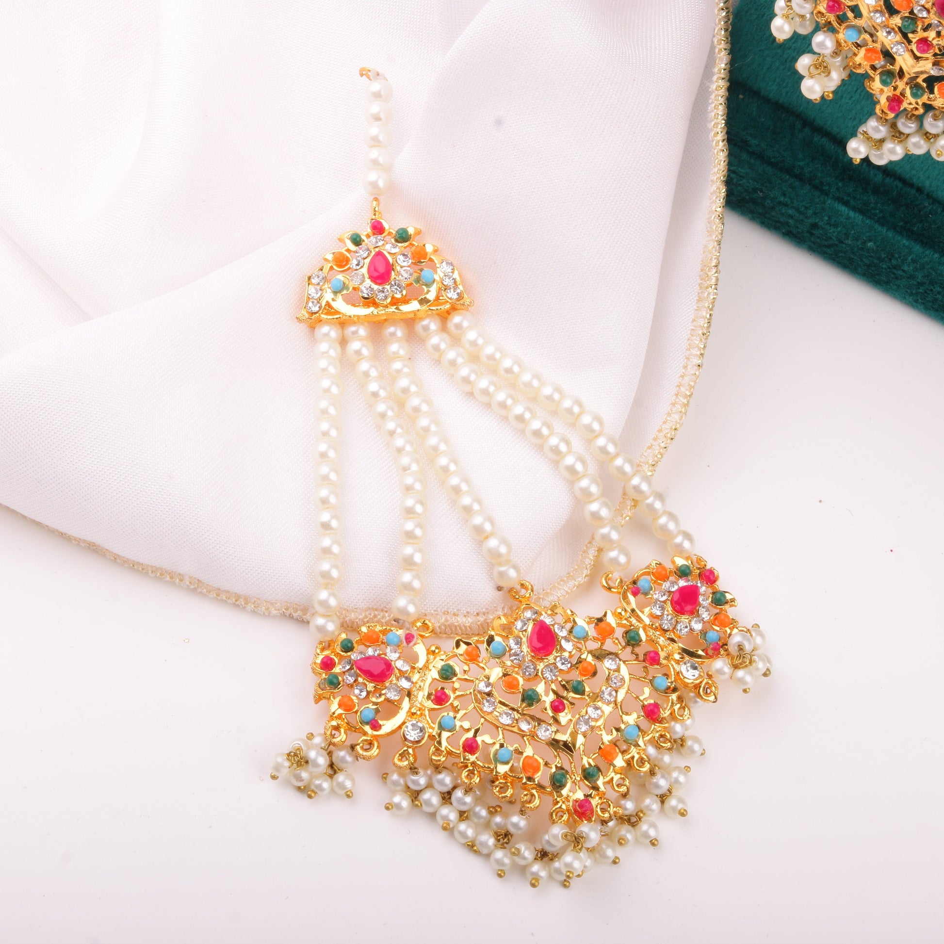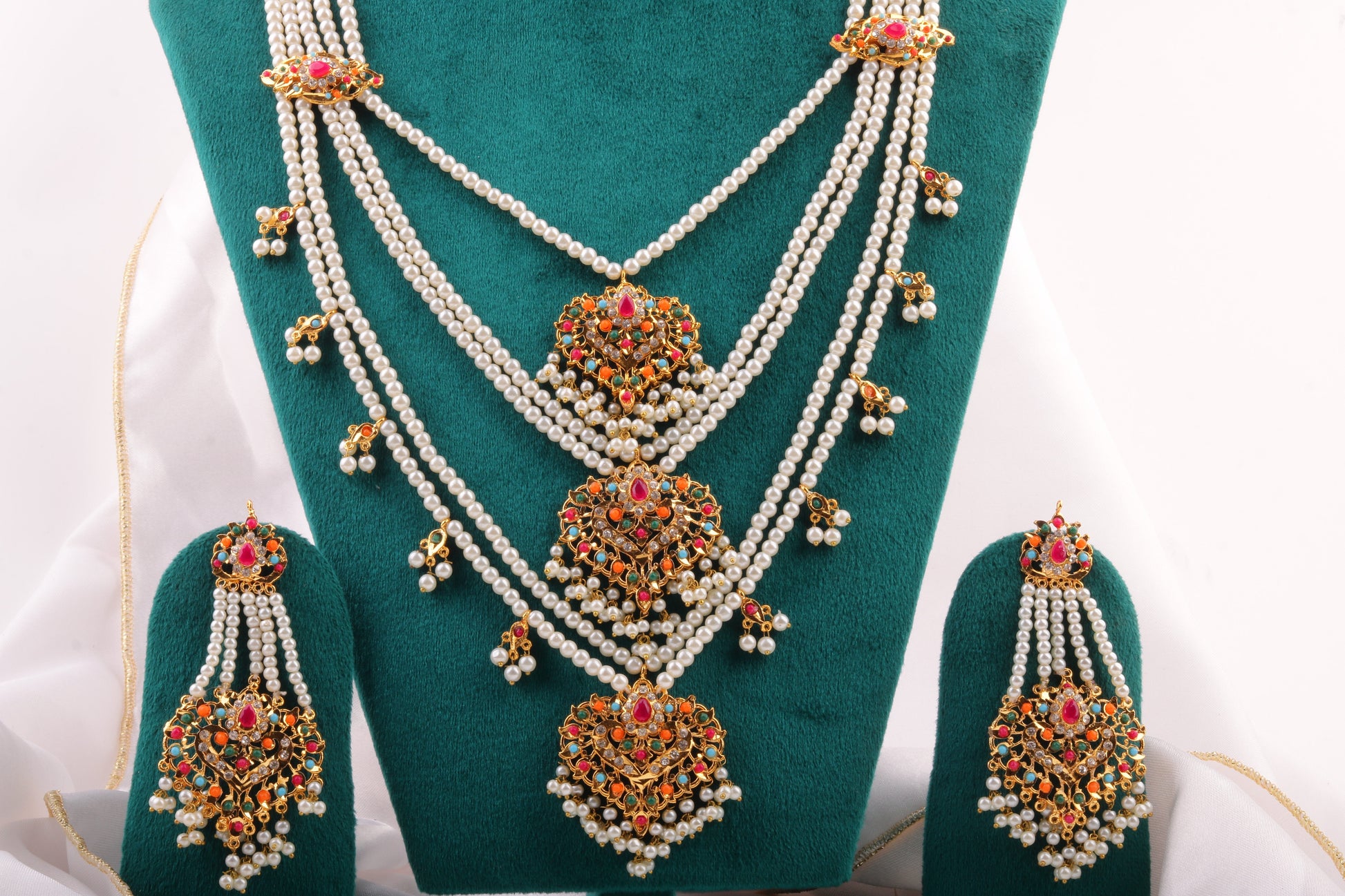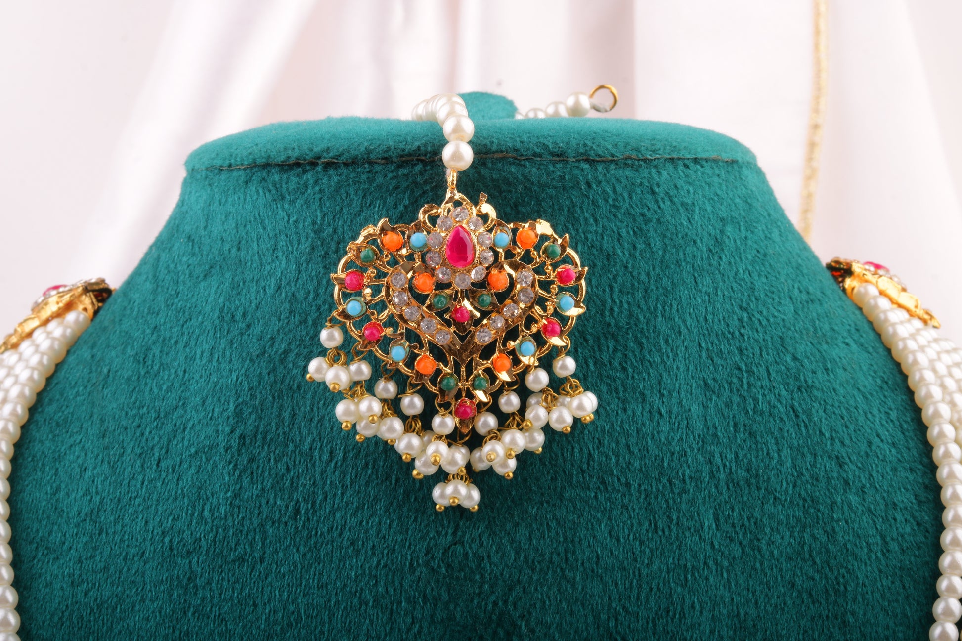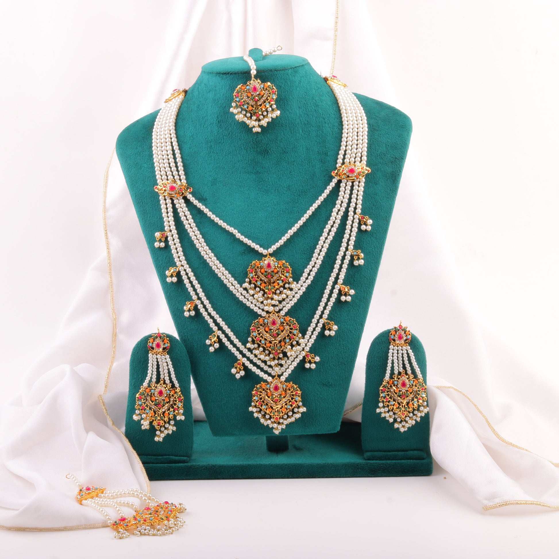 Includes: Multi-layered necklace, earrings, maang tikka, and haath phool