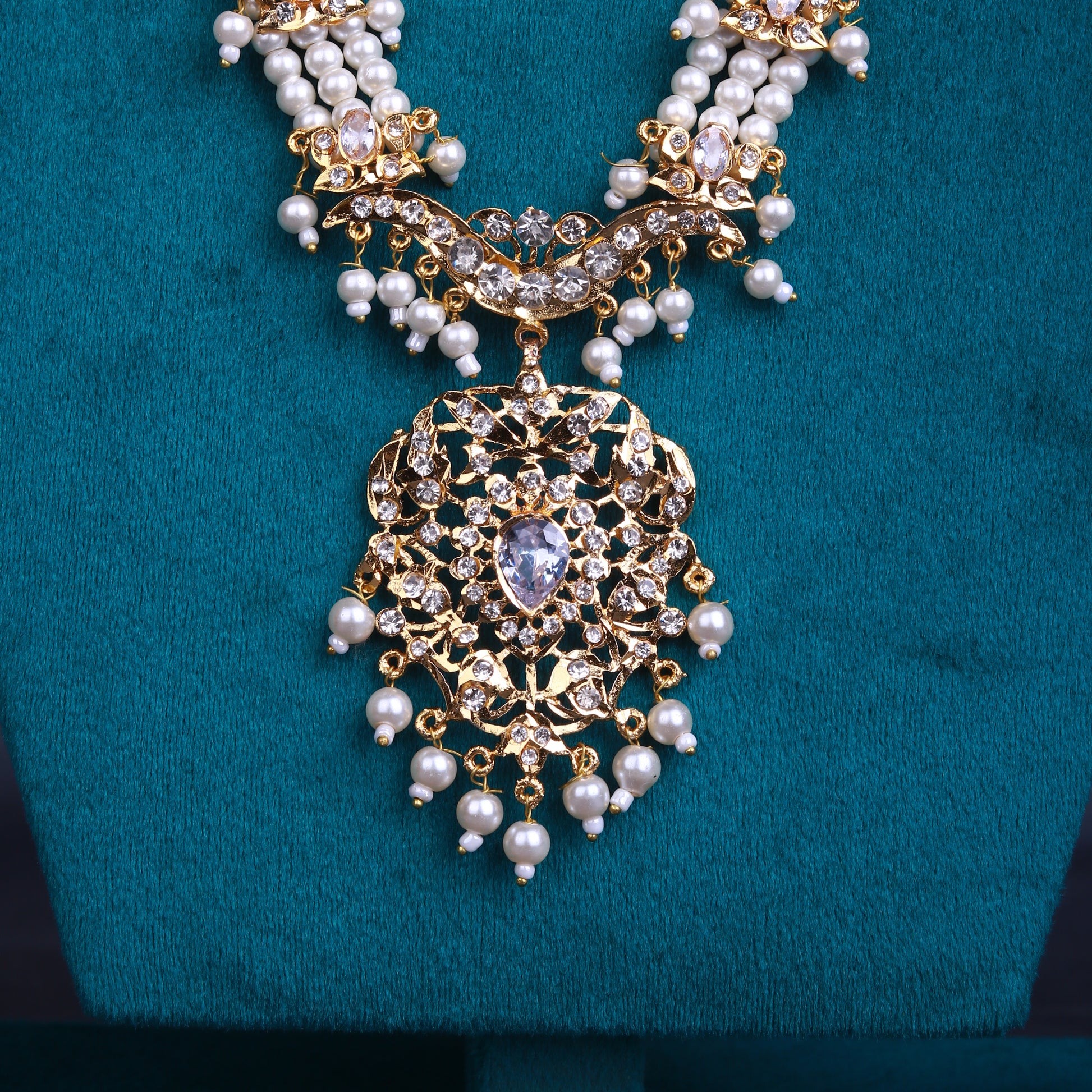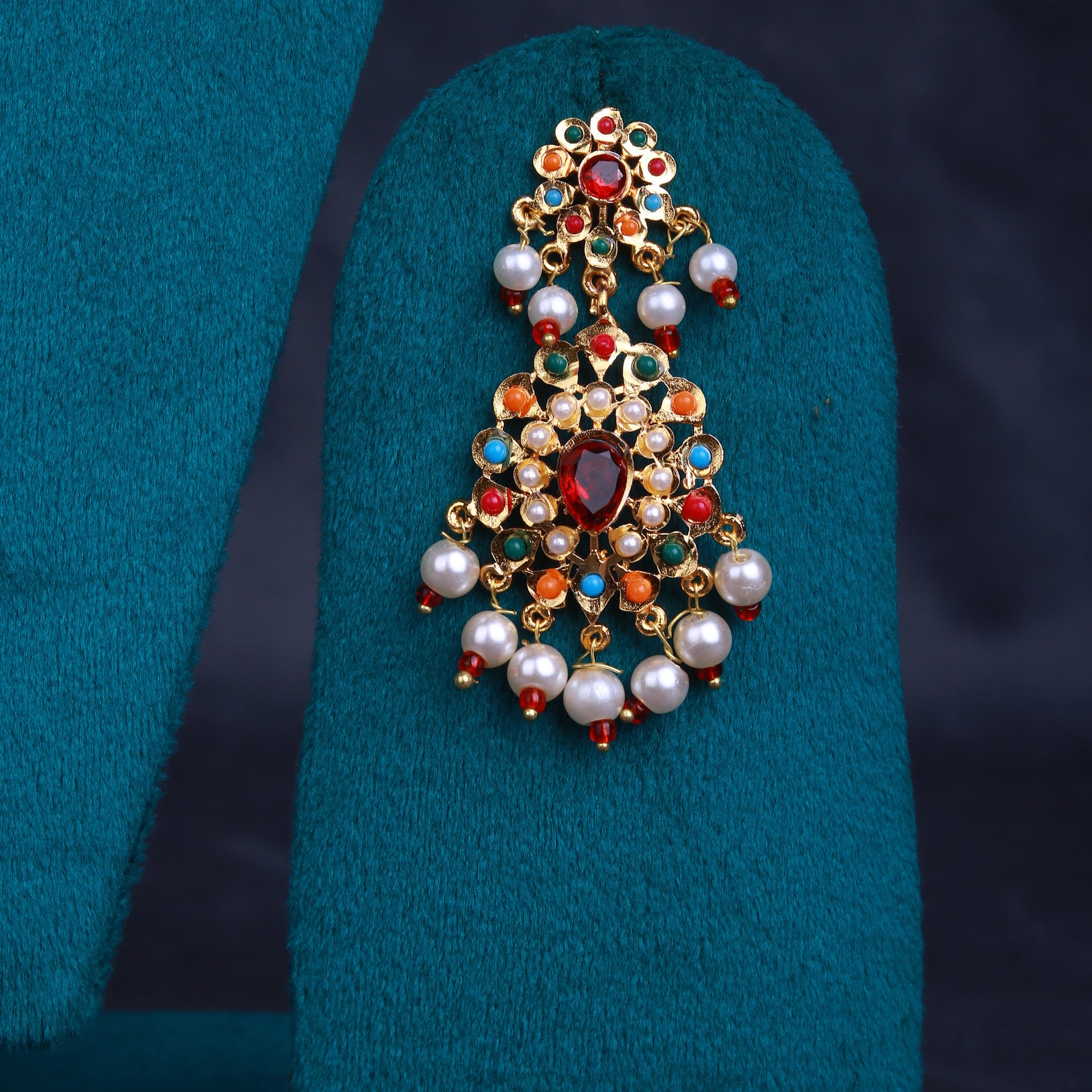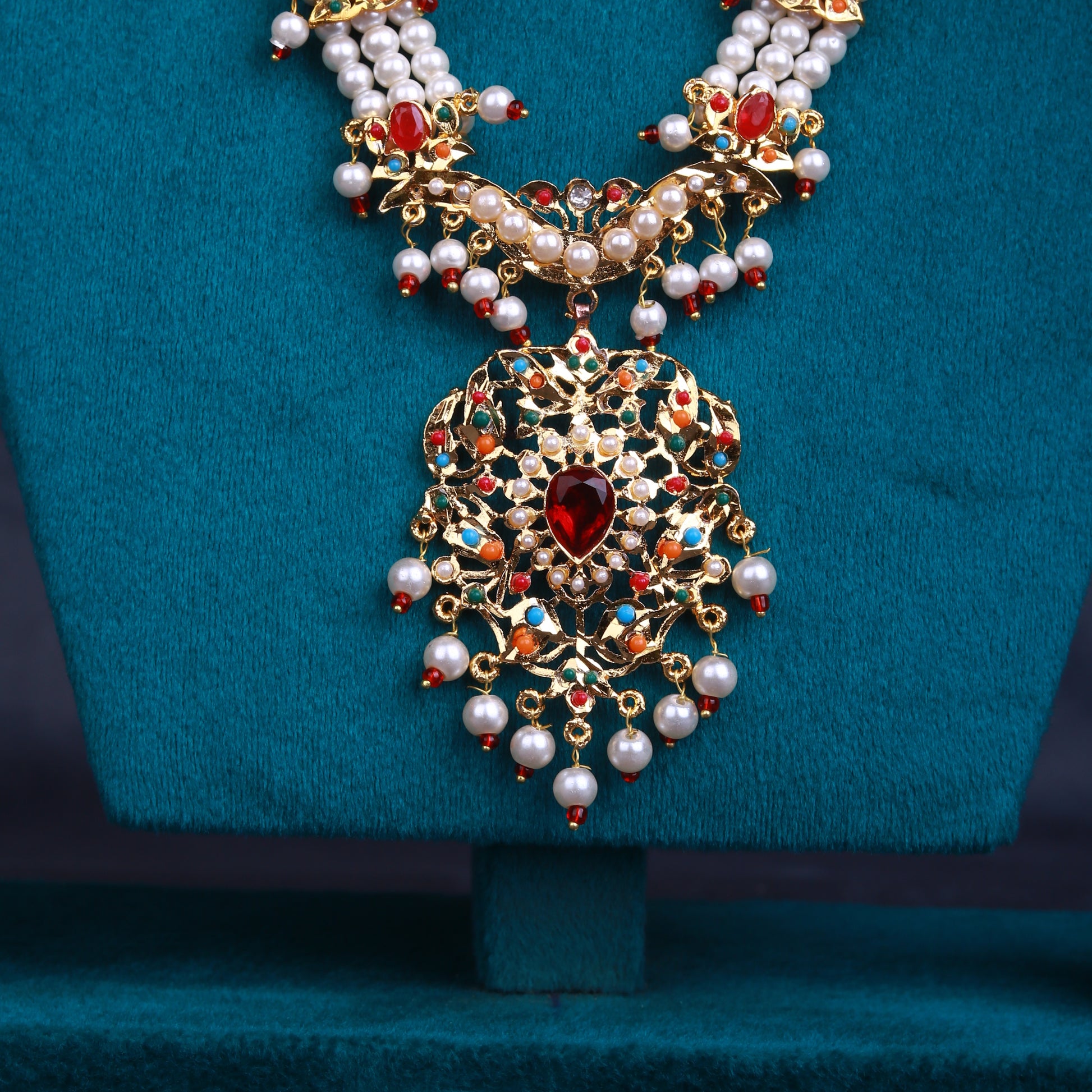 Embrace regal beauty with the Zareen Mahal Jewellery Set. This 22K gold-plated, 100% handmade ensemble features exquisite Kundan work with vibrant Navarattan stones. The set includes a long necklace, matching earrings, and a tikka, complete with an attached rope for adjustable fitting. Perfect for a grand traditional look.