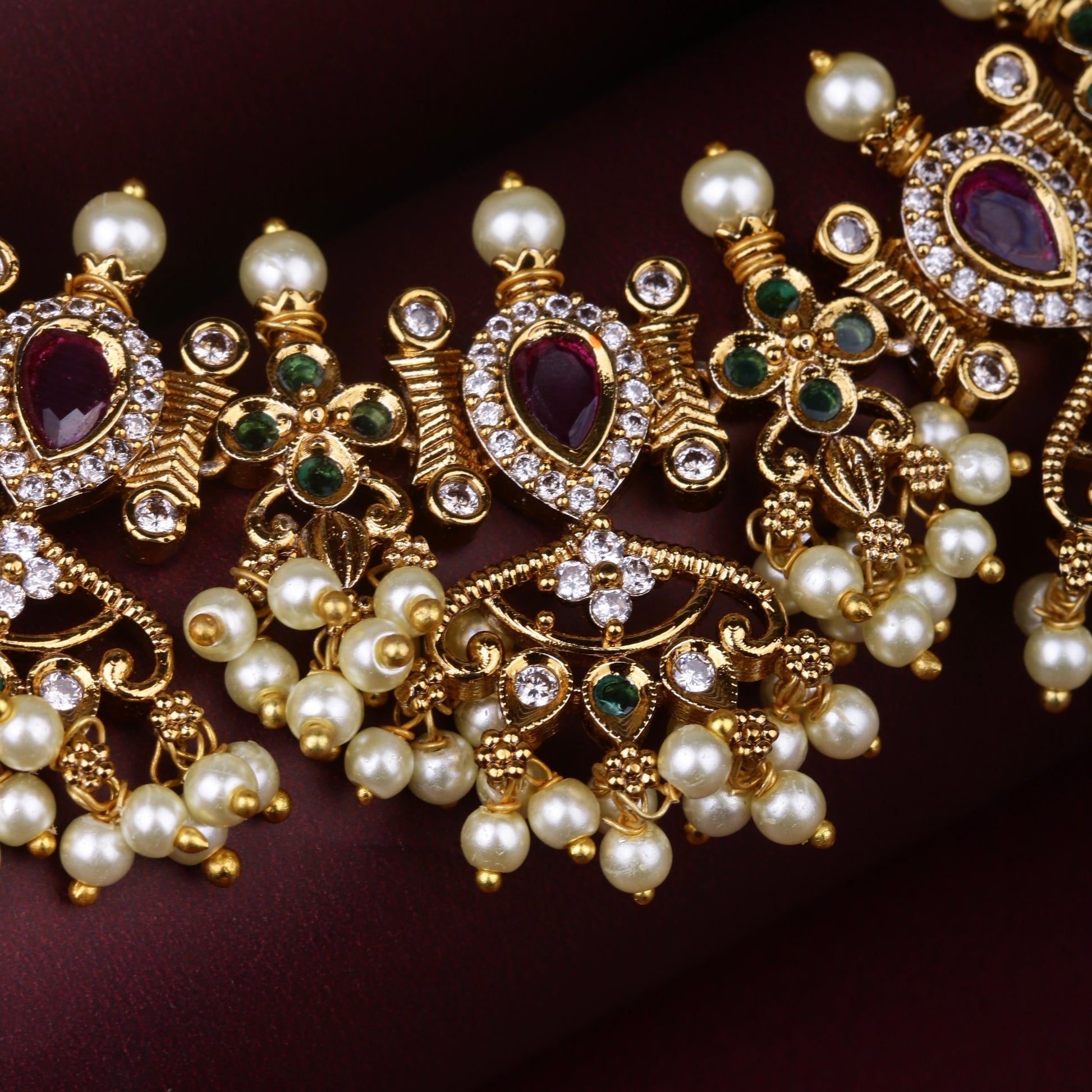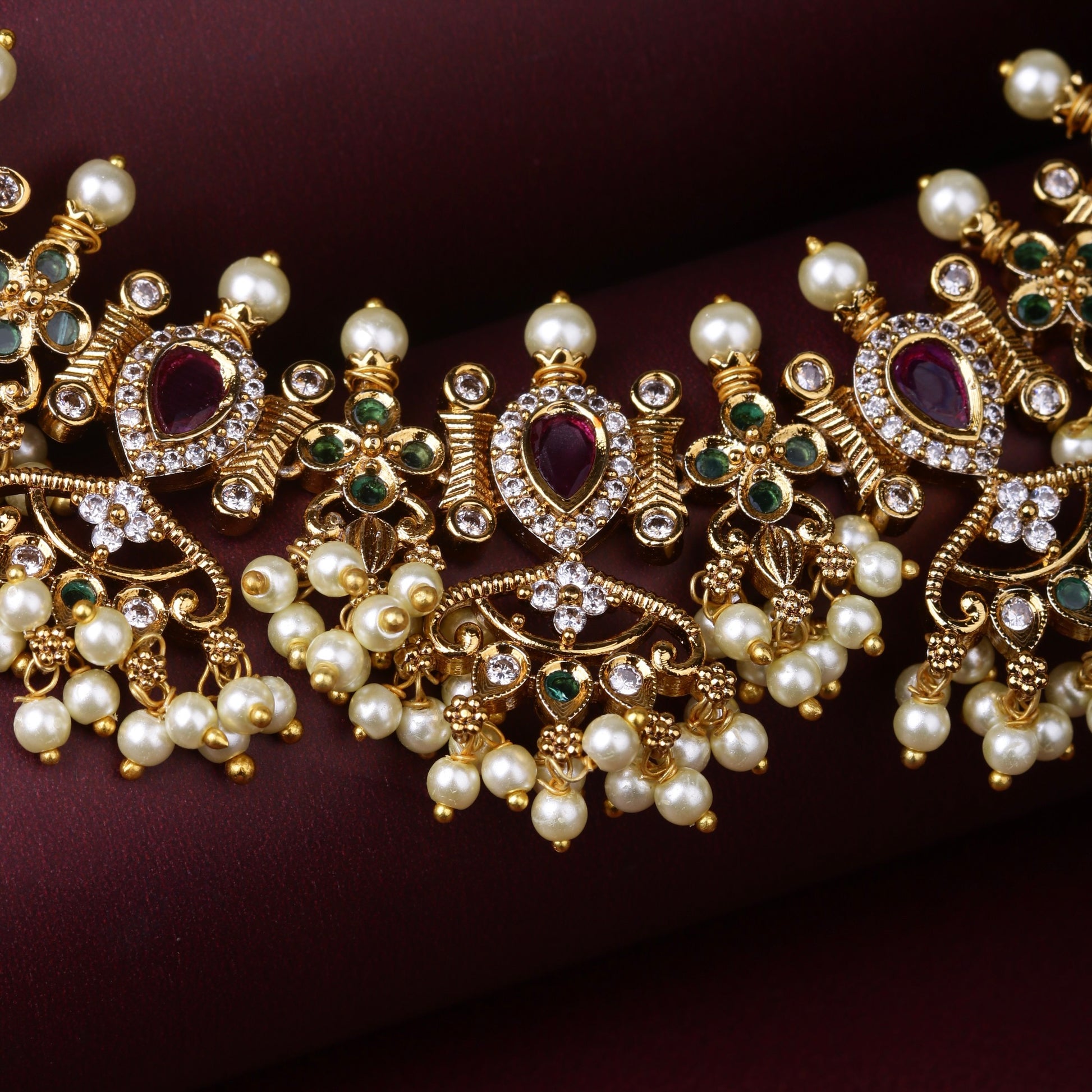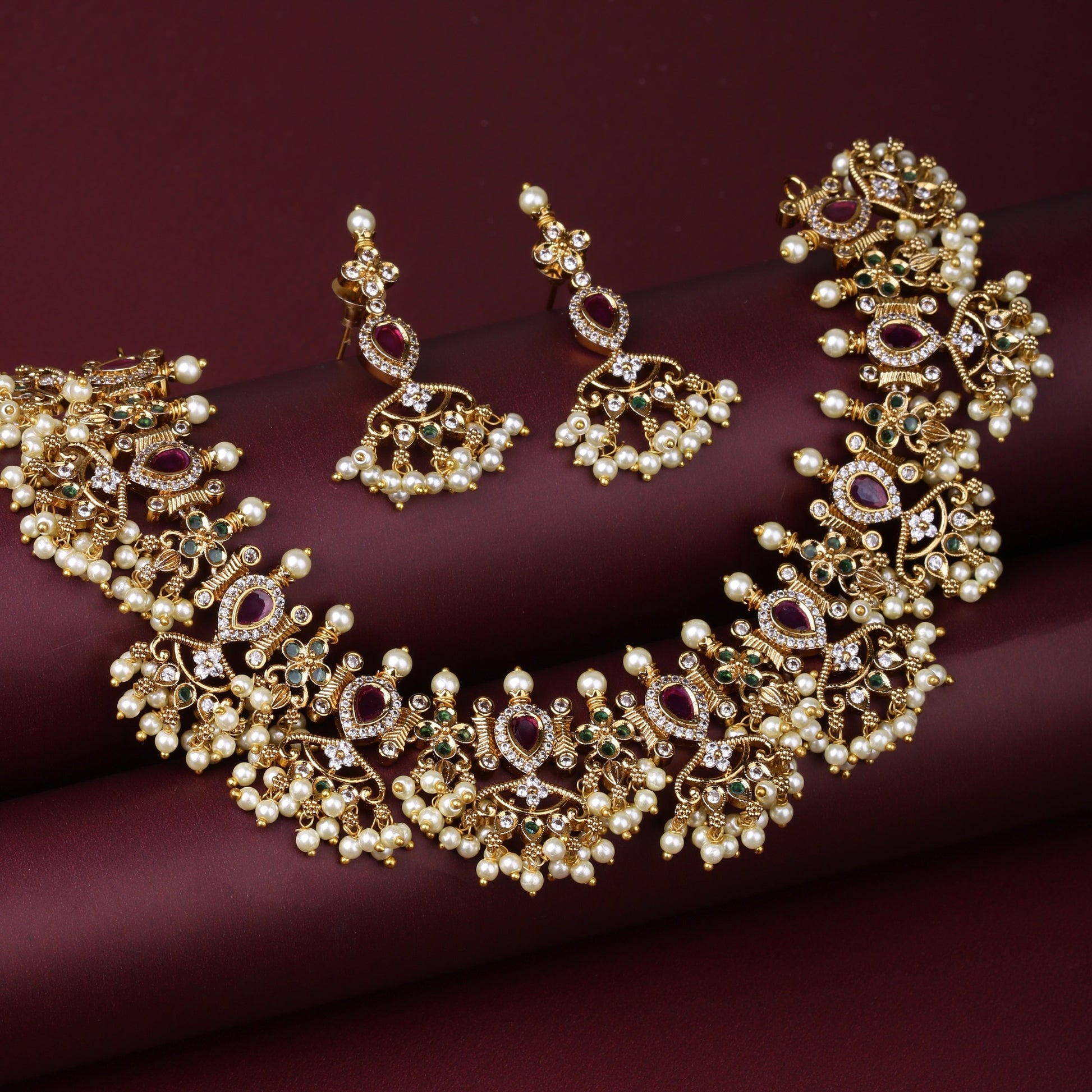 Drape yourself in regal elegance with our Noor-e-Nazakat Set, a perfect blend of traditional charm and intricate craftsmanship. Accentuated with rich ruby-colored stones, pearls, and delicate detailing, this set includes a choker-style necklace and 2.5-inch jhumka-style earrings — perfect for weddings, festive occasions, or formal soirées.