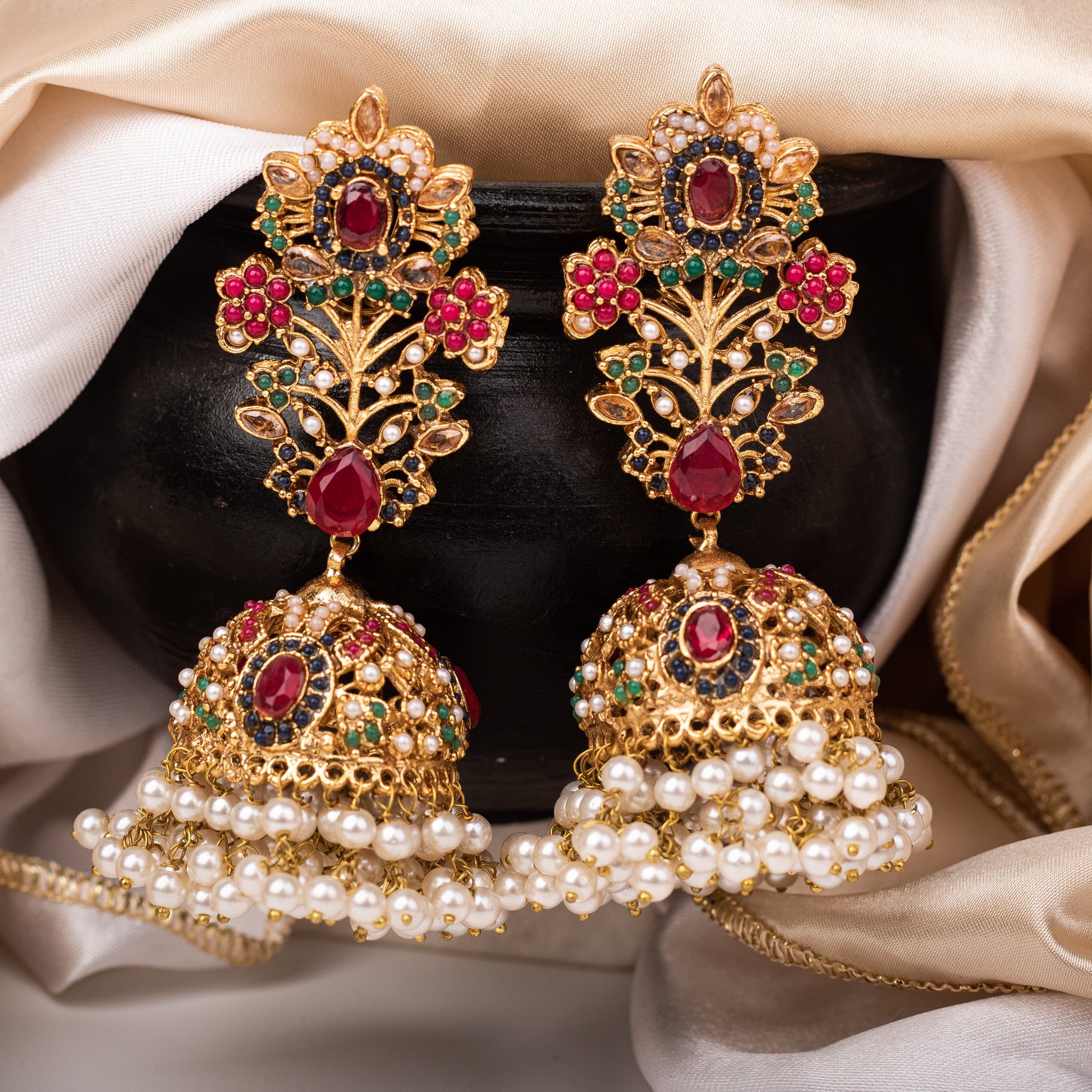 This stunningly beautiful Long Naurattan Jhumka is crafted to take you on a journey of elegance and grace! Designed with love from Riwaaj Jewels, it’s made for a charmer like you, adding a regal touch to your look.