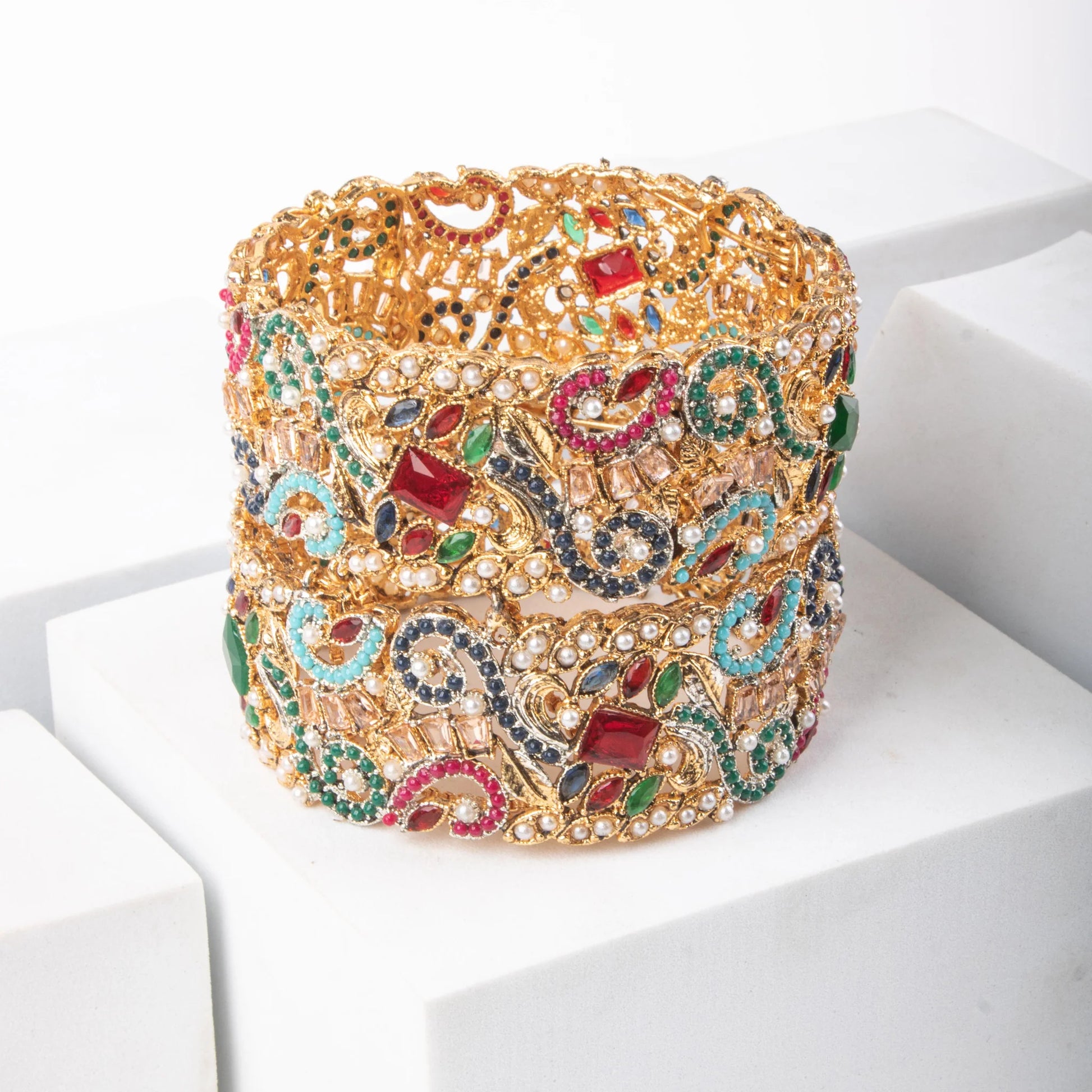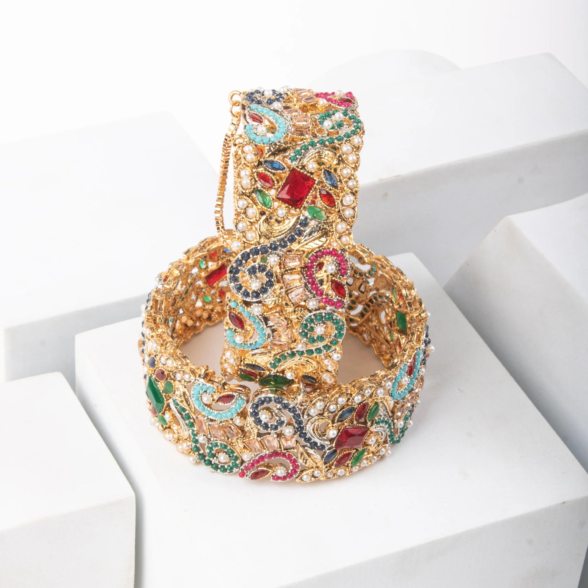 Experience the grandeur of tradition with our Royal Aura Bangles, exquisitely crafted to add a royal touch to your jewelry collection. These handmade openable bangles feature intricate Meenakari and Navratan work, beautifully adorned with vibrant stones. The delicate paisley motifs and fine detailing reflect the timeless charm of heritage craftsmanship.