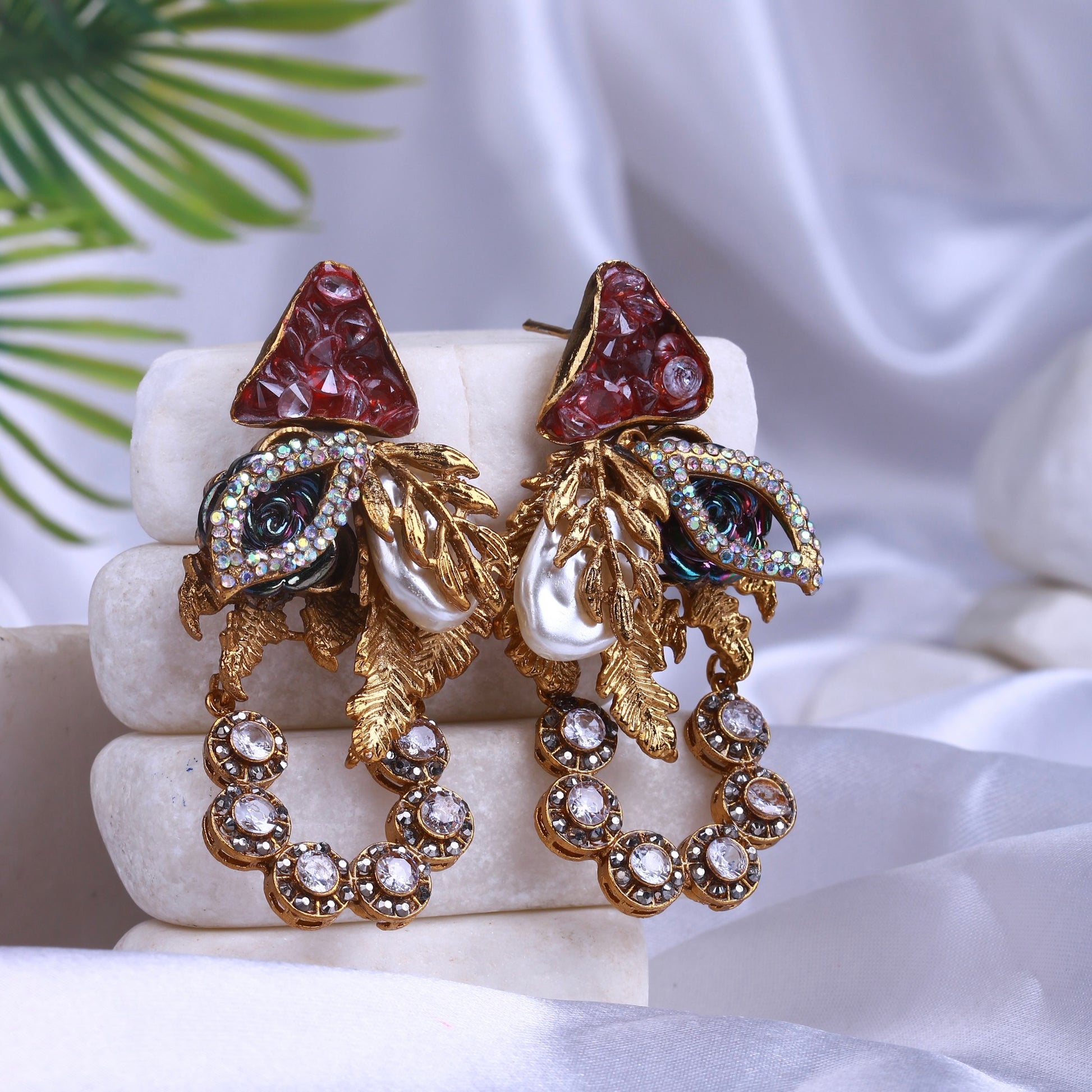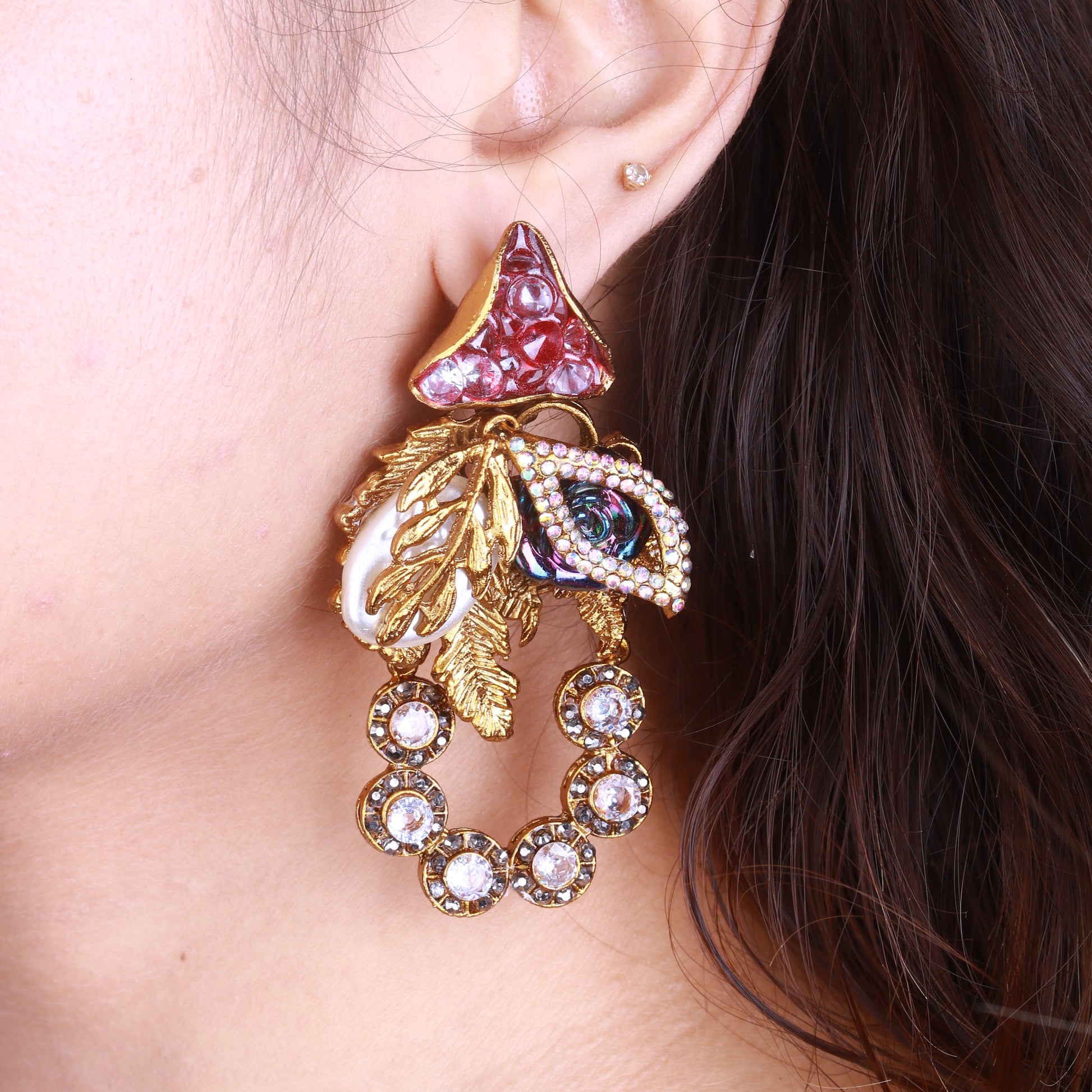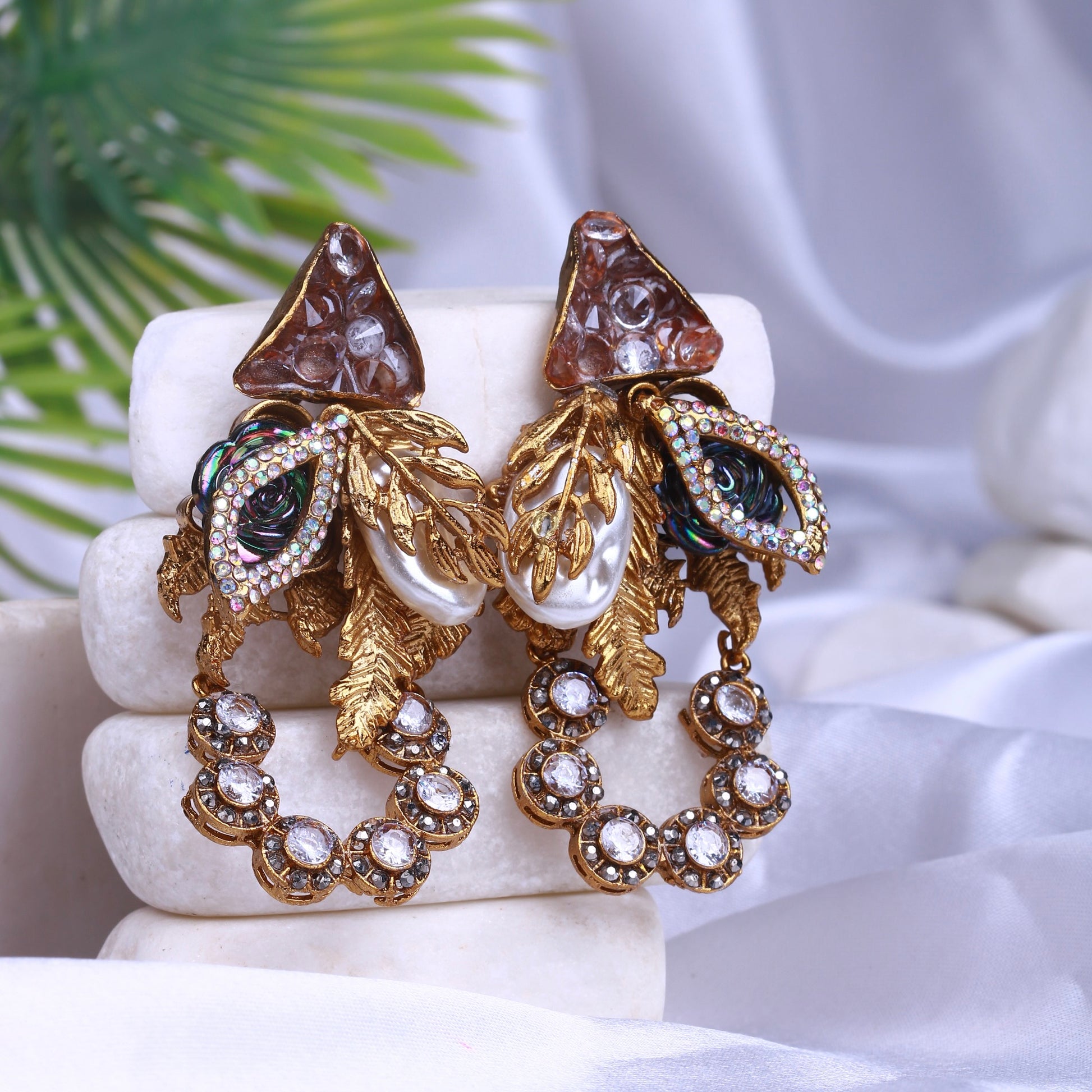 Make a bold statement with our Falak Antique Earrings. These stunning earrings are handmade with intricate peacock-inspired motifs, carved stones, and delicate pearl clusters. The unique design and elegant color palette make them perfect for both contemporary and traditional outfits. Finished with 22K Gold Polish for a regal finish.