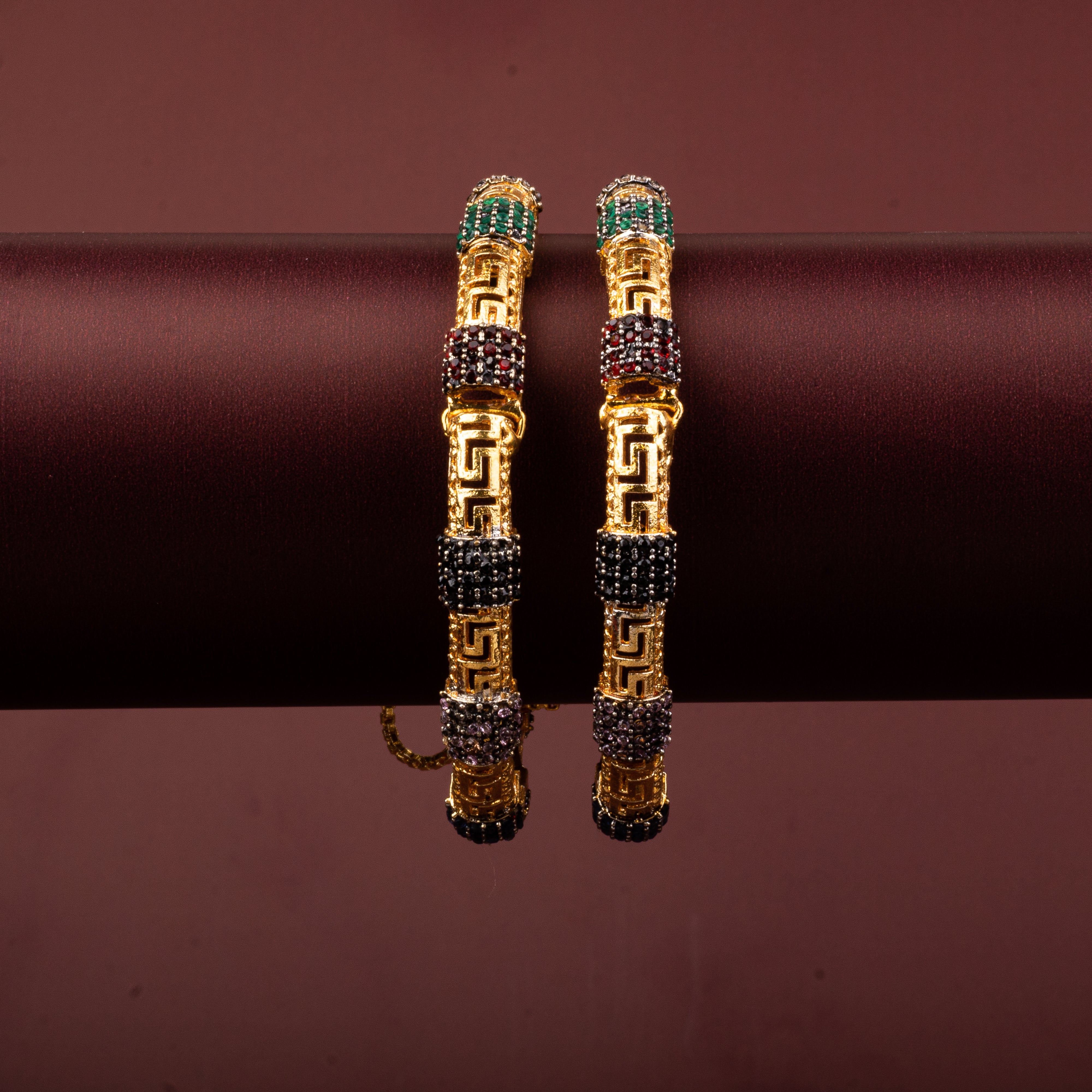 Elevate your jewelry collection with this stunning set of 22K Gold-Plated Bangles, featuring intricate detailing and vibrant colored stones that exude timeless elegance. Perfectly designed for festive occasions or everyday charm.