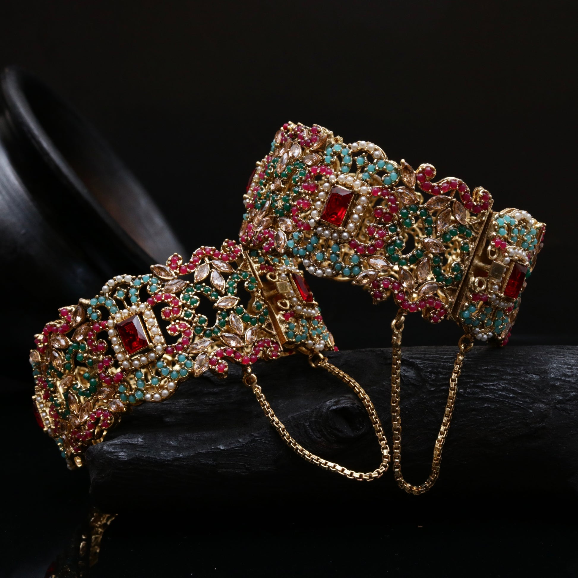 These stunning bangles are a true testament to elegance and craftsmanship. Adorned with vibrant semi-precious stones like turquoise, emerald, ruby, and sapphire, all set in a luxurious gold-plated frame, this piece offers an opulent touch to your collection.