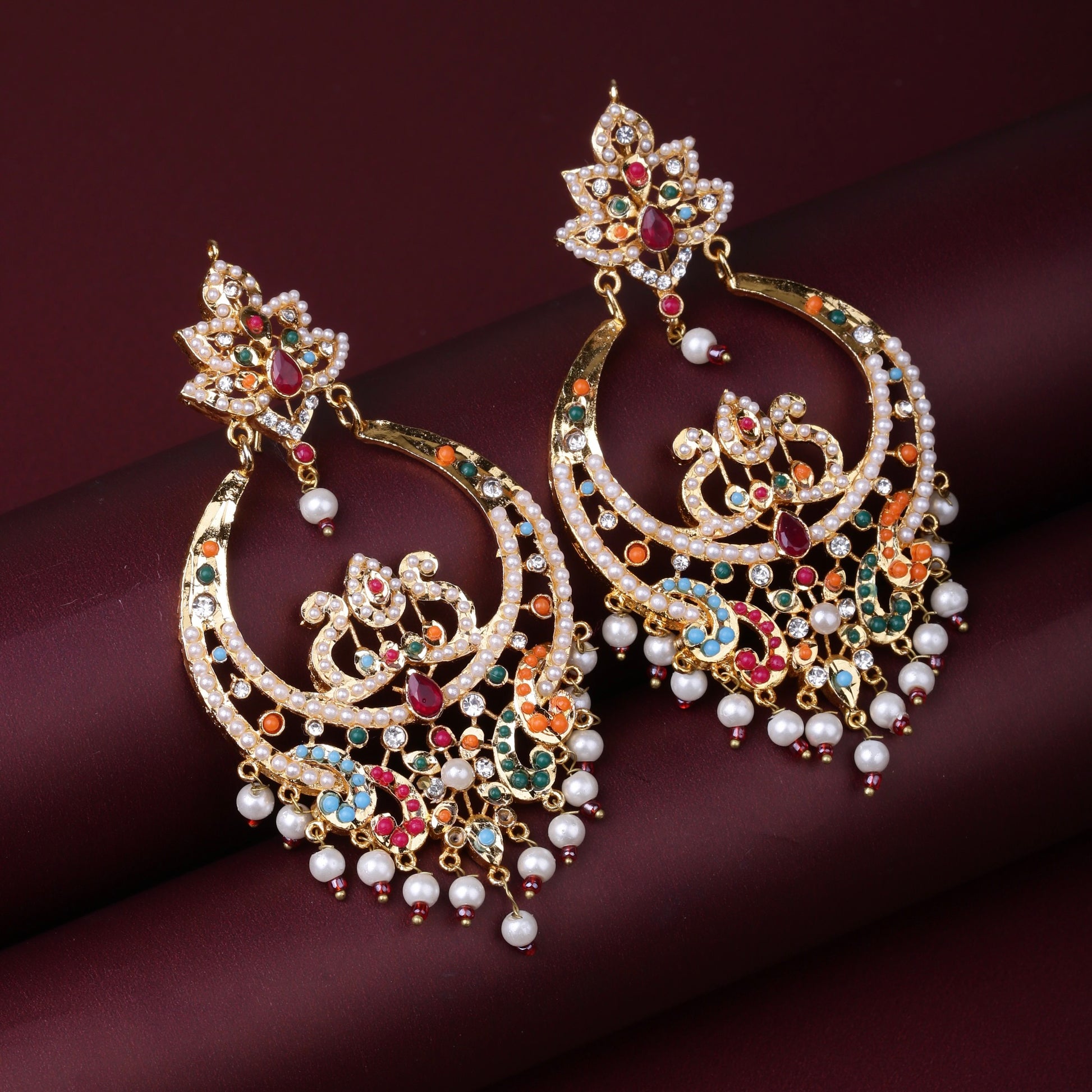 These luxurious earrings are adorned with the traditional Navratna (nine gems) arrangement, set in intricate handcrafted gold-tone metal. The detailed meenakari-style base, radiant colored stones, and dainty pearl hangings create a timeless ethnic charm — perfect for weddings, festivities, or heirloom-inspired looks.