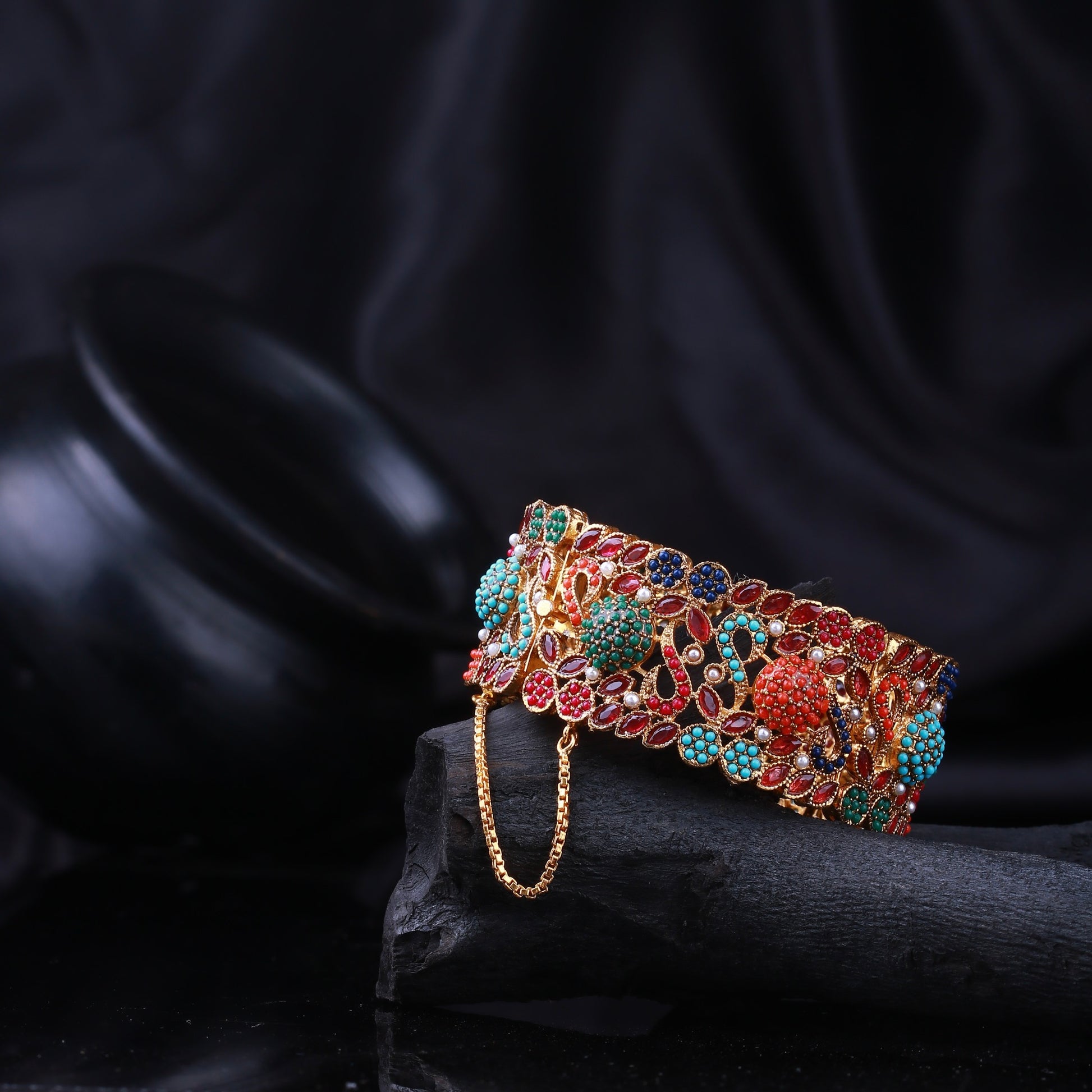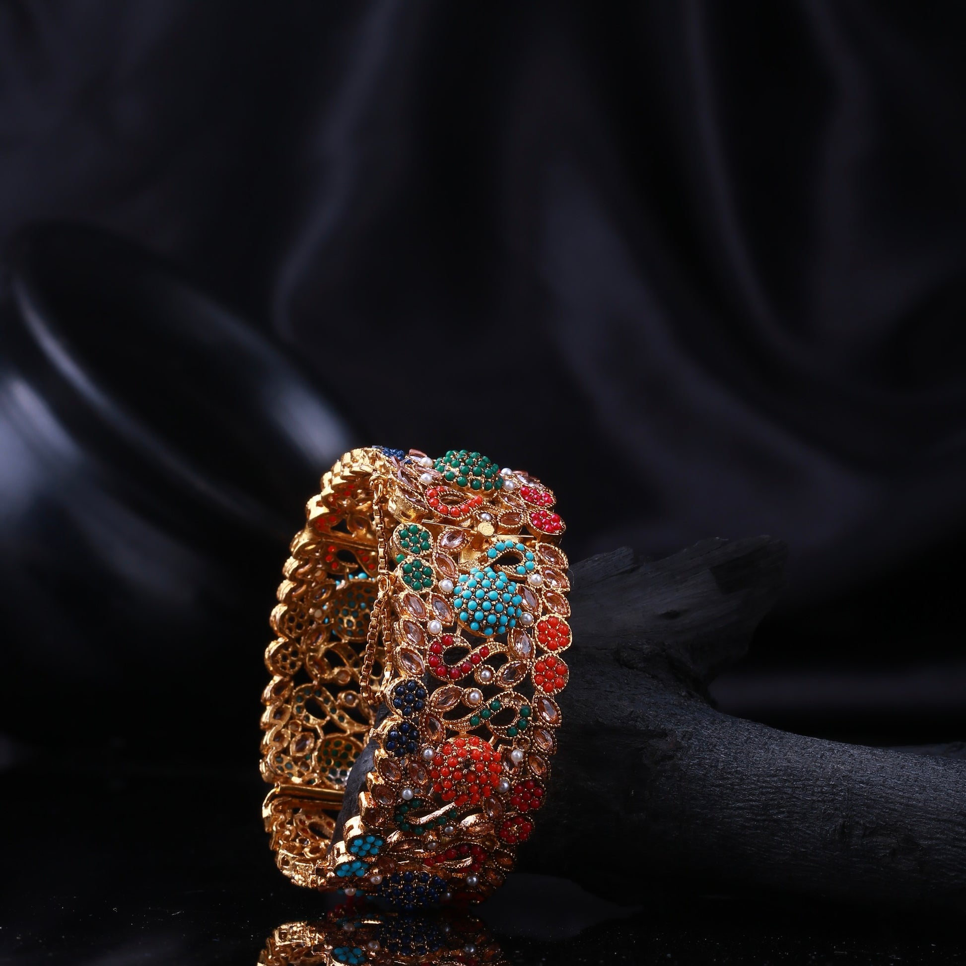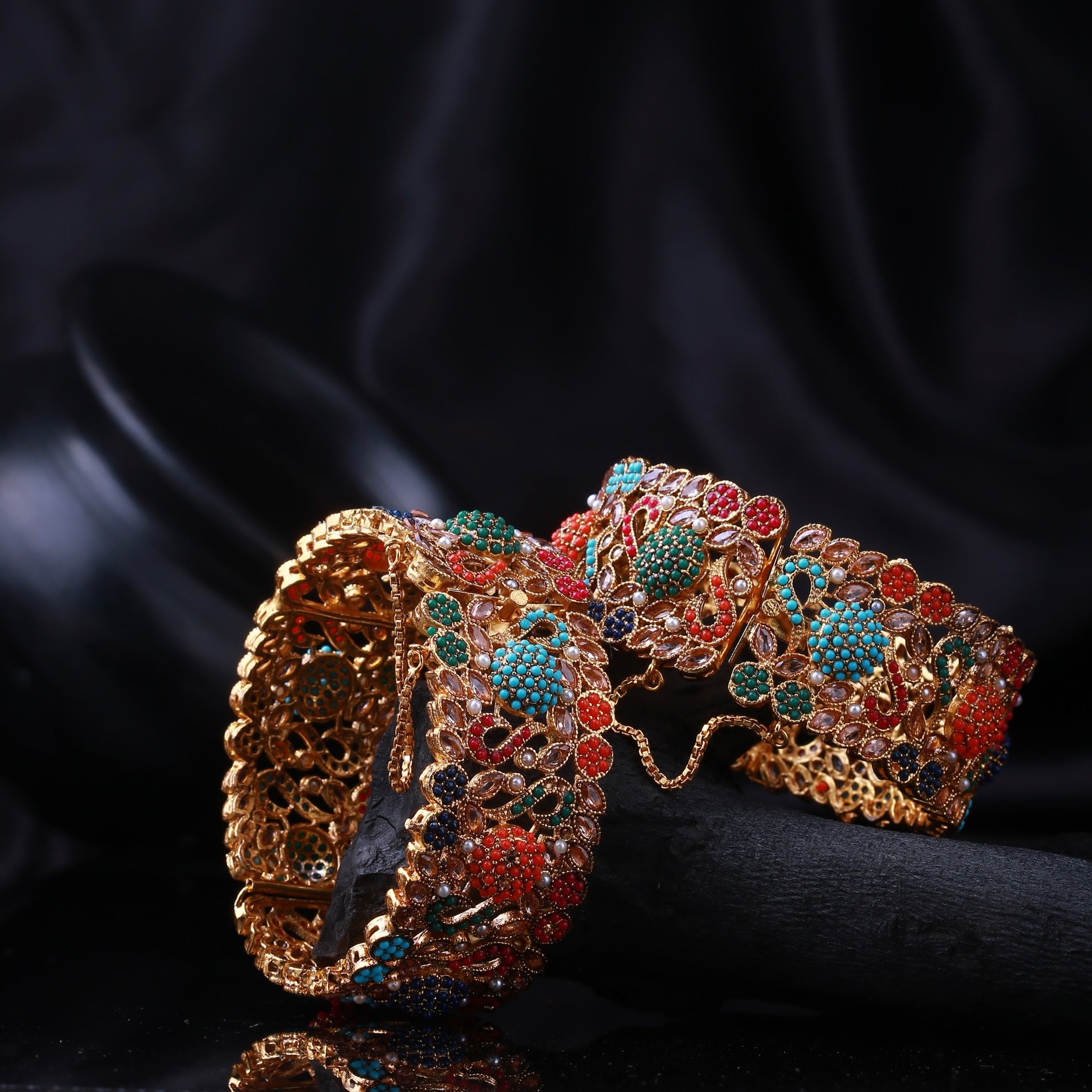 These stunning bangles are a true testament to elegance and craftsmanship. Adorned with vibrant semi-precious stones like turquoise, emerald, ruby, and sapphire, all set in a luxurious gold-plated frame, this piece offers an opulent touch to your collection.