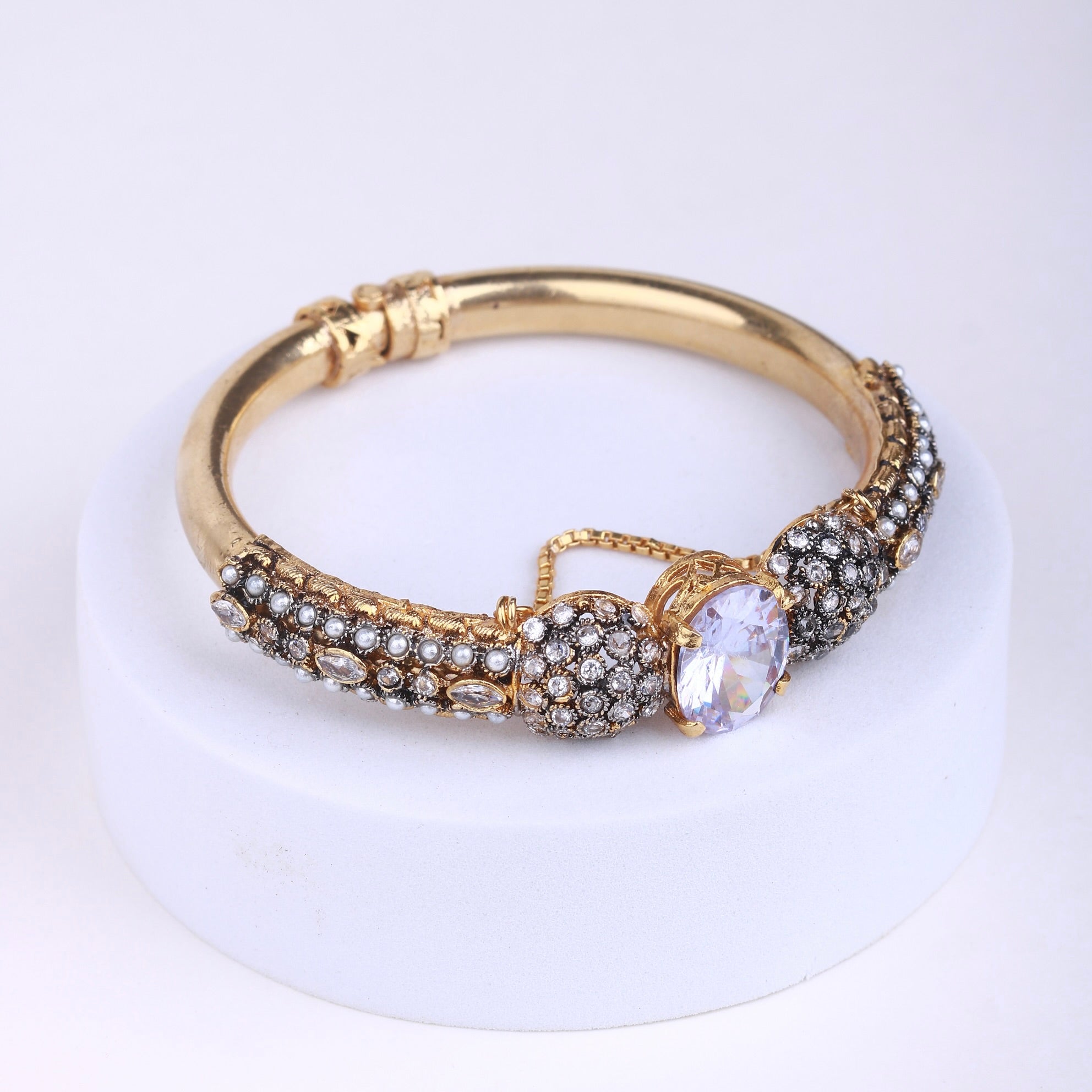 A jewel fit for a queen — Zirca Twilight Glow Openable Bangle is crafted with 100% handmade artistry and adorned with floral stonework and delicate chains. Finished in 22K gold polish, this stunning kara reflects the grandeur of tradition with the sparkle of elegance.