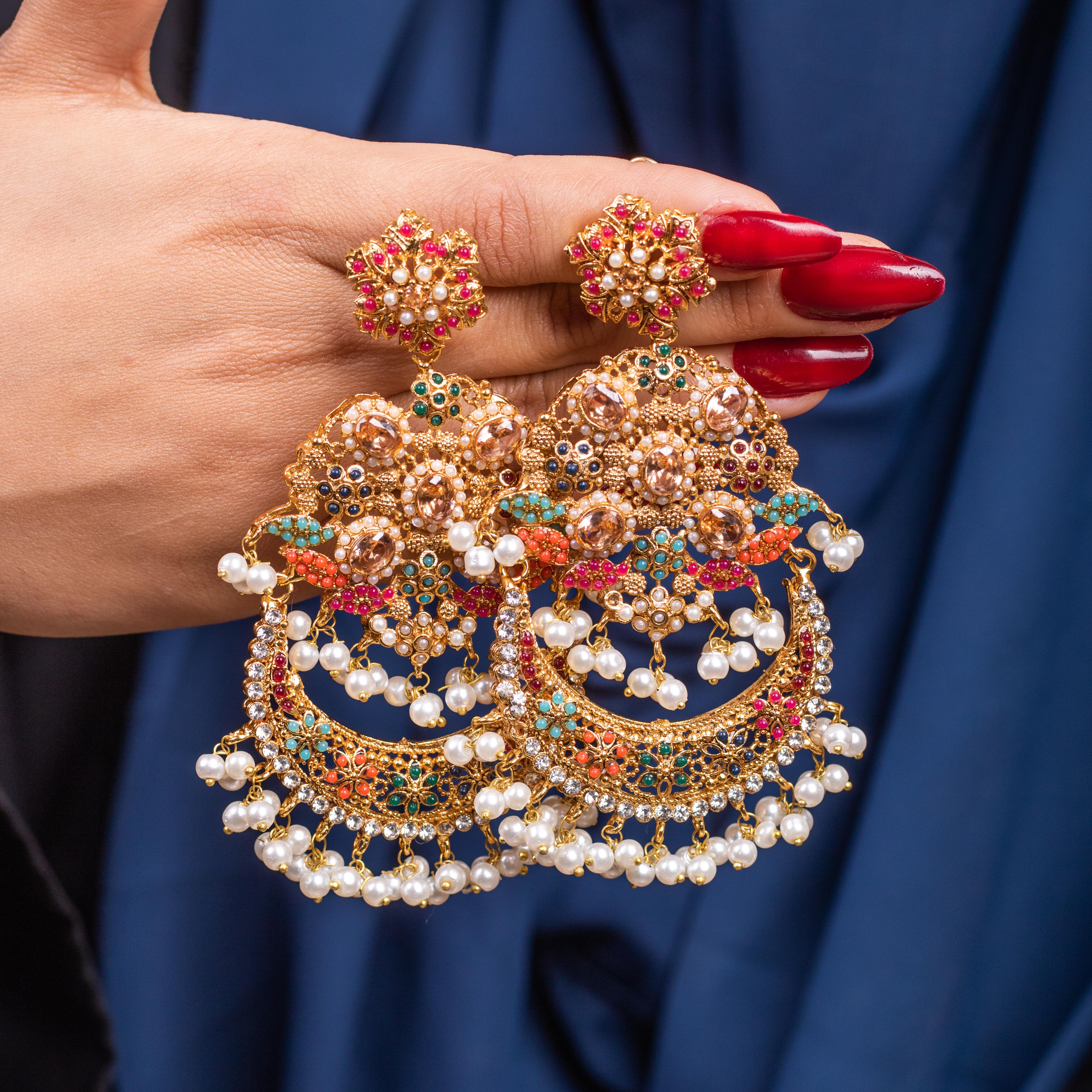 Add a touch of elegance with our stunning Naurattan Jhumkas, designed to captivate with their timeless beauty. These jhumkas feature cultured pearl hangings and are delicately studded with semi-precious rubies and emeralds, creating a royal aura.