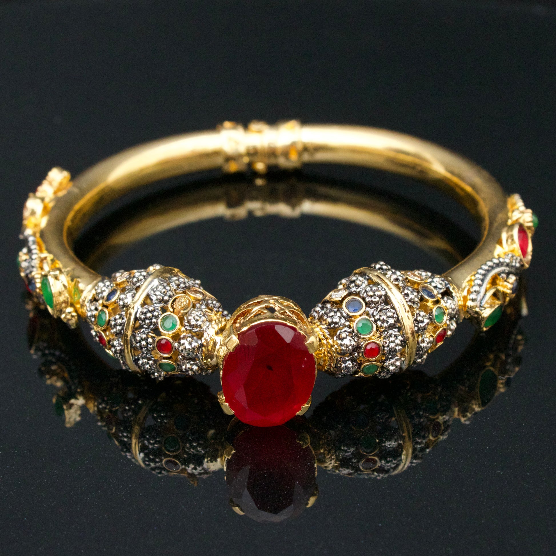 ✨ Material: Handmade with 22k gold-plated polish ✨ Centerpiece: A radiant gemstone centerpiece that adds a touch of royal allure ✨ Design: Adorned with multicolored stones for a vibrant and elegant look ✨ Size: Medium (2.6) - Fits easily up to 2.8 due to openable design ✨ Perfect for: Weddings, festive occasions, and special celebrations