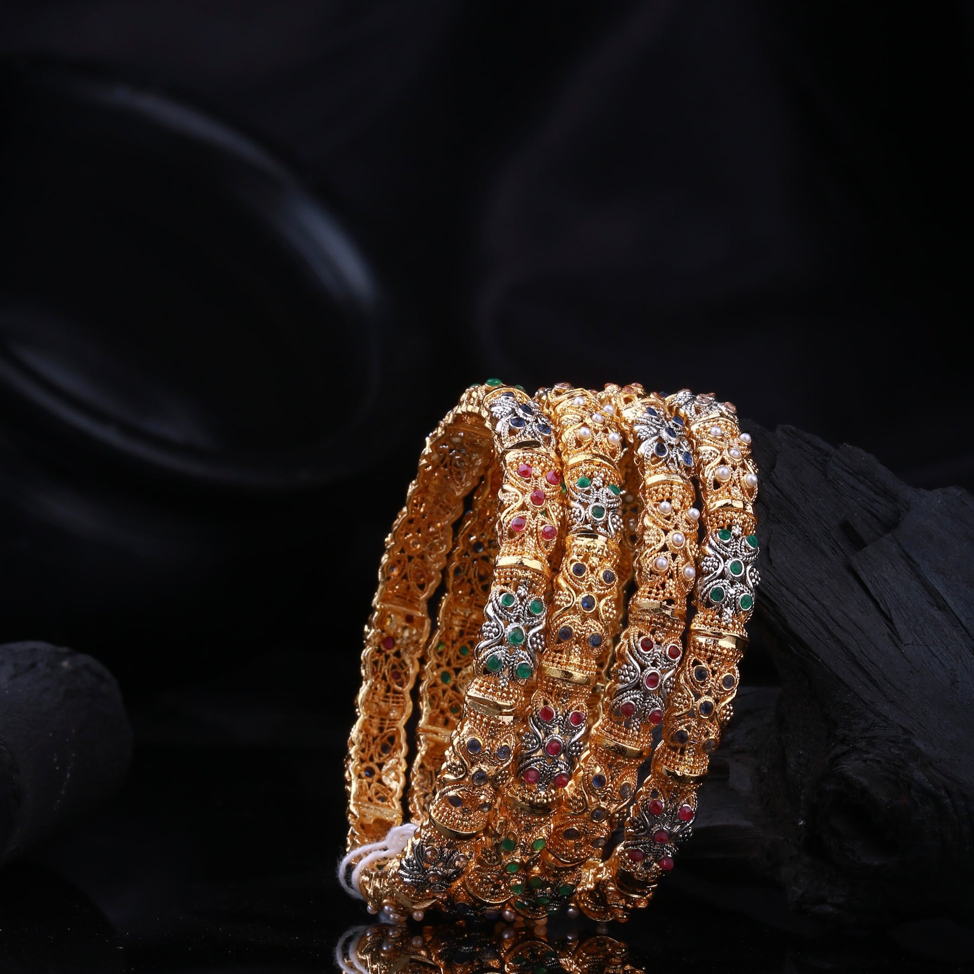 Enhance your traditional style with this beautifully detailed antique-finish multicolor bangles set. Featuring intricate floral designs studded with red, green, blue, and white stones, these bangles bring a royal charm to any outfit.