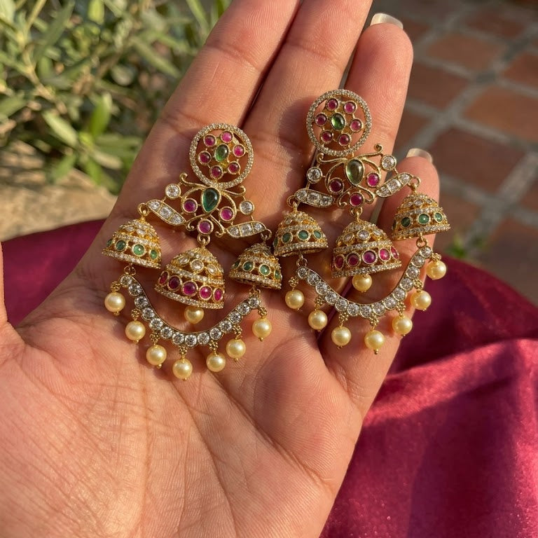 This stunning pair of traditional South Asian-style earrings is an opulent masterpiece designed to be the centerpiece of any ensemble. Crafted with a fusion of classic Chandbali (crescent) and Jhumka (bell-shaped drop) styles, this design is a breathtaking celebration of traditional craftsmanship.