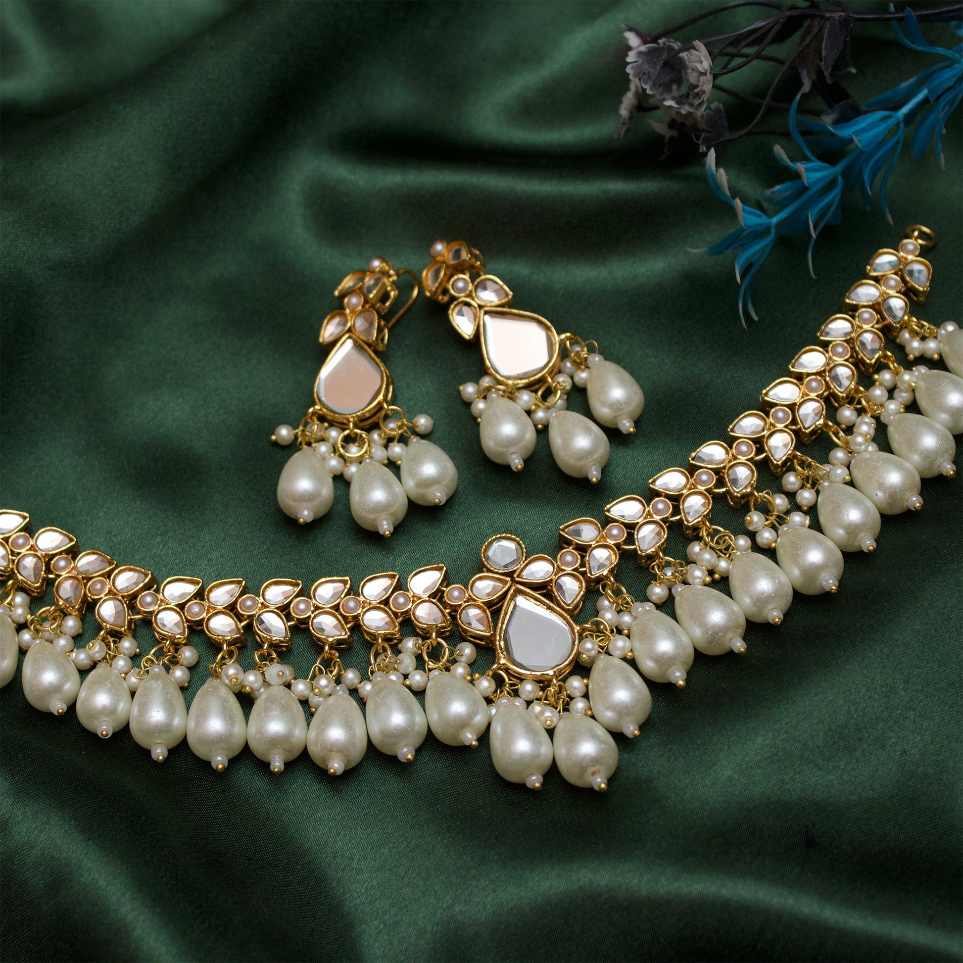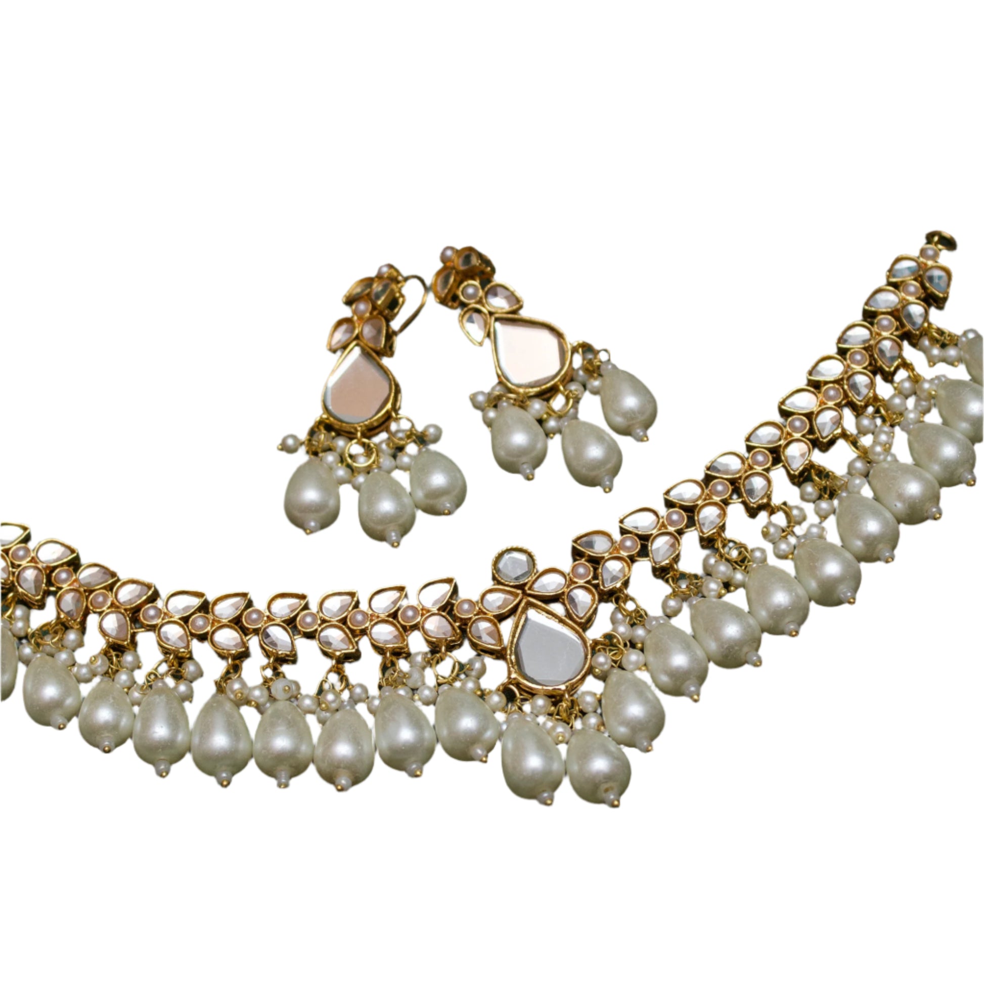 The choker is embellished with floral motifs and teardrop-shaped mirrors, accented by rows of ivory pearl hangings that sway gracefully with every movement. Paired with it are matching earrings, approximately 1.5 inches in length, designed to complement the choker perfectly without overpowering your look.