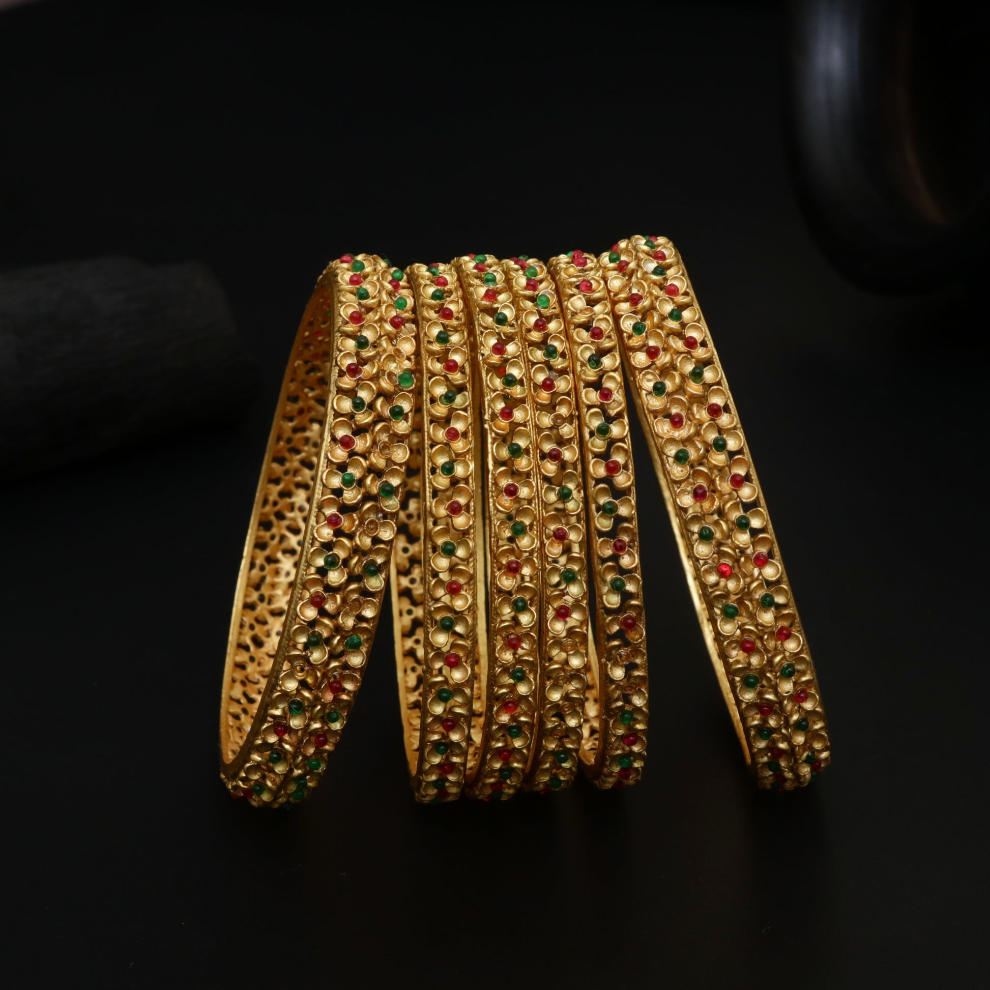 Add timeless elegance to your ensemble with this stunning set of gold-plated bangles. Featuring intricate patterns and a radiant finish, these bangles beautifully complement both traditional and modern outfits.