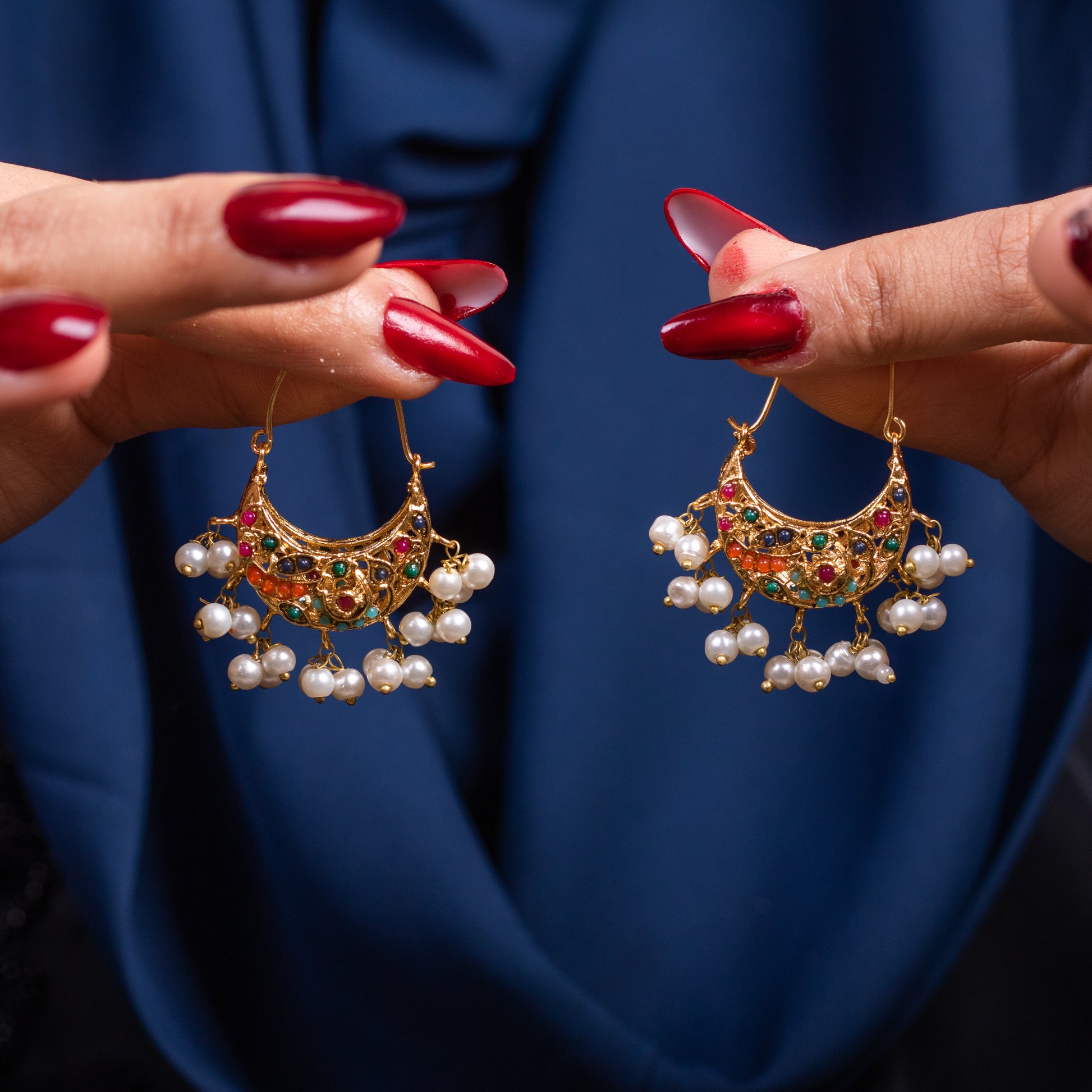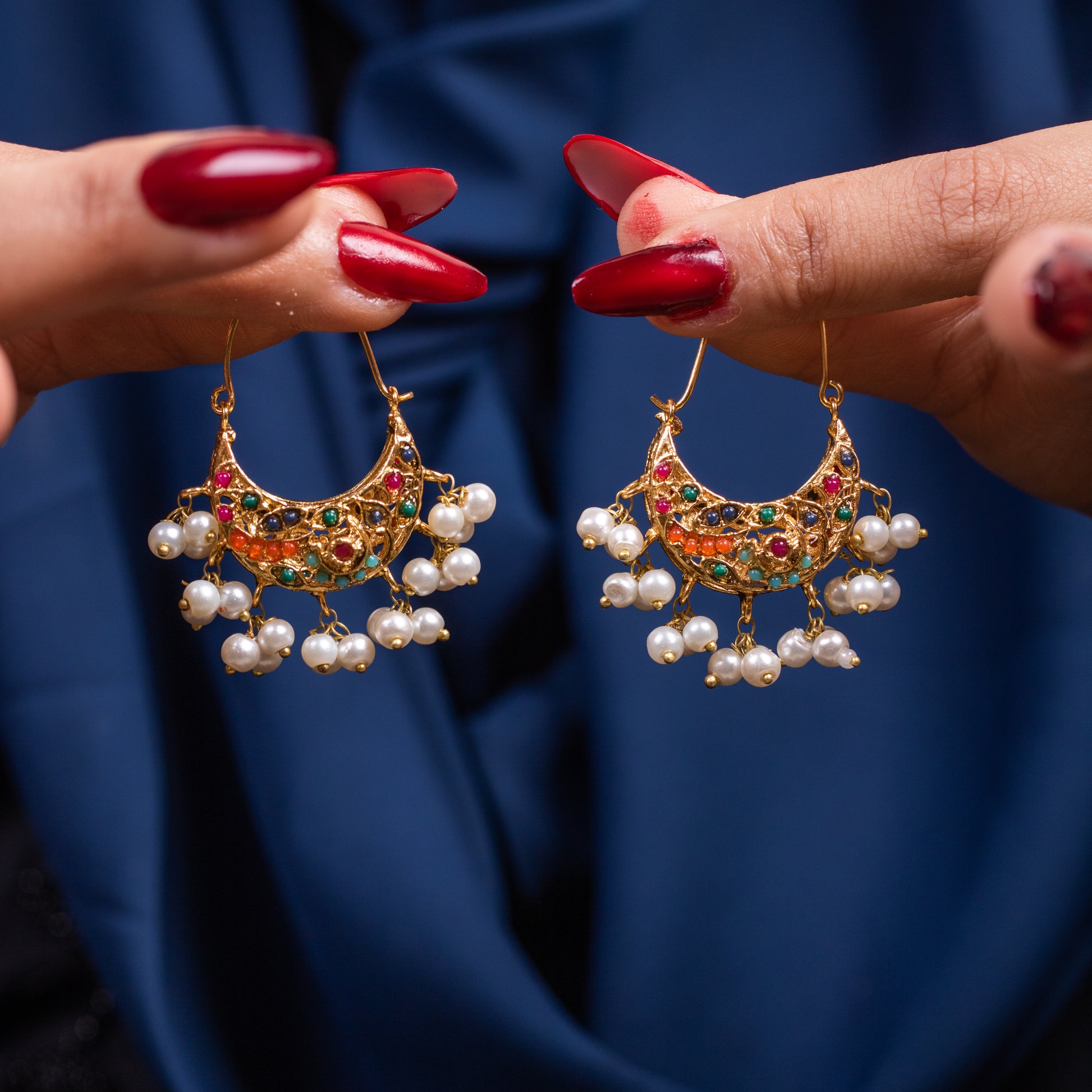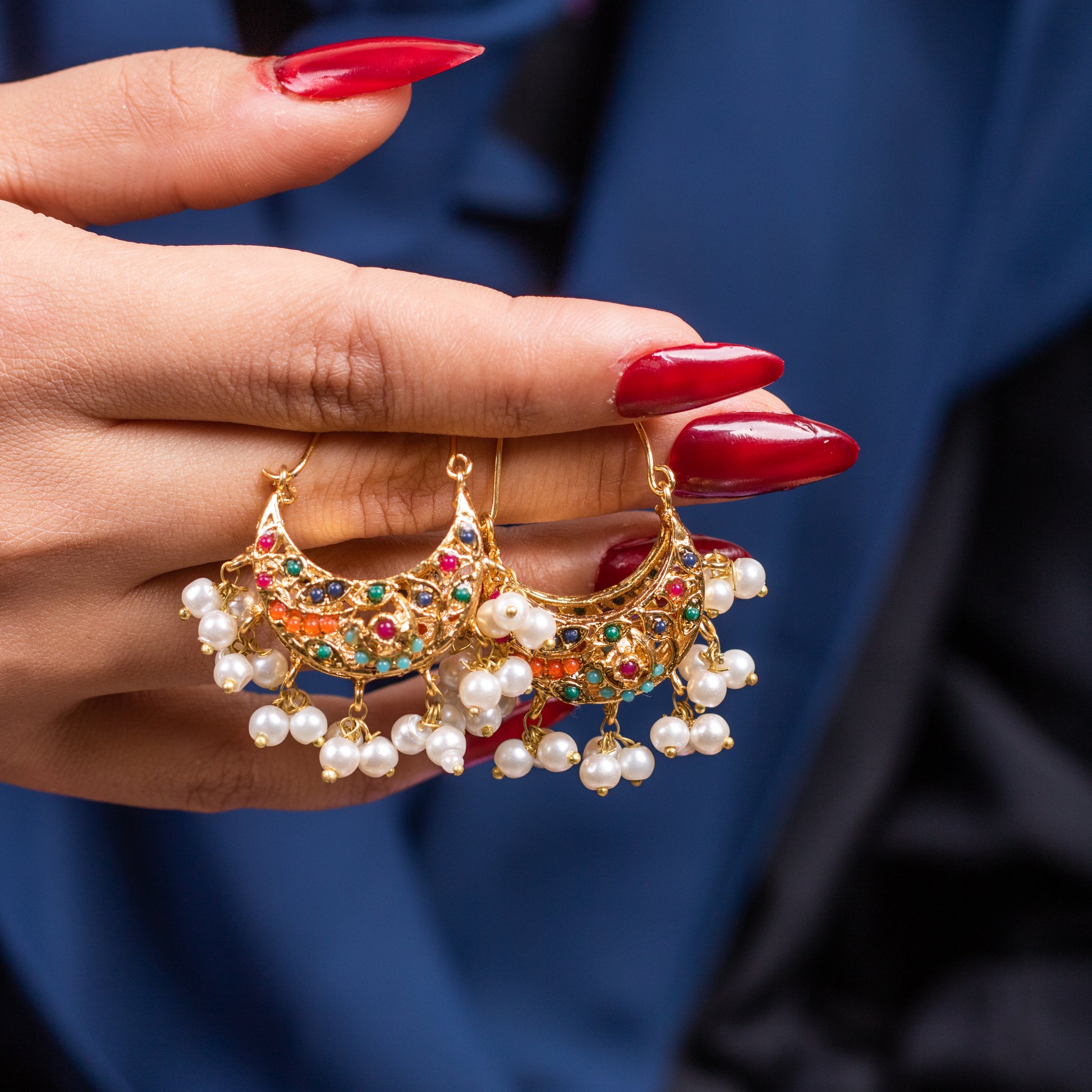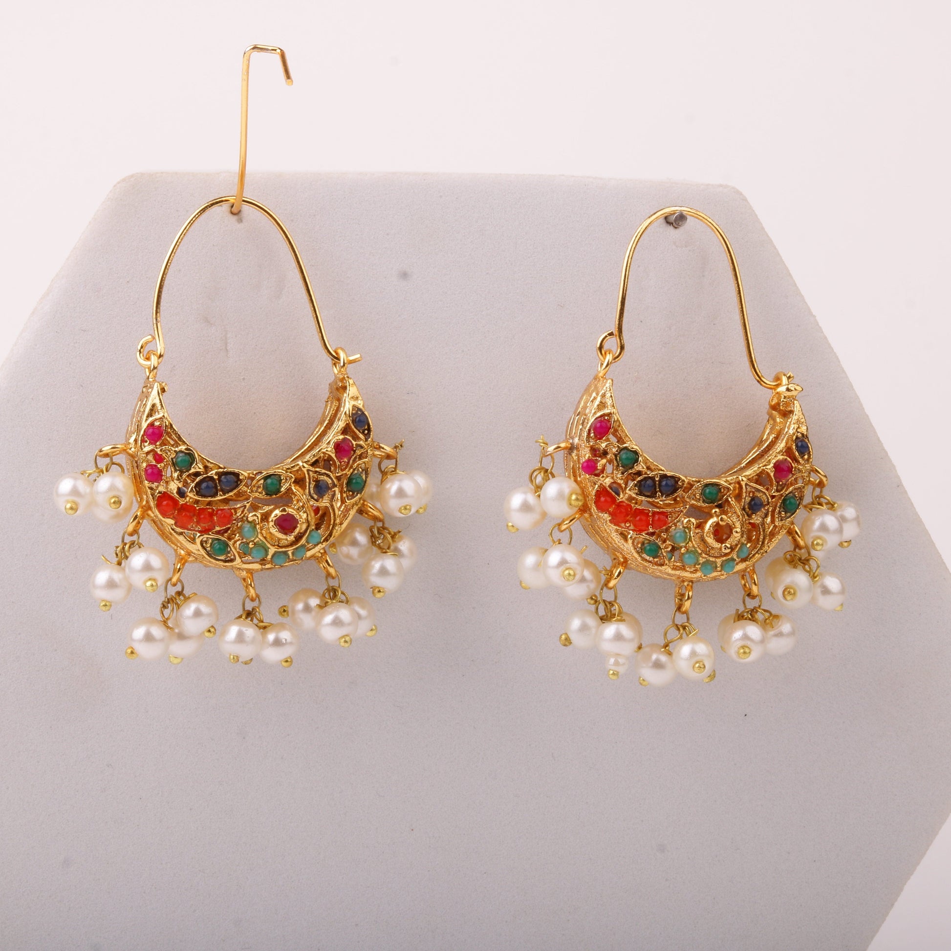 Enhance your ethnic look with these exquisite Multicolor Pearl Chandbali, featuring a beautiful blend of vibrant Navratna stones and delicate pearls. Crafted with intricate detailing and finished in 22K Gold Polish, these earrings exude elegance and tradition. Their lightweight design makes them perfect for all-day wear while adding a regal charm to any outfit.