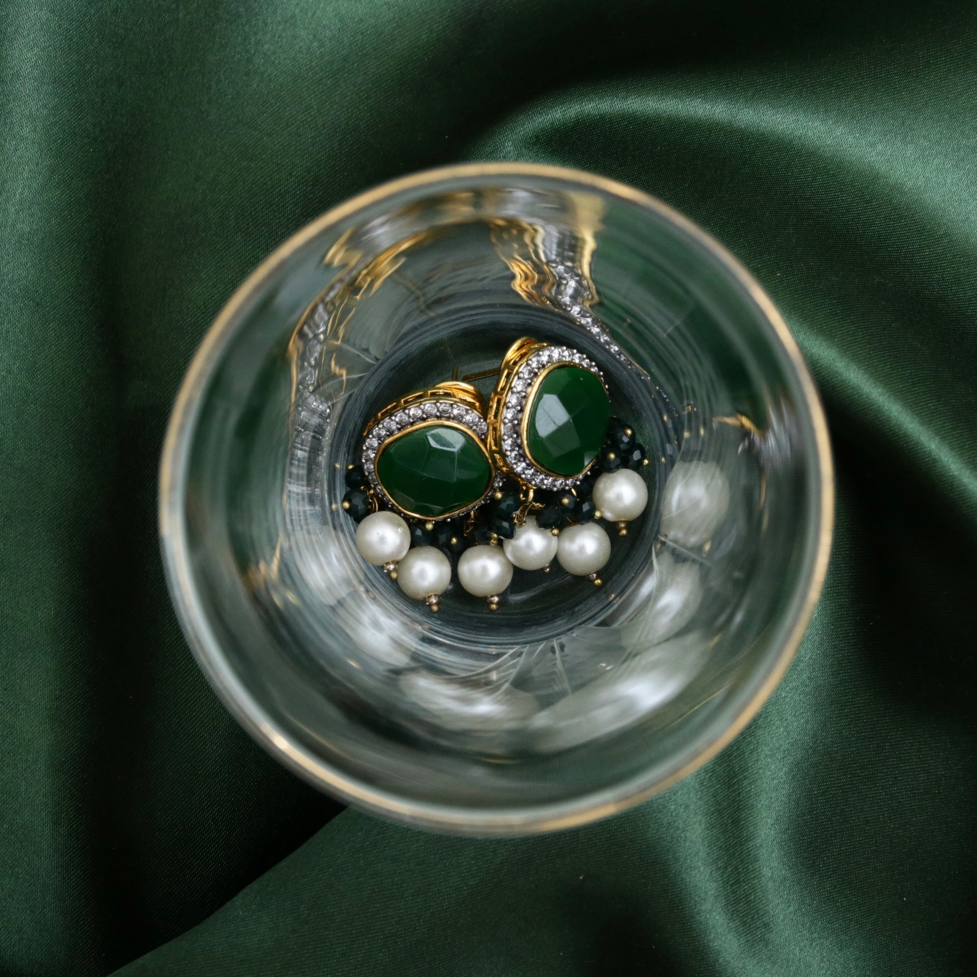 Elegant 1-inch earrings, 22K gold plated with a faceted stone center, pearl drops, and bead detailing. Perfect for festive and traditional looks. Available in multiple colors.