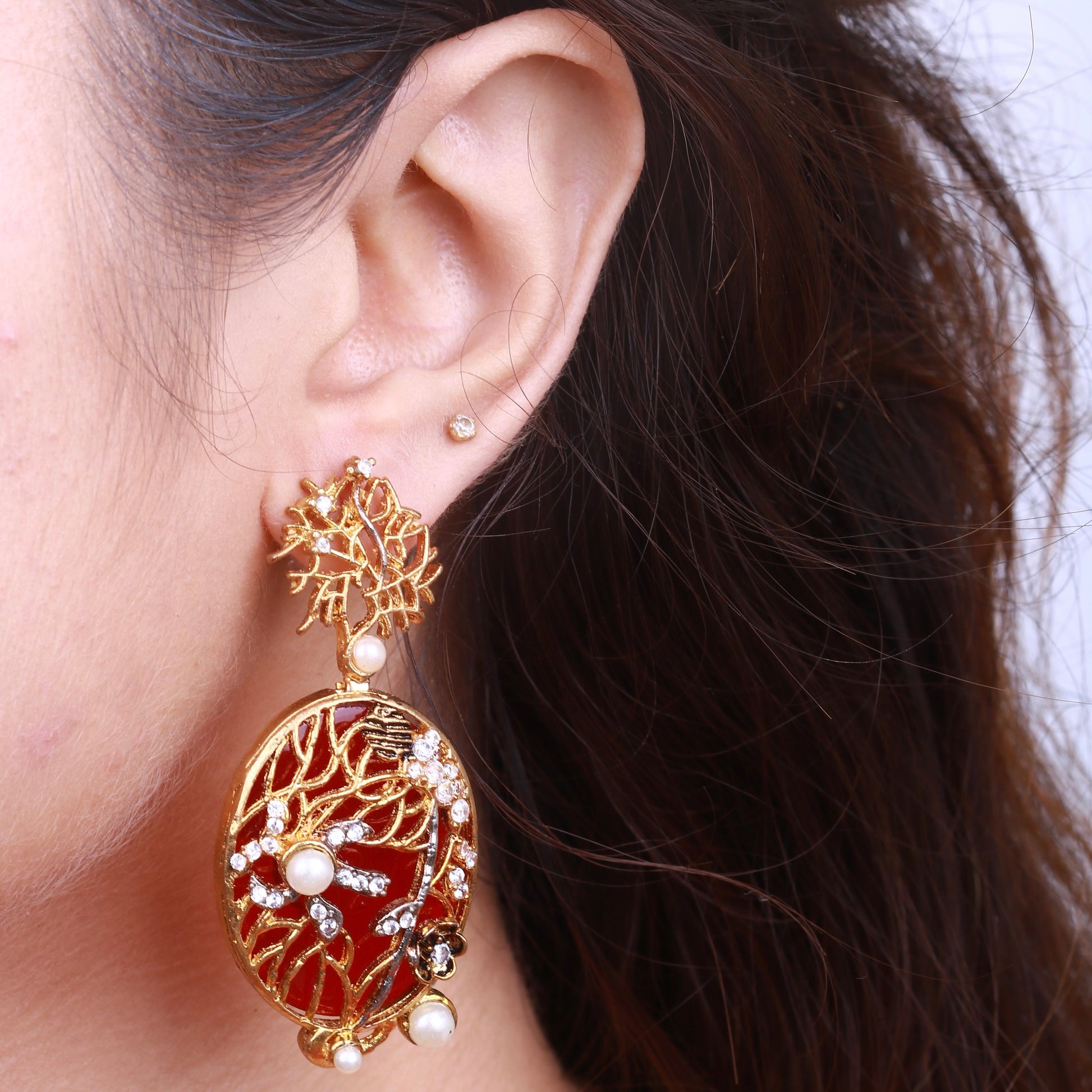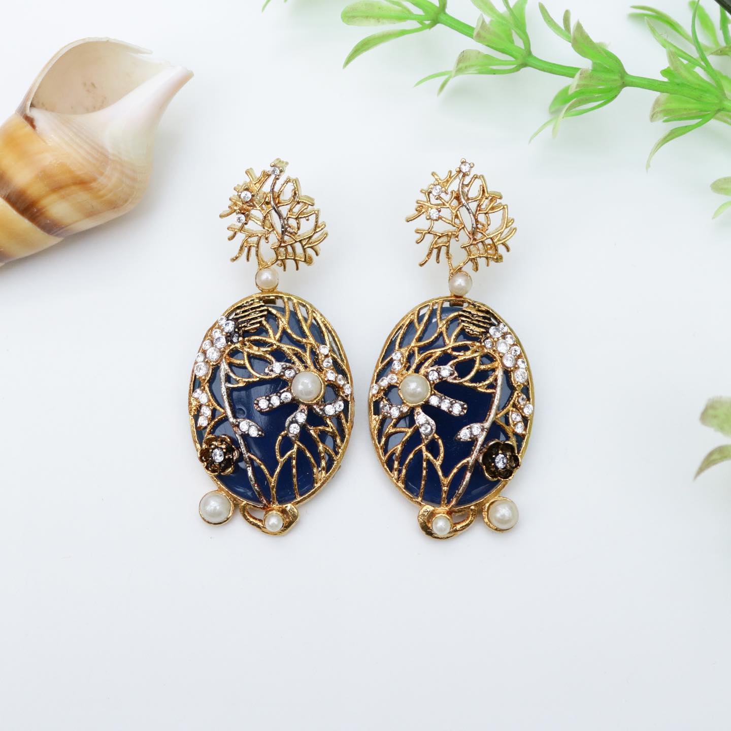 Statement 2.5-inch earrings, 22K gold plated with intricate tree-inspired design, pearls, and sparkling stones over a colorful enamel base. Available in multiple elegant shades—perfect for festive and formal wear.