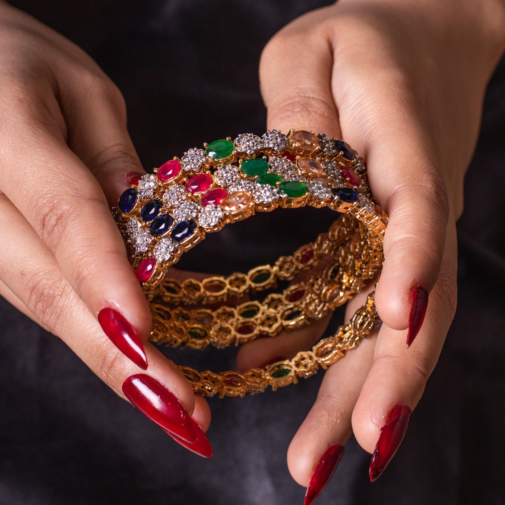 Experience the grandeur of tradition with our Shahi Kangan Multi, exquisitely crafted to add a royal touch to your jewelry collection. These handmade bangles feature intricate Meenakari and Navratan work, beautifully adorned with vibrant stones. The delicate paisley motifs and fine detailing reflect the timeless charm of heritage craftsmanship.